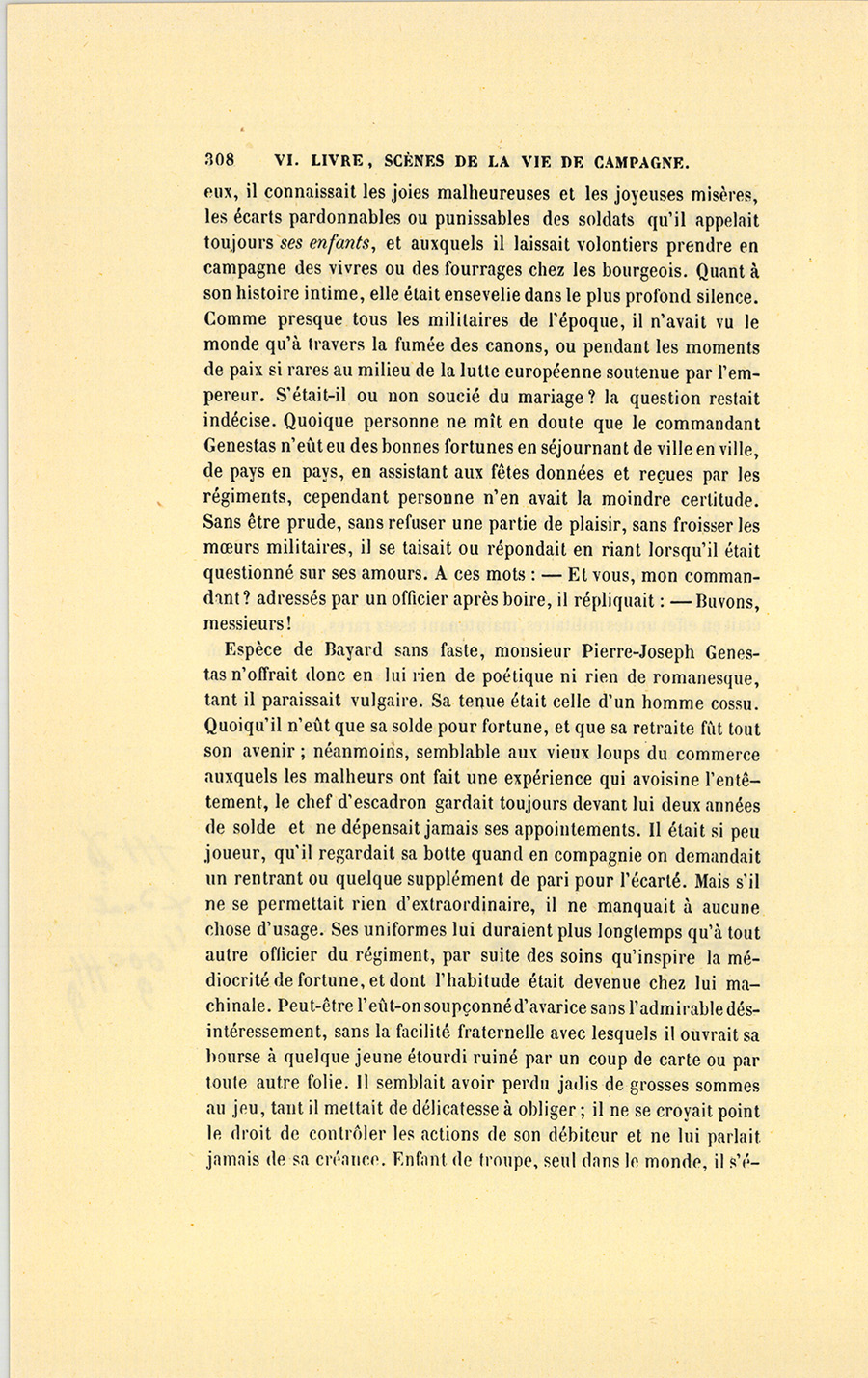 Homme de haute taille, le voyageur était entièrement vêtu de drap bleu aussi soigneusement brossé que devait l’être chaque matin son cheval au poil lisse, sur lequel il se tenait droit et vissé comme un vieil officier de cavalerie. Si déjà sa cravate noire et ses {p. 307} gants de daim, si les pistolets qui grossissaient ses fontes, et le portemanteau bien attaché sur la croupe de son cheval, n’eussent indiqué le militaire, sa figure brune marquée de petite-vérole, mais régulière et empreinte d’une insouciance apparente, ses manières décidées, la sécurité de son regard, le port de sa tête, tout aurait trahi ces habitudes régimentaires qu’il est impossible au soldat de jamais dépouiller, même après être rentré dans la vie domestique. Tout autre se serait émerveillé des beautés de cette nature alpestre, si riante au lieu où elle se fond dans les grands bassins de la France ; mais l’officier, qui sans doute avait parcouru les pays où les armées françaises furent emportées par les guerres impériales, jouissait de ce paysage sans paraître surpris de ces accidents multipliés. L’étonnement est une sensation que Napoléon semble avoir détruite dans l’âme de ses soldats. Aussi le calme de la figure est-il un signe certain auquel un observateur peut reconnaître les hommes jadis enrégimentés sous les aigles éphémères mais impérissables du grand empereur. Cet homme était en effet un des militaires, maintenant assez rares, que le boulet a respectés, quoiqu’ils aient labouré tous les champs de bataille où commanda Napoléon. Sa vie n’avait rien d’extraordinaire. Il s’était bien battu en simple et loyal soldat, faisant son devoir pendant la nuit aussi bien que pendant le jour, loin comme près du maître, ne donnant pas un coup de sabre inutile, et incapable d’en donner un de trop. S’il portait à sa boutonnière la rosette appartenant aux officiers de la Légion d’honneur, c’est qu’après la bataille de la Moskowa la voix unanime de son régiment l’avait désigné comme le plus digne de la recevoir dans cette grande journée. Du petit nombre de ces hommes froids en apparence, timides, toujours en paix avec eux-mêmes, dont la conscience est humiliée par la seule pensée d’une sollicitation à faire, de quelque nature qu’elle soit, ses grades lui furent conférés en vertu des lentes lois de l’ancienneté. Devenu sous-lieutenant en 1802, il se trouvait seulement chef d’escadron en 1829, malgré ses moustaches grises ; mais sa vie était si pure que nul homme de l’armée, fût-il général, ne l’abordait sans éprouver un sentiment de respect involontaire, avantage incontesté que peut-être ses supérieurs ne lui pardonnaient point. En récompense, les simples soldats lui vouaient tous un peu de ce sentiment que les enfants portent à une bonne mère ; car, pour eux, il savait être à la fois indulgent et sévère. Jadis soldat comme {p. 308} eux, il connaissait les joies malheureuses et les joyeuses misères, les écarts pardonnables ou punissables des soldats qu’il appelait toujours ses enfants, et auxquels il laissait volontiers prendre en campagne des vivres ou des fourrages chez les bourgeois. Quant à son histoire intime, elle était ensevelie dans le plus profond silence. Comme presque tous les militaires de l’époque, il n’avait vu le monde qu’à travers la fumée des canons, ou pendant les moments de paix si rares au milieu de la lutte européenne soutenue par l’empereur. S’était-il ou non soucié du mariage ? la question restait indécise. Quoique personne ne mît en doute que le commandant Genestas n’eût eu des bonnes fortunes en séjournant de ville en ville, de pays en pays, en assistant aux fêtes données et reçues par les régiments, cependant personne n’en avait la moindre certitude. Sans être prude, sans refuser une partie de plaisir, sans froisser les mœurs militaires, il se taisait ou répondait en riant lorsqu’il était questionné sur ses amours. À ces mots : – Et vous, mon commandant ? adressés par un officier après boire, il répliquait : – Buvons, messieurs !