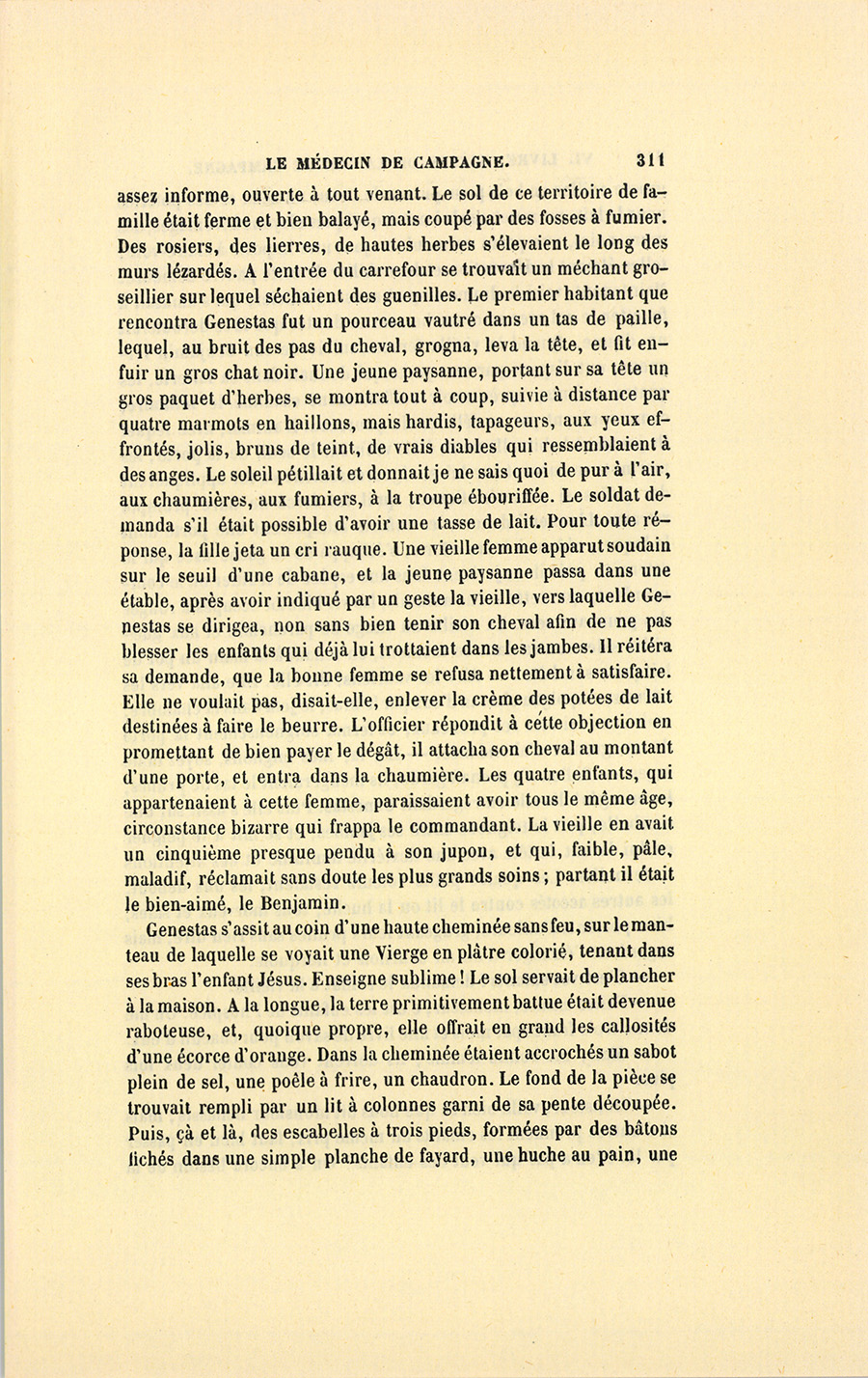 Cet officier, à qui sa prudence acquise ne laissait faire aucune démarche inutile, venait de quitter Grenoble et se dirigeait vers la Grande-Chartreuse, après avoir obtenu la veille de son colonel un congé de huit jours. Il ne comptait pas faire une longue traite ; mais, trompé de lieue en lieue par les dires mensongers des paysans qu’il interrogeait, il crut prudent de ne pas s’engager plus loin sans se réconforter l’estomac. Quoiqu’il eût peu de chances de rencontrer une ménagère en son logis par un temps où chacun s’occupe aux champs, il s’arrêta devant quelques chaumières qui aboutissaient à un espace commun, en décrivant une place carrée {p. 311} assez informe, ouverte à tout venant. Le sol de ce territoire de famille était ferme et bien balayé, mais coupé par des fosses à fumier. Des rosiers, des lierres, de hautes herbes s’élevaient le long des murs lézardés. À l’entrée du carrefour se trouvait un méchant groseillier sur lequel séchaient des guenilles. Le premier habitant que rencontra Genestas fut un pourceau vautré dans un tas de paille, lequel, au bruit des pas du cheval, grogna, leva la tête, et fit enfuir un gros chat noir. Une jeune paysanne, portant sur sa tête un gros paquet d’herbes, se montra tout à coup, suivie à distance par quatre marmots en haillons, mais hardis, tapageurs, aux yeux effrontés, jolis, bruns de teint, de vrais diables qui ressemblaient à des anges. Le soleil pétillait et donnait je ne sais quoi de pur à l’air, aux chaumières, aux fumiers, à la troupe ébouriffée. Le soldat demanda s’il était possible d’avoir une tasse de lait. Pour toute réponse, la fille jeta un cri rauque. Une vieille femme apparut soudain sur le seuil d’une cabane, et la jeune paysanne passa dans une étable, après avoir indiqué par un geste la vieille, vers laquelle Genestas se dirigea, non sans bien tenir son cheval afin de ne pas blesser les enfants qui déjà lui trottaient dans les jambes. Il réitéra sa demande, que la bonne femme se refusa nettement à satisfaire. Elle ne voulait pas, disait-elle, enlever la crème des potées de lait destinées à faire le beurre. L’officier répondit à cette objection en promettant de bien payer le dégât, il attacha son cheval au montant d’une porte, et entra dans la chaumière. Les quatre enfants, qui appartenaient à cette femme, paraissaient avoir tous le même âge, circonstance bizarre qui frappa le commandant. La vieille en avait un cinquième presque pendu à son jupon, et qui, faible, pâle, maladif, réclamait sans doute les plus grands soins ; partant il était le bien-aimé, le Benjamin.
