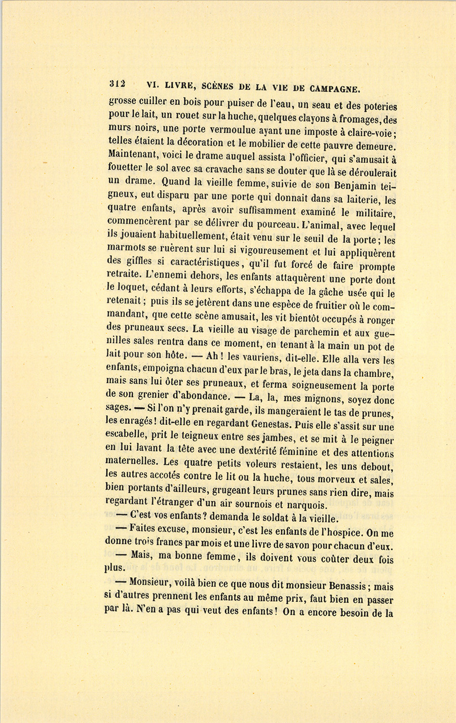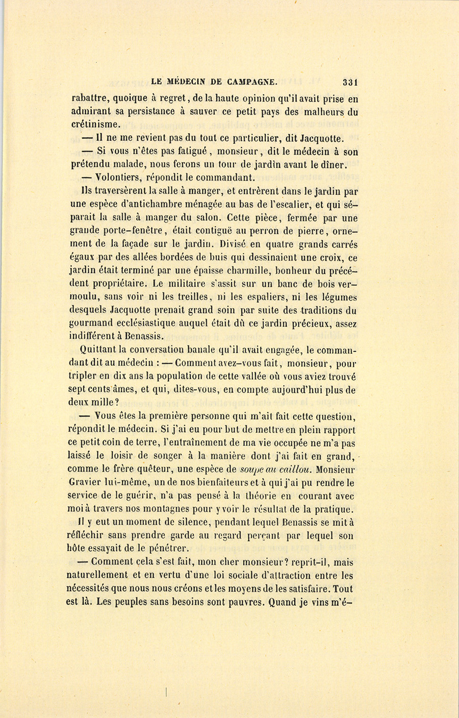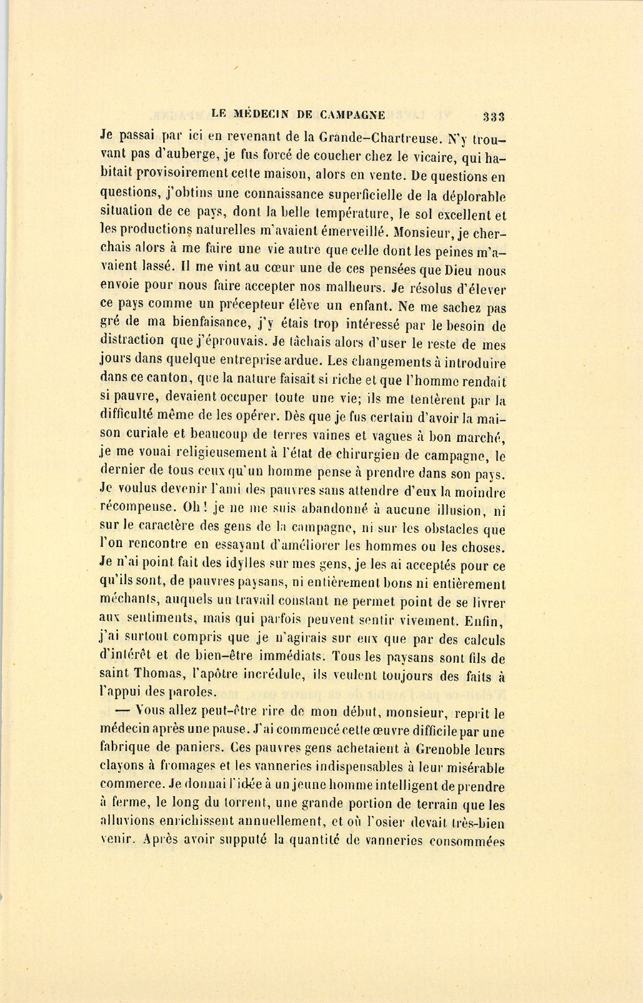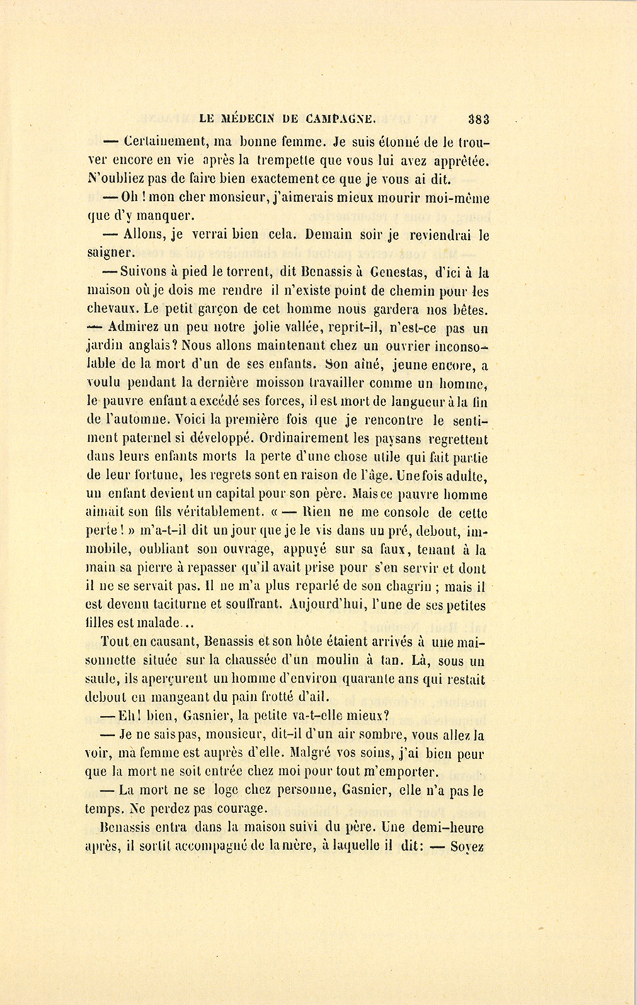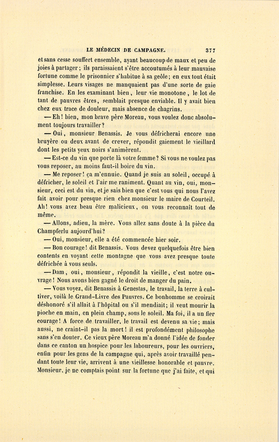 – Monsieur, voilà bien ce que nous dit monsieur Benassis ; mais si d’autres prennent les enfants au même prix, faut bien en passer par là. N’en a pas qui veut des enfants ! On a encore besoin de la {p. 313} croix et de la bannière pour en obtenir. Quand nous leur donnerions notre lait pour rien, il ne nous coûte guère. D’ailleurs, monsieur, trois francs, c’est une somme. Voilà quinze francs de trouvés, sans les cinq livres de savon. Dans nos cantons, combien faut-il donc s’exterminer le tempérament avant d’avoir gagné dix sous par jour.
