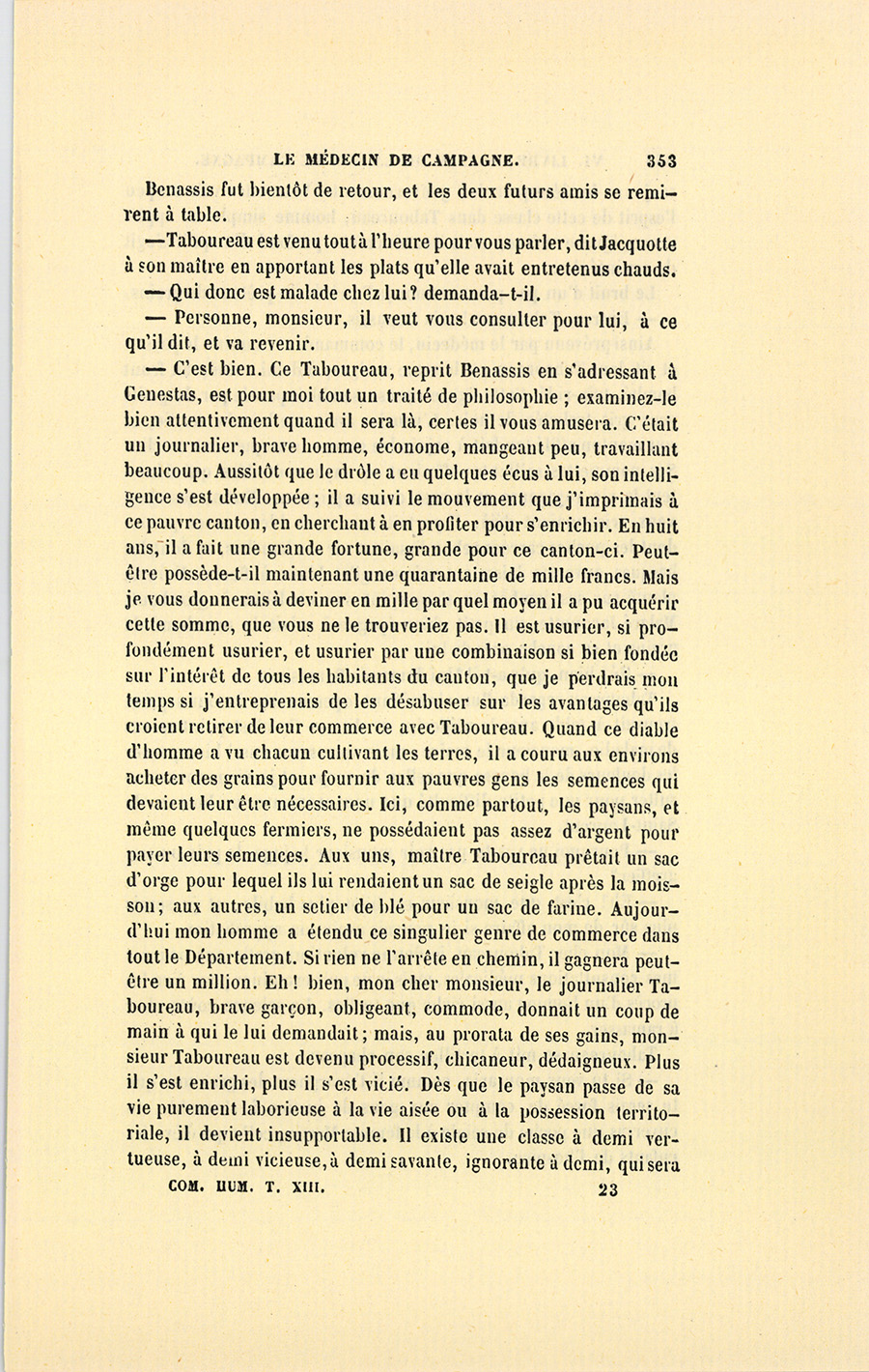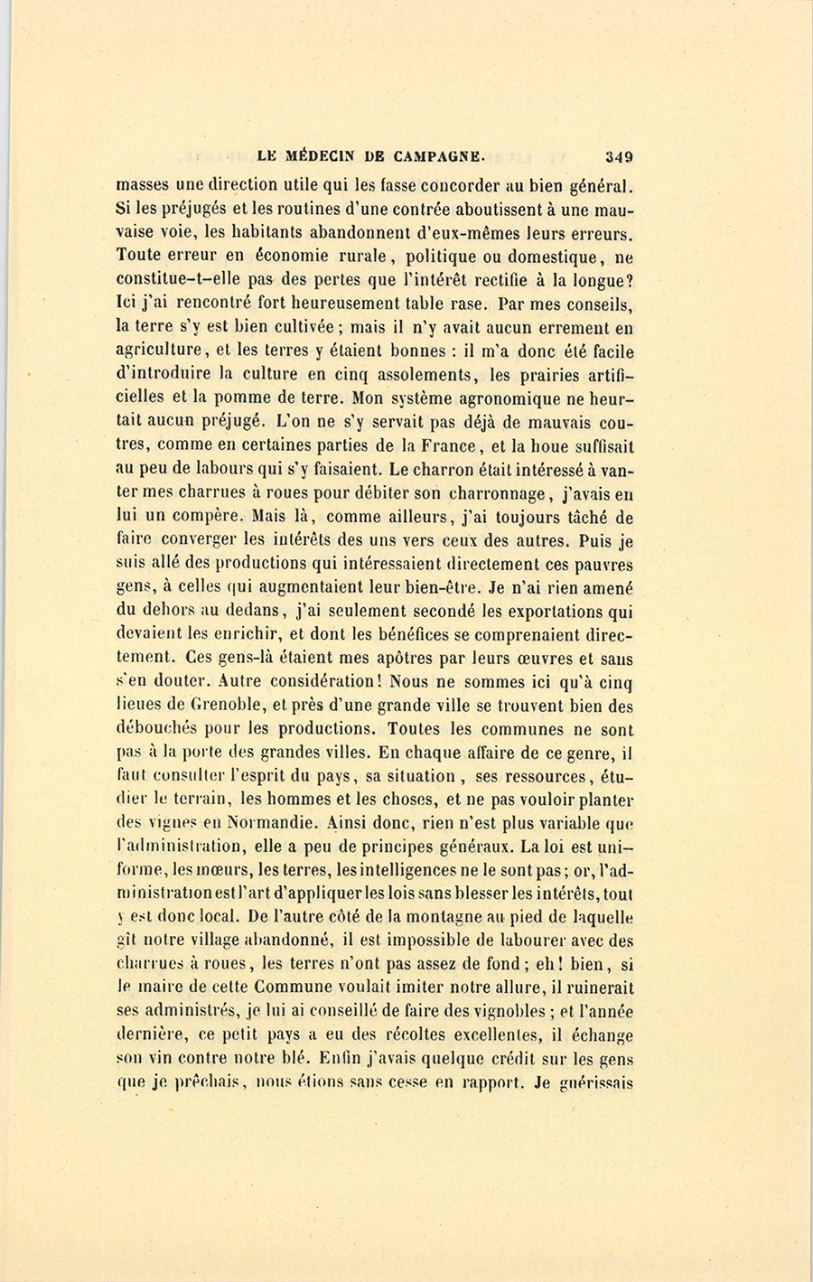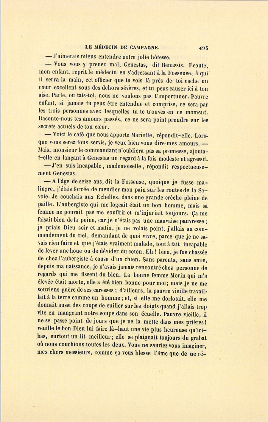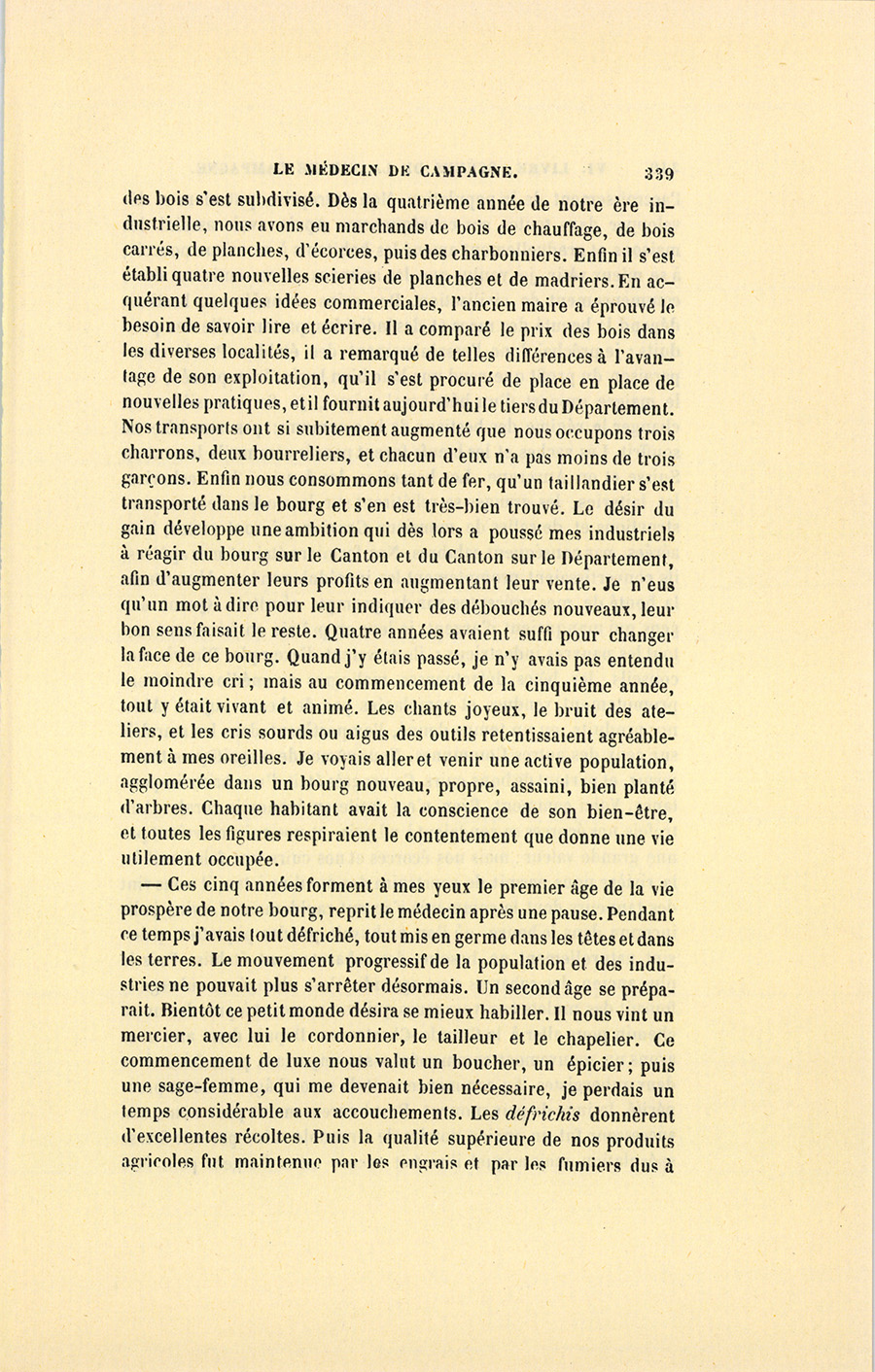 – Monsieur, voilà bien ce que nous dit monsieur Benassis ; mais si d’autres prennent les enfants au même prix, faut bien en passer par là. N’en a pas qui veut des enfants ! On a encore besoin de la {p. 313} croix et de la bannière pour en obtenir. Quand nous leur donnerions notre lait pour rien, il ne nous coûte guère. D’ailleurs, monsieur, trois francs, c’est une somme. Voilà quinze francs de trouvés, sans les cinq livres de savon. Dans nos cantons, combien faut-il donc s’exterminer le tempérament avant d’avoir gagné dix sous par jour.