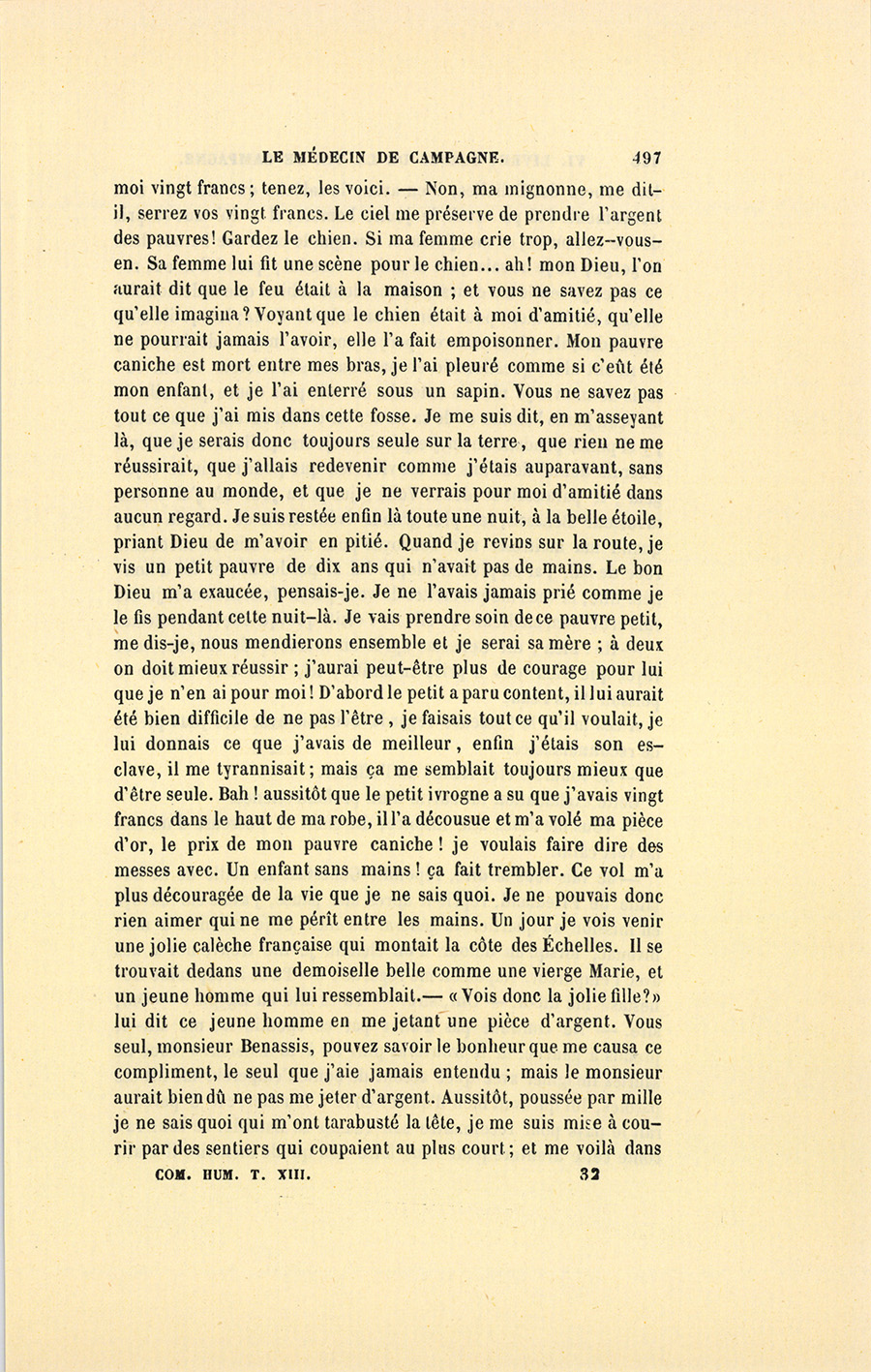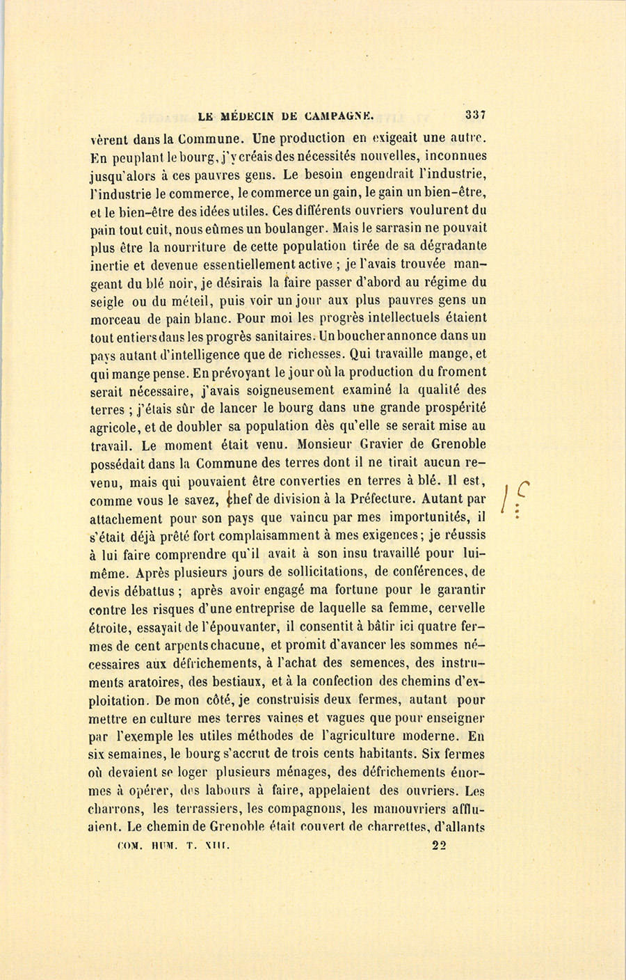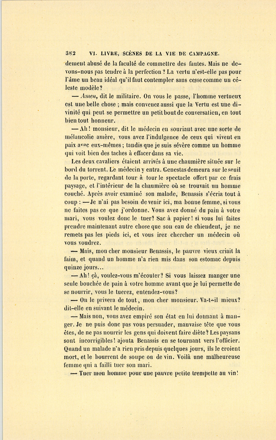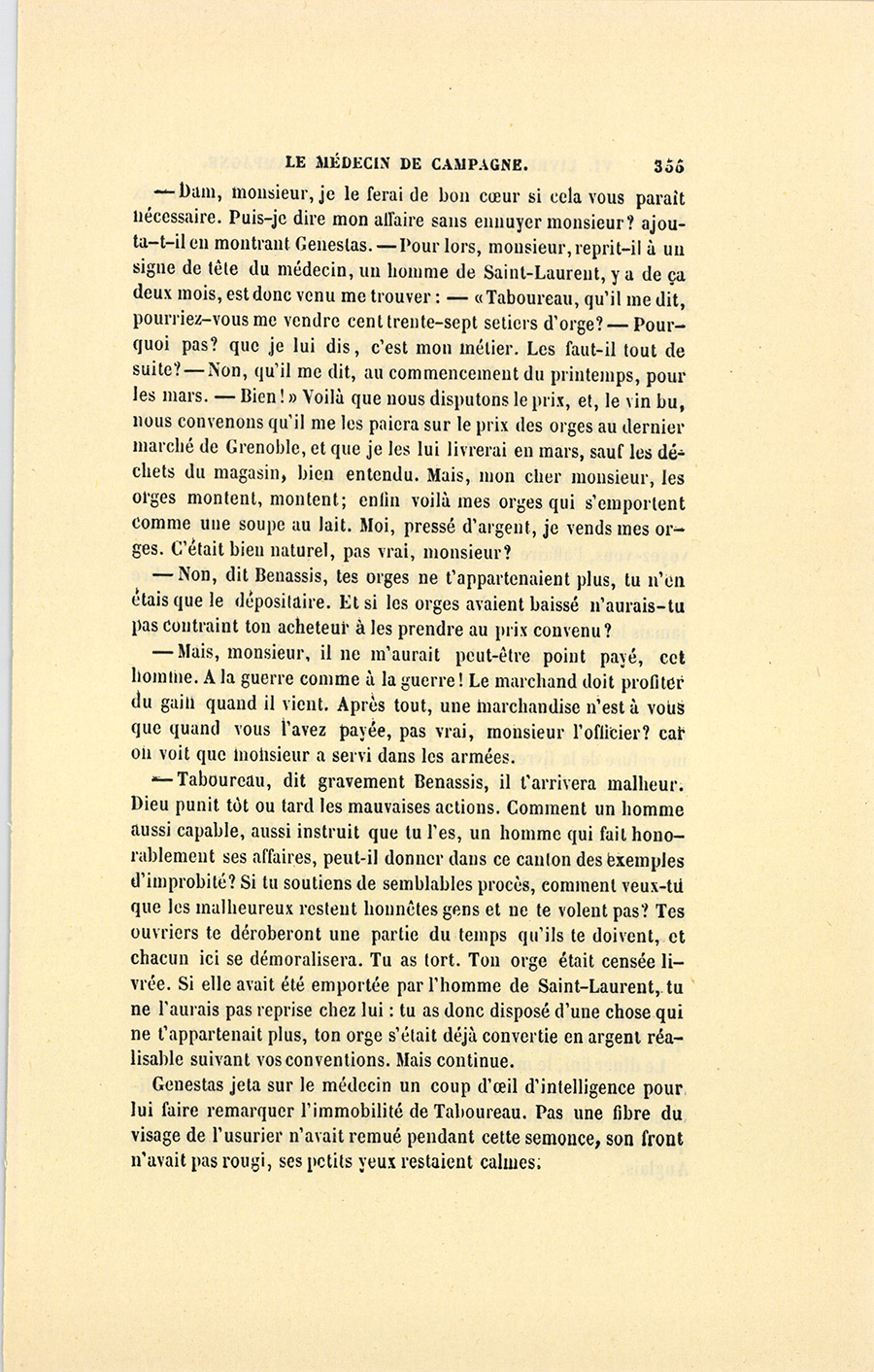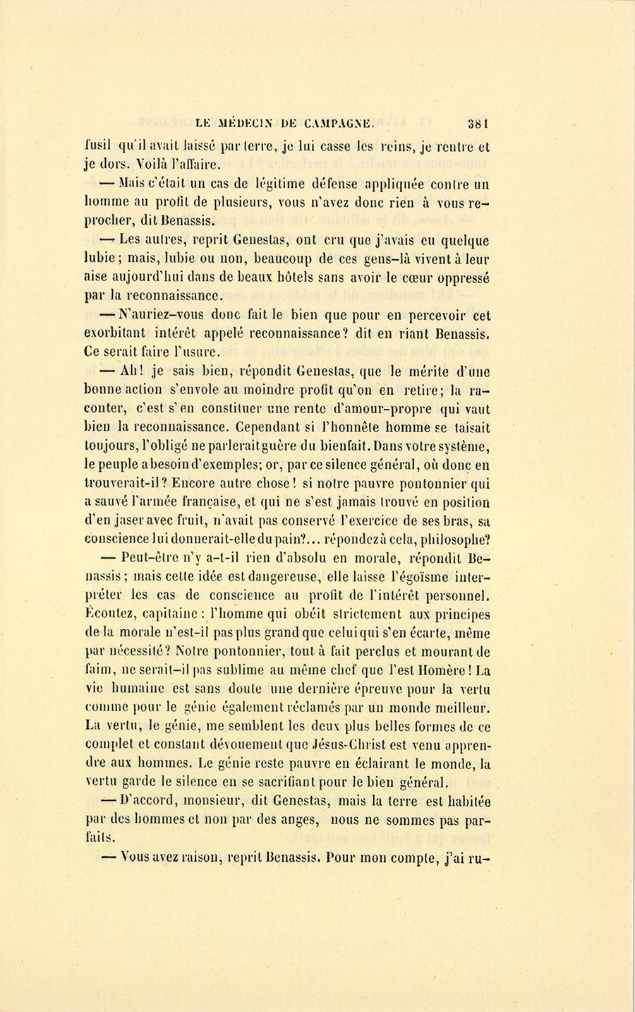 – Monsieur, voilà bien ce que nous dit monsieur Benassis ; mais si d’autres prennent les enfants au même prix, faut bien en passer par là. N’en a pas qui veut des enfants ! On a encore besoin de la {p. 313} croix et de la bannière pour en obtenir. Quand nous leur donnerions notre lait pour rien, il ne nous coûte guère. D’ailleurs, monsieur, trois francs, c’est une somme. Voilà quinze francs de trouvés, sans les cinq livres de savon. Dans nos cantons, combien faut-il donc s’exterminer le tempérament avant d’avoir gagné dix sous par jour.