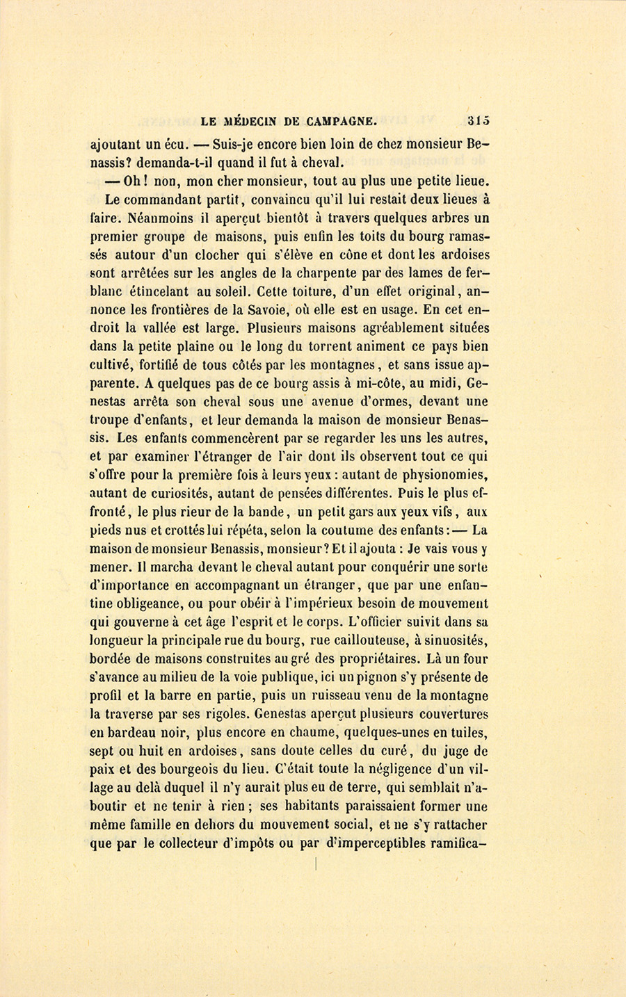 Le commandant partit, convaincu qu’il lui restait deux lieues à faire. Néanmoins il aperçut bientôt à travers quelques arbres un premier groupe de maisons, puis enfin les toits du bourg ramassés autour d’un clocher qui s’élève en cône et dont les ardoises sont arrêtées sur les angles de la charpente par des lames de fer-blanc étincelant au soleil. Cette toiture, d’un effet original, annonce les frontières de la Savoie, où elle est en usage. En cet endroit la vallée est large. Plusieurs maisons agréablement situées dans la petite plaine ou le long du torrent animent ce pays bien cultivé, fortifié de tous côtés par les montagnes, et sans issue apparente. À quelques pas de ce bourg assis à mi-côte, au midi, Genestas arrêta son cheval sous une avenue d’ormes, devant une troupe d’enfants, et leur demanda la maison de monsieur Benassis. Les enfants commencèrent par se regarder les uns les autres, et par examiner l’étranger de l’air dont ils observent tout ce qui s’offre pour la première fois à leurs yeux : autant de physionomies, autant de curiosités, autant de pensées différentes. Puis le plus effronté, le plus rieur de la bande, un petit gars aux yeux vifs, aux pieds nus et crottés lui répéta, selon la coutume des enfants : – La maison de monsieur Benassis, monsieur ? Et il ajouta : Je vais vous y mener. Il marcha devant le cheval autant pour conquérir une sorte d’importance en accompagnant un étranger, que par une enfantine obligeance, ou pour obéir à l’impérieux besoin de mouvement qui gouverne à cet âge l’esprit et le corps. L’officier suivit dans sa longueur la principale rue du bourg, rue caillouteuse, à sinuosités, bordée de maisons construites au gré des propriétaires. Là un four s’avance au milieu de la voie publique, ici un pignon s’y présente de profil et la barre en partie, puis un ruisseau venu de la montagne la traverse par ses rigoles. Genestas aperçut plusieurs couvertures en bardeau noir, plus encore en chaume, quelques-unes en tuiles, sept ou huit en ardoises, sans doute celles du curé, du juge de paix et des bourgeois du lieu. C’était toute la négligence d’un village au delà duquel il n’y aurait plus eu de terre, qui semblait n’aboutir et ne tenir à rien ; ses habitants paraissaient former une même famille en dehors du mouvement social, et ne s’y rattacher que par le collecteur d’impôts ou par d’imperceptibles {p. 316} ramifications. Quand Genestas eut fait quelques pas de plus, il vit en haut de la montagne une large rue qui domine ce village. Il existait sans doute un vieux et un nouveau bourg. En effet, par une échappée de vue, et dans un endroit où le commandant modéra le pas de son cheval, il put facilement examiner des maisons bien bâties dont les toits neufs égaient l’ancien village. Dans ces habitations nouvelles que couronne une avenue de jeunes arbres, il entendit les chants particuliers aux ouvriers occupés, le murmure de quelques ateliers, un grognement de limes, le bruit des marteaux, les cris confus de plusieurs industries. Il remarqua la maigre fumée des cheminées ménagères et celle plus abondante des forges du charron, du serrurier, du maréchal. Enfin, à l’extrémité du village vers laquelle son guide le dirigeait, Genestas aperçut des fermes éparses, des champs bien cultivés, des plantations parfaitement entendues, et comme un petit coin de la Brie perdu dans un vaste pli du terrain dont, à la première vue, il n’eût pas soupçonné l’existence entre le bourg et les montagnes qui terminent le pays.