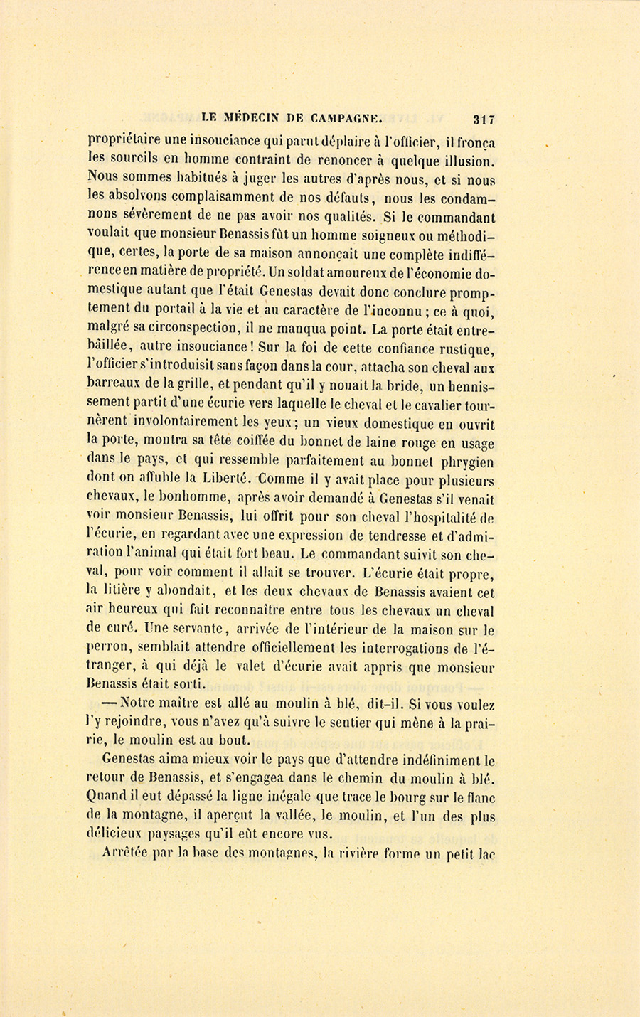 Genestas aima mieux voir le pays que d’attendre indéfiniment le retour de Benassis, et s’engagea dans le chemin du moulin à blé. Quand il eut dépassé la ligne inégale que trace le bourg sur le flanc de la montagne, il aperçut la vallée, le moulin, et l’un des plus délicieux paysages qu’il eût encore vus.