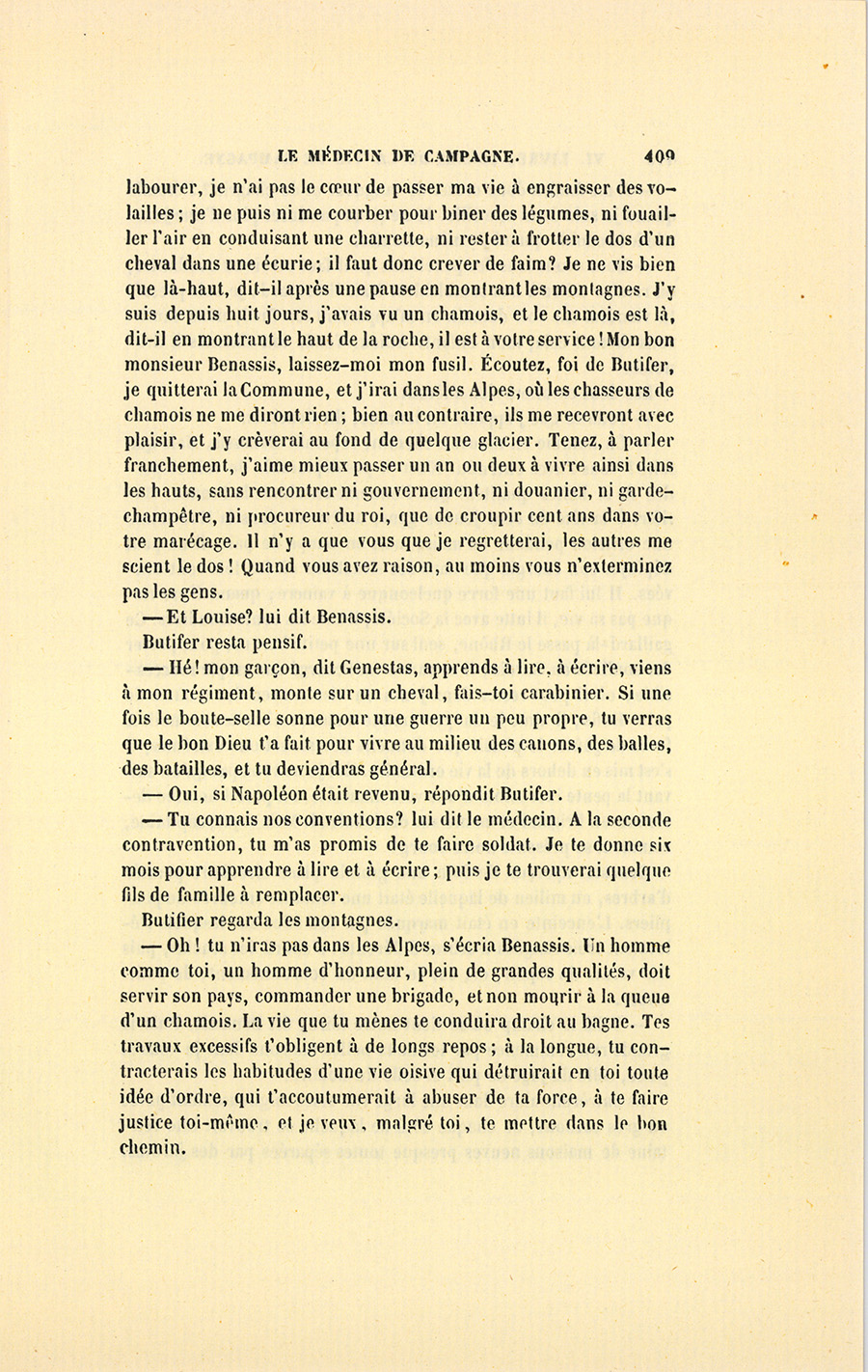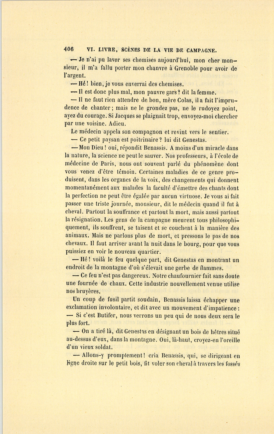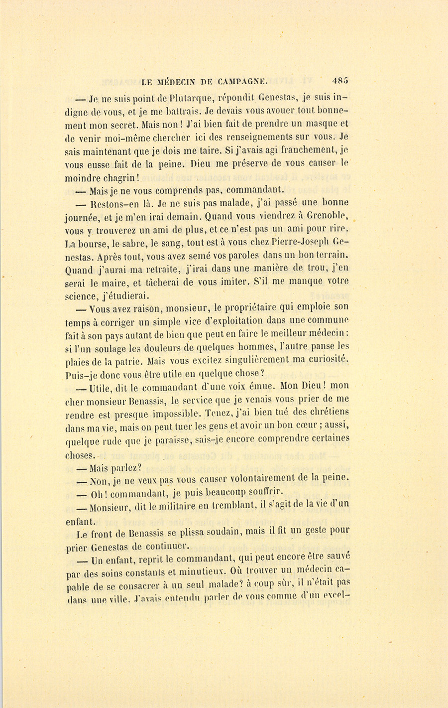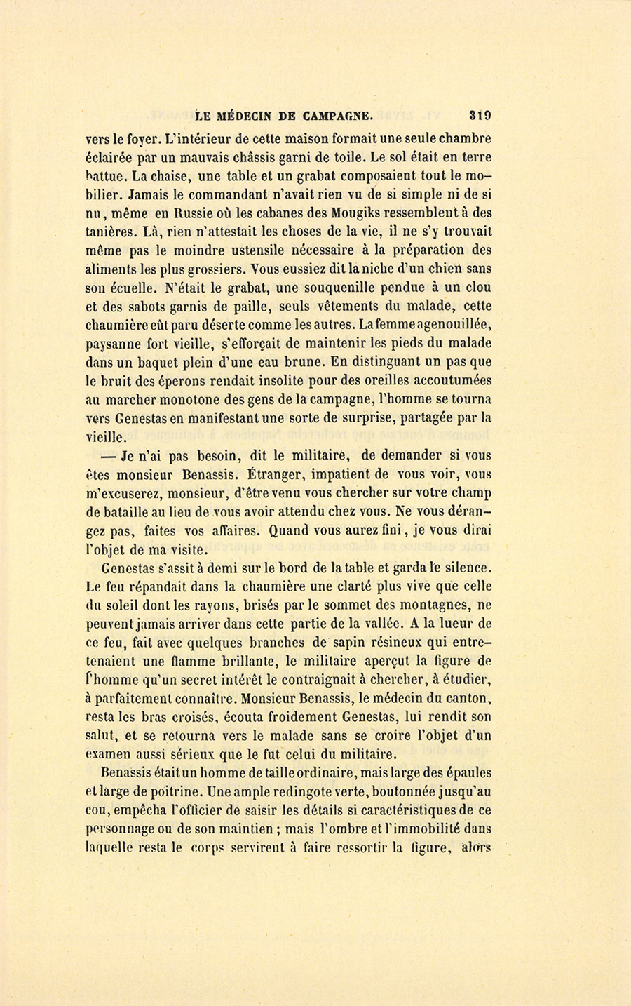Genestas s’assit à demi sur le bord de la table et garda le silence. Le feu répandait dans la chaumière une clarté plus vive que celle du soleil dont les rayons, brisés par le sommet des montagnes, ne peuvent jamais arriver dans cette partie de la vallée. À la lueur de ce feu, fait avec quelques branches de sapin résineux qui entretenaient une flamme brillante, le militaire aperçut la figure de l’homme qu’un secret intérêt le contraignait à chercher, à étudier, à parfaitement connaître. Monsieur Benassis, le médecin du canton, resta les bras croisés, écouta froidement Genestas, lui rendit son salut, et se retourna vers le malade sans se croire l’objet d’un examen aussi sérieux que le fut celui du militaire.