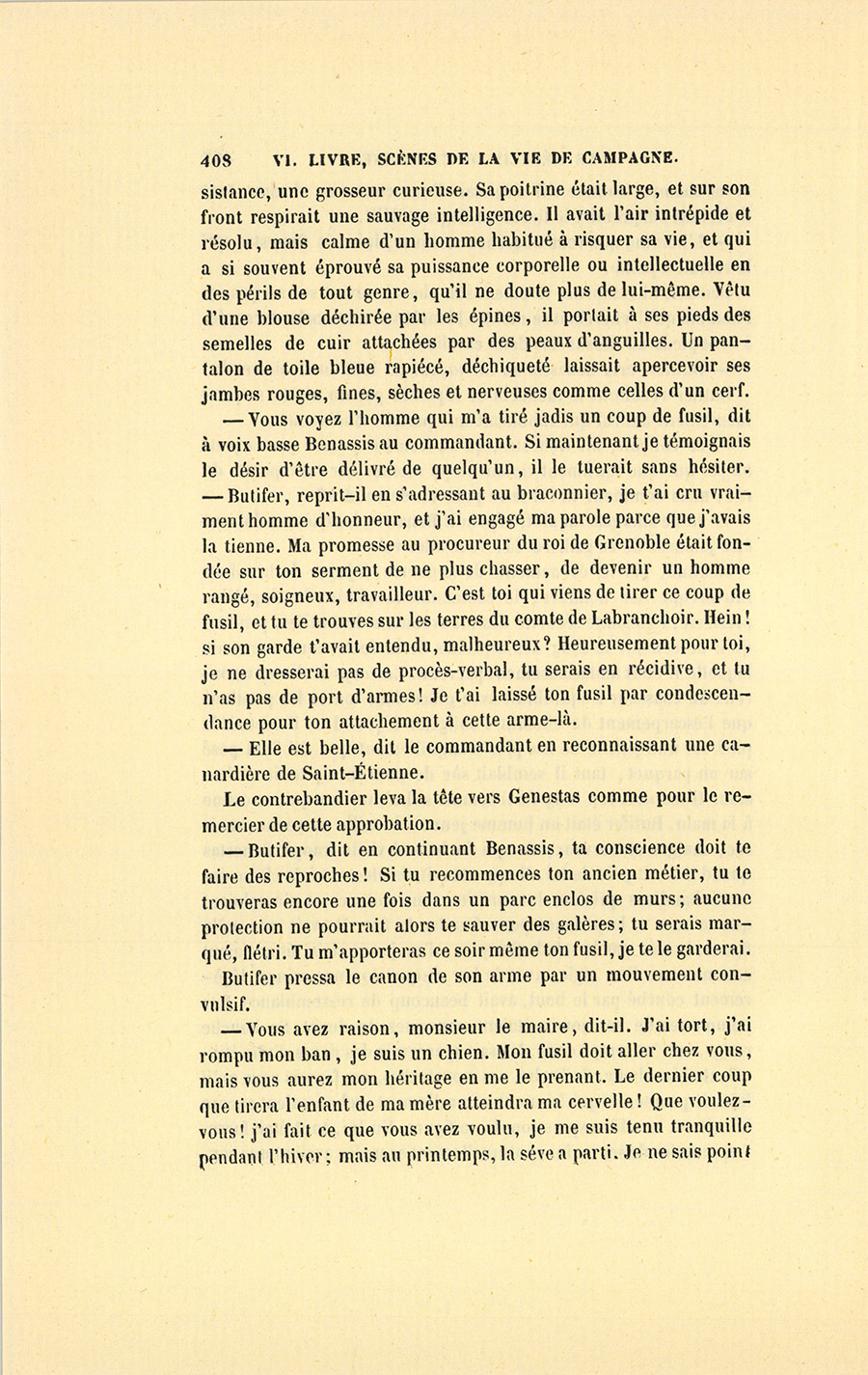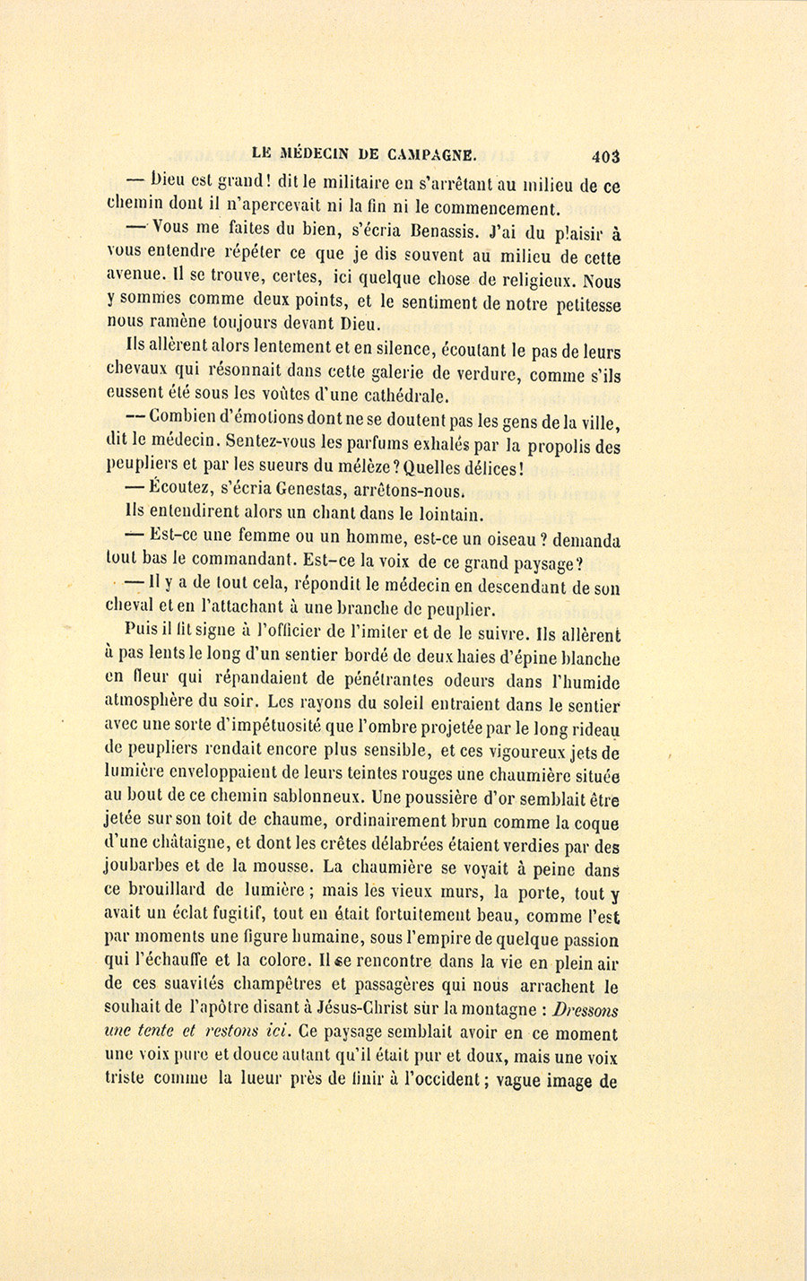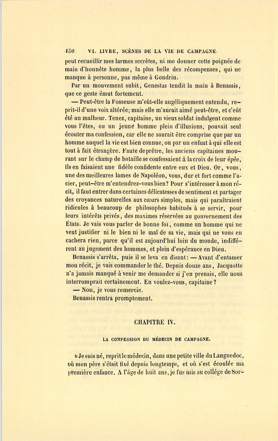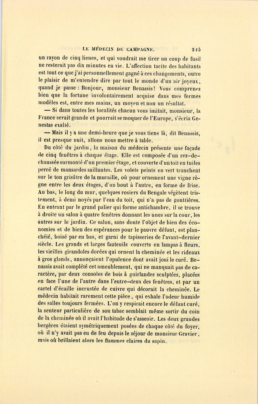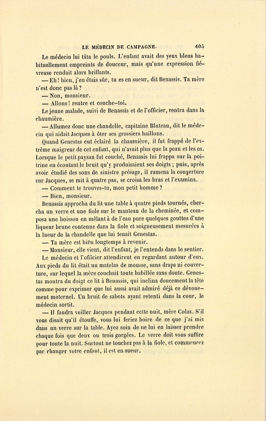 Genestas s’assit à demi sur le bord de la table et garda le silence. Le feu répandait dans la chaumière une clarté plus vive que celle du soleil dont les rayons, brisés par le sommet des montagnes, ne peuvent jamais arriver dans cette partie de la vallée. À la lueur de ce feu, fait avec quelques branches de sapin résineux qui entretenaient une flamme brillante, le militaire aperçut la figure de l’homme qu’un secret intérêt le contraignait à chercher, à étudier, à parfaitement connaître. Monsieur Benassis, le médecin du canton, resta les bras croisés, écouta froidement Genestas, lui rendit son salut, et se retourna vers le malade sans se croire l’objet d’un examen aussi sérieux que le fut celui du militaire.