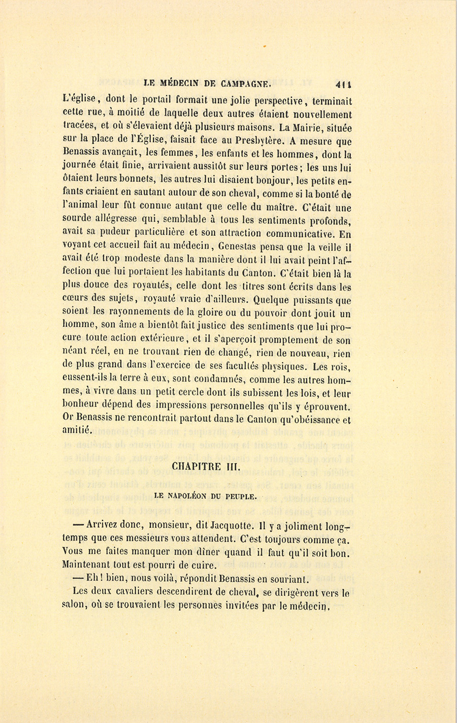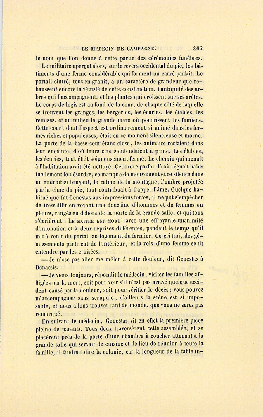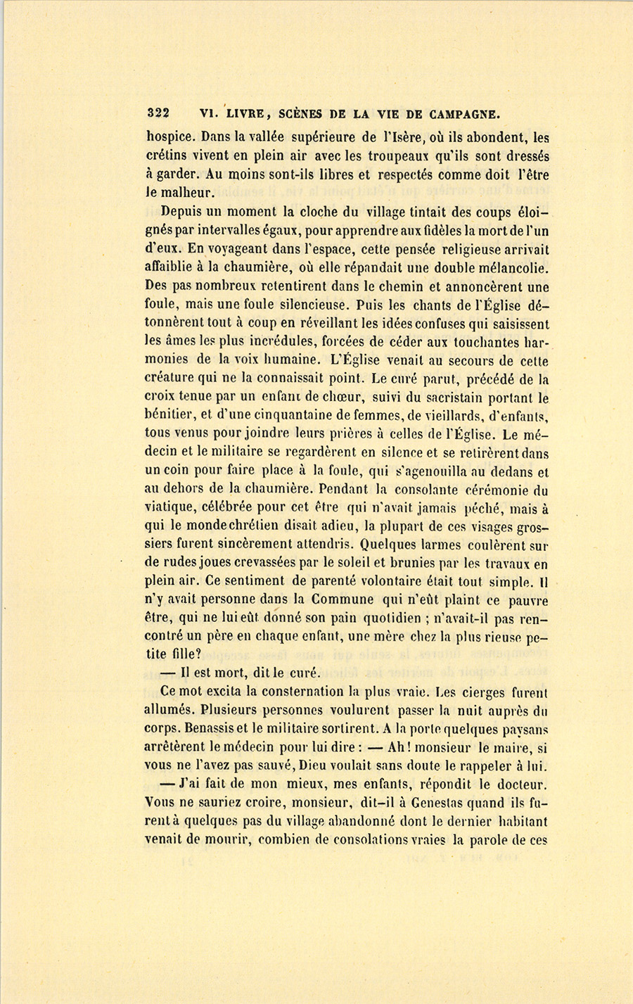 – J’ai fait de mon mieux, mes enfants, répondit le docteur. Vous ne sauriez croire, monsieur, dit-il à Genestas quand ils furent à quelques pas du village abandonné dont le dernier habitant venait de mourir, combien de consolations vraies la parole de ces {p. 323} paysans renferme pour moi. Il y a dix ans, j’ai failli être lapidé dans ce village aujourd’hui désert, mais alors habité par trente familles.