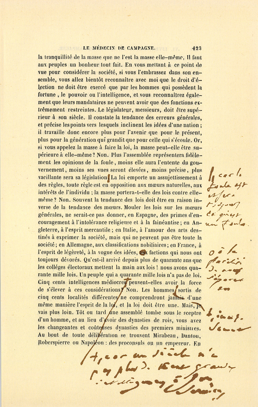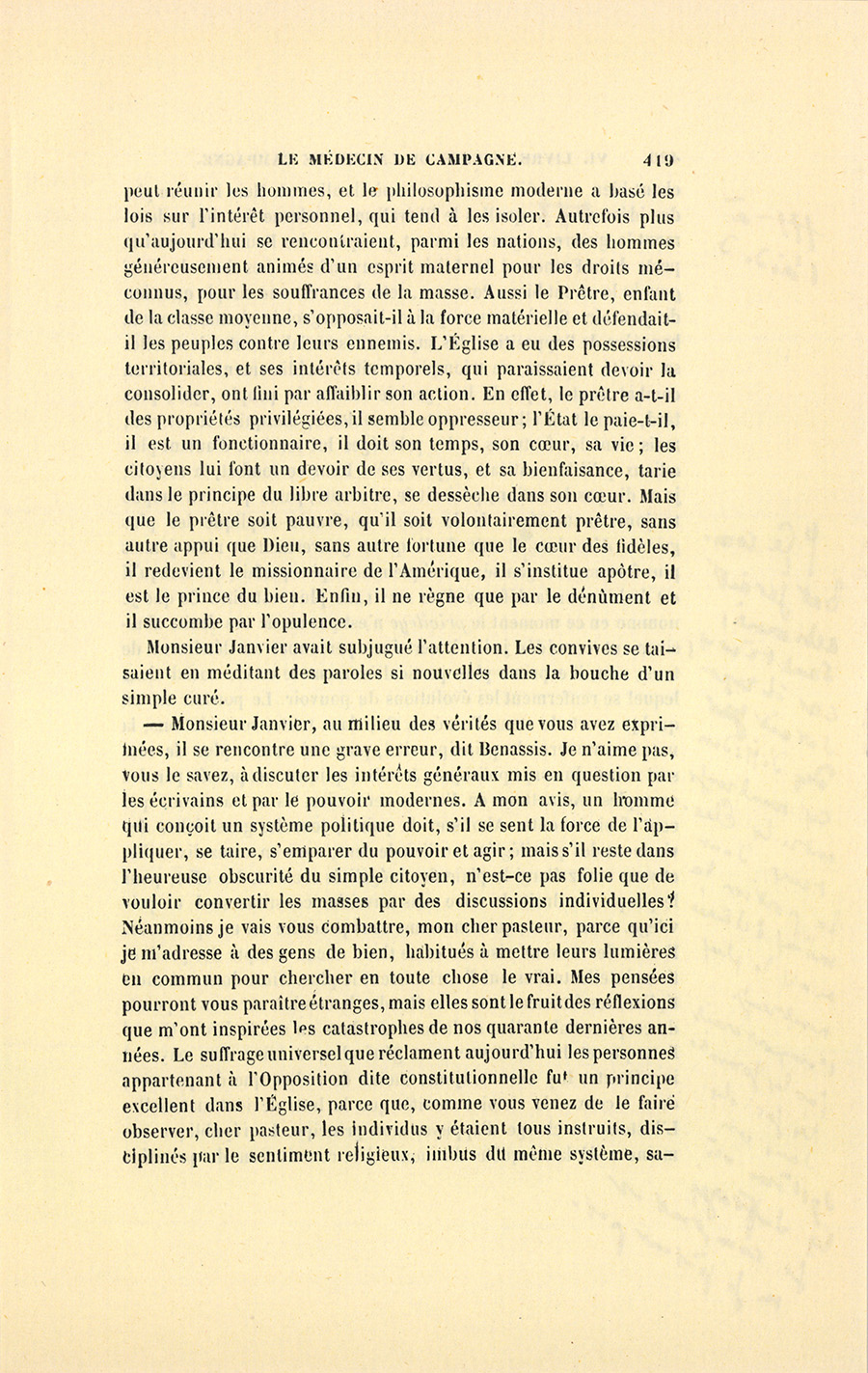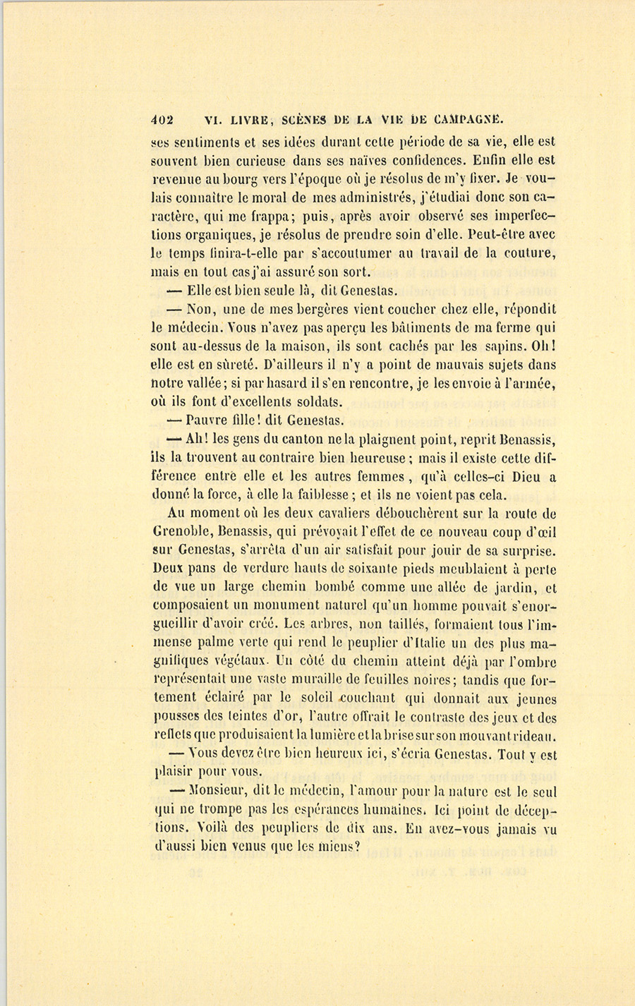– J’ai fait de mon mieux, mes enfants, répondit le docteur. Vous ne sauriez croire, monsieur, dit-il à Genestas quand ils furent à quelques pas du village abandonné dont le dernier habitant venait de mourir, combien de consolations vraies la parole de ces {p. 323} paysans renferme pour moi. Il y a dix ans, j’ai failli être lapidé dans ce village aujourd’hui désert, mais alors habité par trente familles.