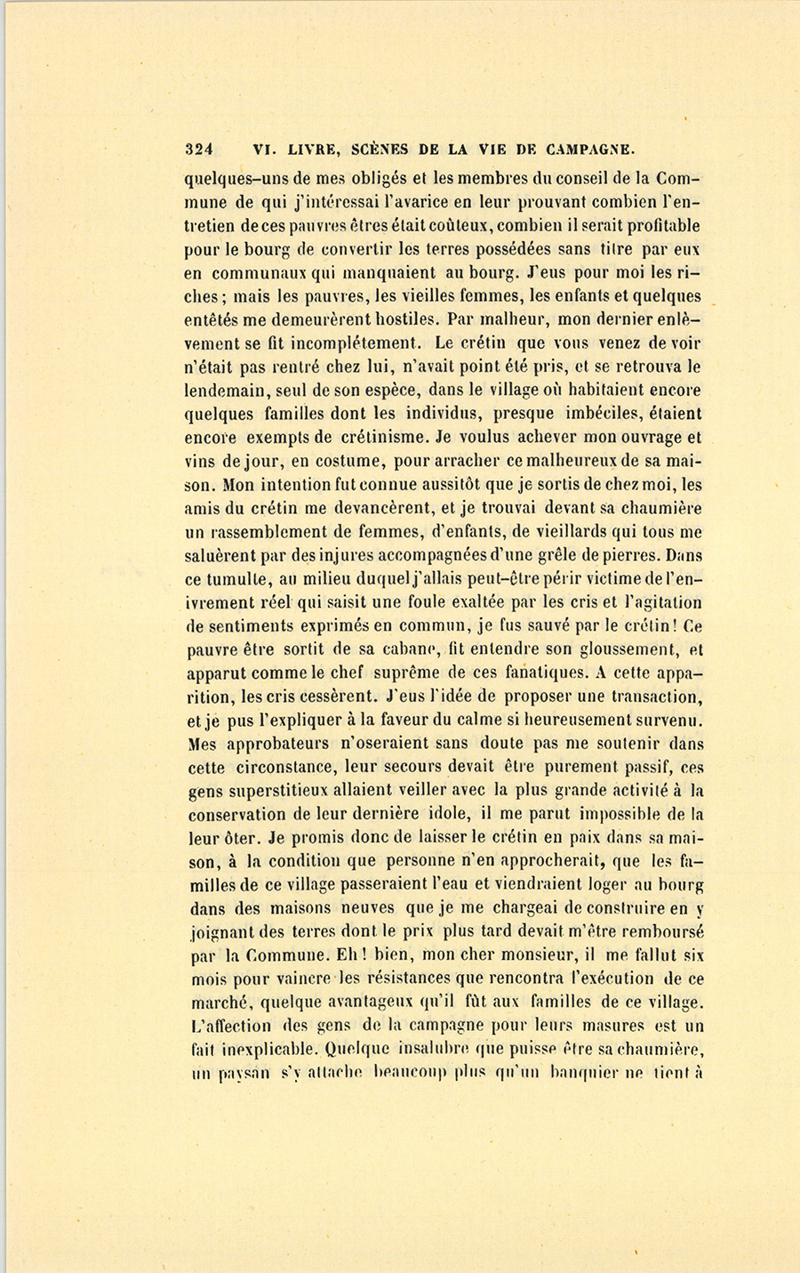– Monsieur, quand je vins m’établir ici, je trouvai dans cette partie du canton une douzaine de crétins, dit le médecin en se retournant pour montrer à l’officier les maisons ruinées. La situation de ce hameau dans un fond sans courant d’air, près du torrent dont l’eau provient des neiges fondues, privé des bienfaits du soleil, qui n’éclaire que le sommet de la montagne, tout y favorise la propagation de cette affreuse maladie. Les lois ne défendent pas l’accouplement de ces malheureux, protégés ici par une superstition dont la puissance m’était inconnue, que j’ai d’abord condamnée, puis admirée. Le crétinisme se serait donc étendu depuis cet endroit jusqu’à la vallée. N’était-ce pas rendre un grand service au pays que d’arrêter cette contagion physique et intellectuelle ? Malgré son urgence, ce bienfait pouvait coûter la vie à celui qui entreprendrait de l’opérer. Ici, comme dans les autres sphères sociales, pour accomplir le bien, il fallait froisser, non pas des intérêts, mais, chose plus dangereuse à manier, des idées religieuses converties en superstition, la forme la plus indestructible des idées humaines. Je ne m’effrayai de rien. Je sollicitai d’abord la place de maire du canton, et l’obtins ; puis, après avoir reçu l’approbation verbale du préfet, je fis nuitamment transporter à prix d’argent quelques-unes de ces malheureuses créatures du côté d’Aiguebelle, en Savoie, où il s’en trouve beaucoup et où elles devaient être très-bien traitées. Aussitôt que cet acte d’humanité fut connu, je devins en horreur à toute la population. Le curé prêcha contre moi. Malgré mes efforts pour expliquer aux meilleures têtes du bourg combien était importante l’expulsion de ces crétins, malgré les soins gratuits que je rendais aux malades du pays, on me tira un coup de fusil au coin d’un bois. J’allai voir l’évêque de Grenoble et lui demandai le changement du curé. Monseigneur fut assez bon pour me permettre de choisir un prêtre qui pût s’associer à mes œuvres, et j’eus le bonheur de rencontrer un de ces êtres qui semblent tombés du ciel. Je poursuivis mon entreprise. Après avoir travaillé les esprits, je déportai nuitamment six autres crétins. À cette seconde tentative, j’eus pour défenseurs {p. 324} quelques-uns de mes obligés et les membres du conseil de la Commune de qui j’intéressai l’avarice en leur prouvant combien l’entretien de ces pauvres êtres était coûteux, combien il serait profitable pour le bourg de convertir les terres possédées sans titre par eux en communaux qui manquaient au bourg. J’eus pour moi les riches ; mais les pauvres, les vieilles femmes, les enfants et quelques entêtés me demeurèrent hostiles. Par malheur, mon dernier enlèvement se fit incomplétement. Le crétin que vous venez de voir n’était pas rentré chez lui, n’avait point été pris, et se retrouva le lendemain, seul de son espèce, dans le village où habitaient encore quelques familles dont les individus, presque imbéciles, étaient encore exempts de crétinisme. Je voulus achever mon ouvrage et vins de jour, en costume, pour arracher ce malheureux de sa maison. Mon intention fut connue aussitôt que je sortis de chez moi, les amis du crétin me devancèrent, et je trouvai devant sa chaumière un rassemblement de femmes, d’enfants, de vieillards qui tous me saluèrent par des injures accompagnées d’une grêle de pierres. Dans ce tumulte, au milieu duquel j’allais peut-être périr victime de l’enivrement réel qui saisit une foule exaltée par les cris et l’agitation de sentiments exprimés en commun, je fus sauvé par le crétin ! Ce pauvre être sortit de sa cabane, fit entendre son gloussement, et apparut comme le chef suprême de ces fanatiques. À cette apparition, les cris cessèrent. J’eus l’idée de proposer une transaction, et je pus l’expliquer à la faveur du calme si heureusement survenu. Mes approbateurs n’oseraient sans doute pas me soutenir dans cette circonstance, leur secours devait être purement passif, ces gens superstitieux allaient veiller avec la plus grande activité à la conservation de leur dernière idole, il me parut impossible de la leur ôter. Je promis donc de laisser le crétin en paix dans sa maison, à la condition que personne n’en approcherait, que les familles de ce village passeraient l’eau et viendraient loger au bourg dans des maisons neuves que je me chargeai de construire en y joignant des terres dont le prix plus tard devait m’être remboursé par la Commune. Eh ! bien, mon cher monsieur, il me fallut six mois pour vaincre les résistances que rencontra l’exécution de ce marché, quelque avantageux qu’il fût aux familles de ce village. L’affection des gens de la campagne pour leurs masures est un fait inexplicable. Quelque insalubre que puisse être sa chaumière, un paysan s’y attache beaucoup plus qu’un banquier ne tient à {p. 325} son hôtel. Pourquoi ? je ne sais. Peut-être la force des sentiments est-elle en raison de leur rareté. Peut-être l’homme qui vit peu par la pensée vit-il beaucoup par les choses ? et moins il en possède, plus sans doute il les aime. Peut-être en est-il du paysan comme du prisonnier ?… il n’éparpille point les forces de son âme, il les concentre sur une seule idée, et arrive alors à une grande énergie de sentiment. Pardonnez ces réflexions à un homme qui échange rarement ses pensées. D’ailleurs ne croyez pas, monsieur, que je me sois beaucoup occupé d’idées creuses. Ici, tout doit être pratique et action. Hélas ! moins ces pauvres gens ont d’idées, plus il est difficile de leur faire entendre leurs véritables intérêts. Aussi me suis-je résigné à toutes les minuties de mon entreprise. Chacun d’eux me disait la même chose, une de ces choses pleines de bon sens et qui ne souffrent pas de réponse : – Ah ! monsieur,