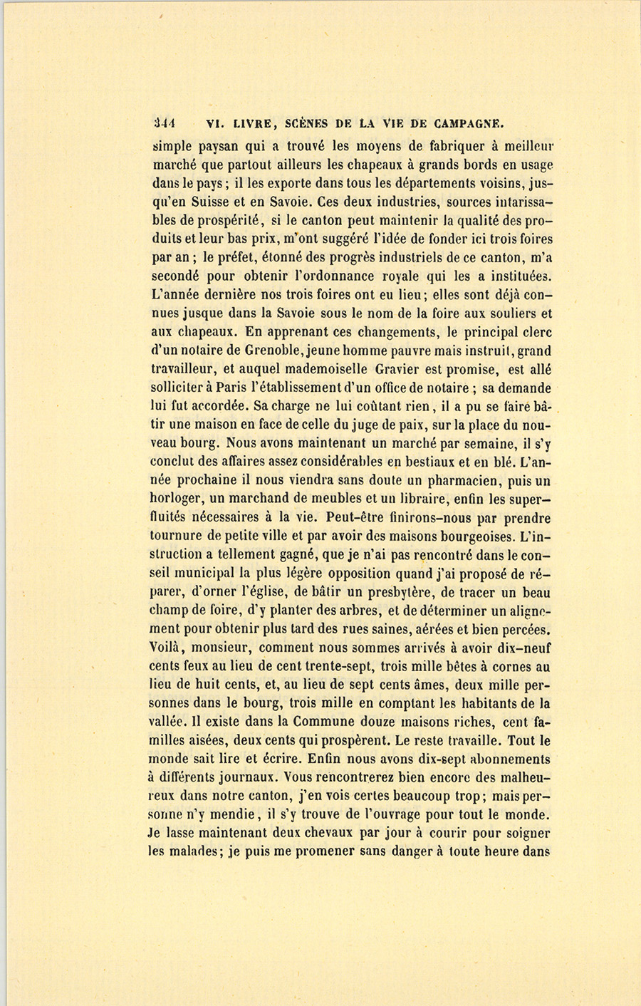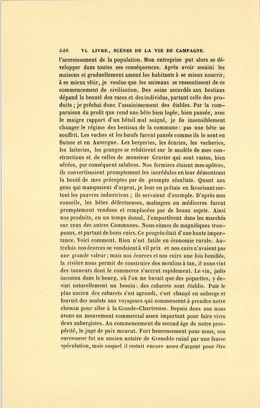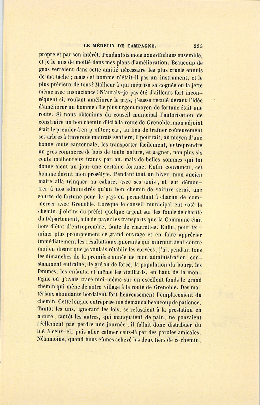 – Comment cela s’est fait, mon cher monsieur ? reprit-il, mais naturellement et en vertu d’une loi sociale d’attraction entre les nécessités que nous nous créons et les moyens de les satisfaire. Tout est là. Les peuples sans besoins sont pauvres. Quand je vins {p. 332} m’établir dans ce bourg, on y comptait cent trente familles de paysans, et, dans la vallée, deux cents feux environ. Les autorités du pays, en harmonie avec la misère publique, se composaient d’un maire qui ne savait pas écrire, et d’un adjoint, métayer domicilié loin de la Commune ; d’un juge de paix, pauvre diable vivant de ses appointements, et laissant tenir par force les actes de l’État Civil à son greffier, autre malheureux à peine en état de comprendre son métier. L’ancien curé mort à l’âge de soixante-dix ans, son vicaire, homme sans instruction, venait de lui succéder. Ces gens résumaient l’intelligence du pays et le régissaient. Au milieu de cette belle nature, les habitants croupissaient dans la fange et vivaient de pommes de terre et de laitage ; les fromages que la plupart d’entre eux portaient sur de petits paniers à Grenoble ou aux environs constituaient les seuls produits desquels ils tirassent quelque argent. Les plus riches ou les moins paresseux semaient du sarrasin pour la consommation du bourg, quelquefois de l’orge ou de l’avoine, mais point de blé. Le seul industriel du pays était le maire qui possédait une scierie et achetait à bas prix les coupes de bois pour les débiter. Faute de chemins, il transportait ses arbres un à un dans la belle saison en les traînant à grand’peine au moyen d’une chaîne attachée au licou de ses chevaux, et terminée par un crampon de fer enfoncé dans le bois. Pour aller à Grenoble, soit à cheval, soit à pied, il fallait passer par un large sentier situé en haut de la montagne, la vallée était impraticable. D’ici au premier village que vous avez vu en arrivant dans le canton, la jolie route, par laquelle vous êtes sans doute venu, ne formait en tout temps qu’un bourbier. Aucun événement politique, aucune révolution n’était arrivée dans ce pays inaccessible, et complétement en dehors du mouvement social. Napoléon seul y avait jeté son nom, il y est une religion, grâce à deux ou trois vieux soldats du pays revenus dans leurs foyers, et qui, pendant les veillées, racontent fabuleusement à ces gens simples les aventures de cet homme et de ses armées. Ce retour est d’ailleurs un phénomène inexplicable. Avant mon arrivée, les jeunes gens partis à l’armée y restaient tous. Ce fait accuse assez la misère du pays pour me dispenser de vous la peindre. Voilà, monsieur, dans quel état j’ai pris ce canton duquel dépendent, au delà des montagnes, plusieurs Communes bien cultivées, assez heureuses et presque riches. Je ne vous parle pas des chaumières du bourg, véritables écuries où bêtes et gens s’entassaient alors pêle-mêle.