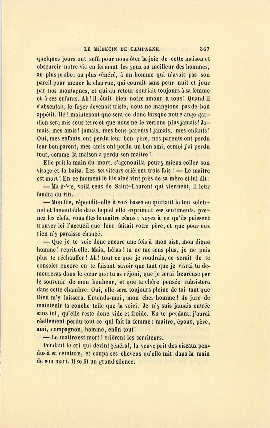 Ce mot excita la consternation la plus vraie. Les cierges furent allumés. Plusieurs personnes voulurent passer la nuit auprès du corps. Benassis et le militaire sortirent. À la porte quelques paysans arrêtèrent le médecin pour lui dire : – Ah ! monsieur le maire, si vous ne l’avez pas sauvé, Dieu voulait sans doute le rappeler à lui.