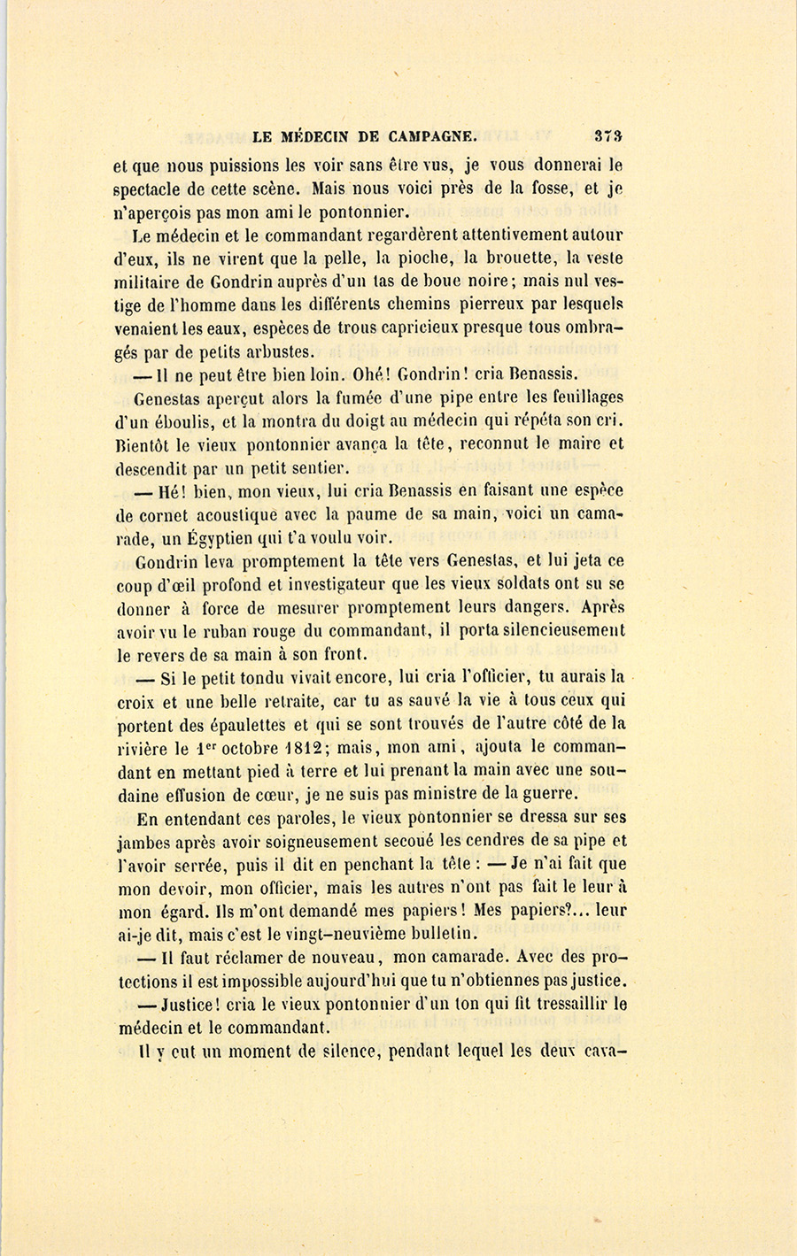 – Je n’ai pas besoin, dit le militaire, de demander si vous êtes monsieur Benassis. Étranger, impatient de vous voir, vous m’excuserez, monsieur, d’être venu vous chercher sur votre champ de bataille au lieu de vous avoir attendu chez vous. Ne vous dérangez pas, faites vos affaires. Quand vous aurez fini, je vous dirai l’objet de ma visite.