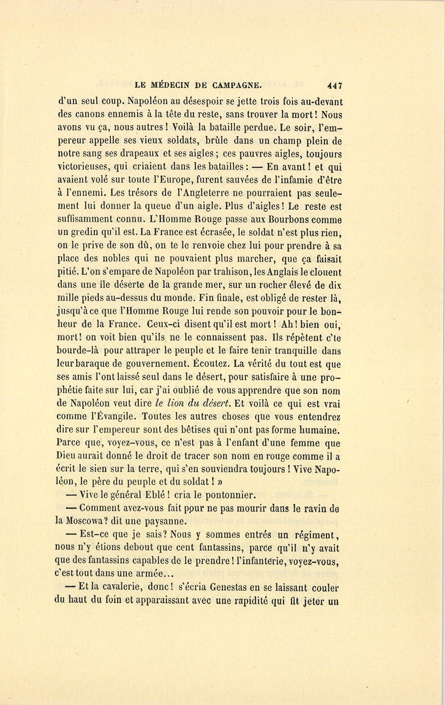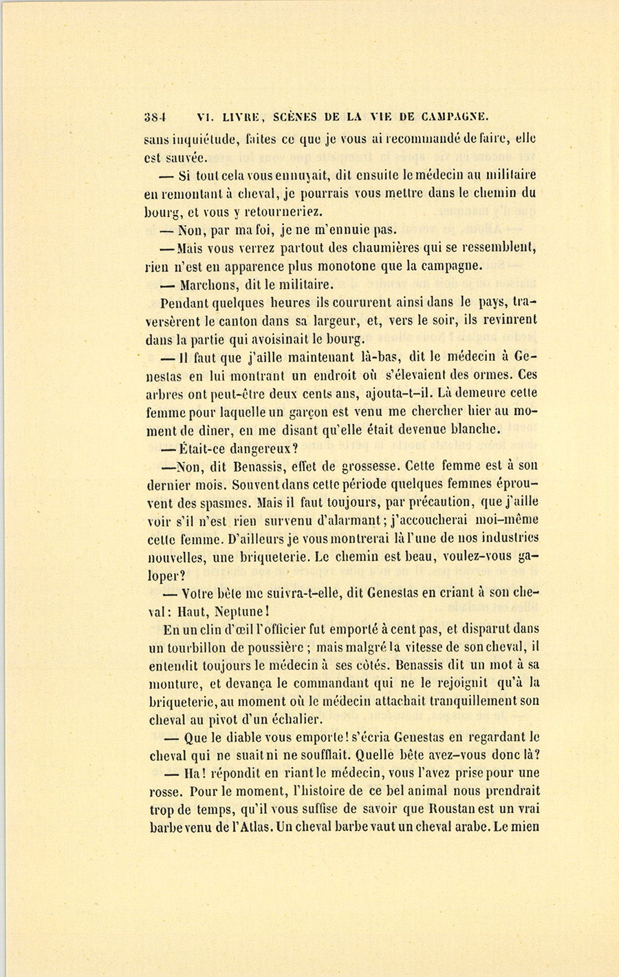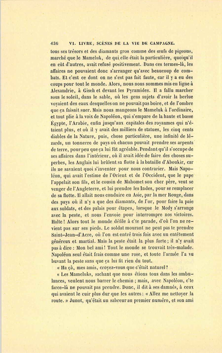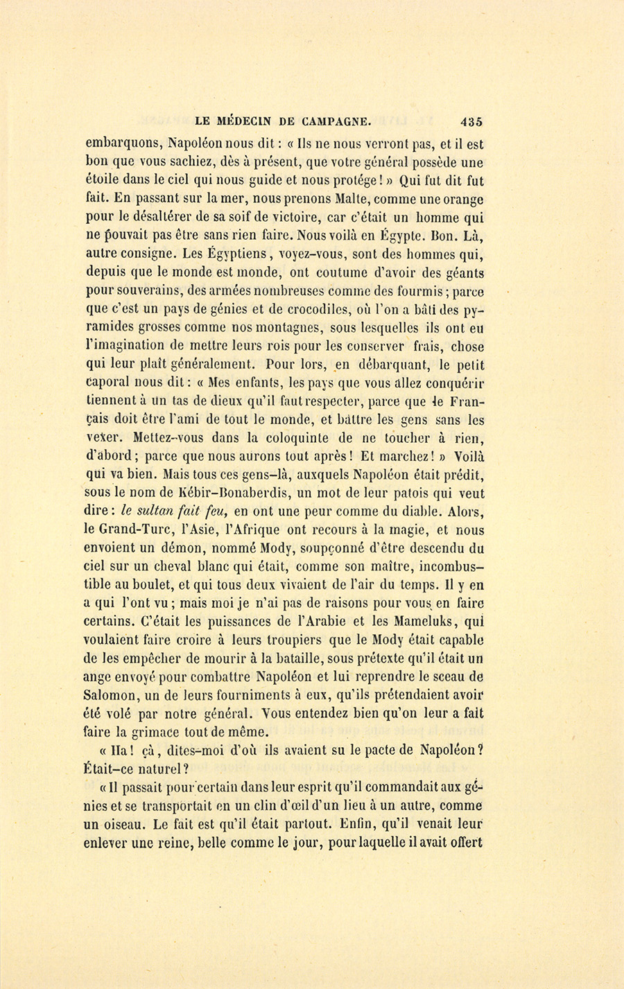 – Monsieur, répondit le militaire avec sa ténacité accoutumée, je vous donnerai donc dix francs par jour, et vous en ferez ce que {p. 328} vous voudrez. Cela posé, nous nous entendrons mieux, ajouta-t-il en prenant la main du médecin et la lui serrant avec une cordialité pénétrante. Malgré mes dix francs, vous verrez bien que je ne suis pas un Arabe.