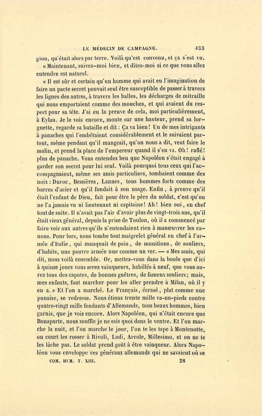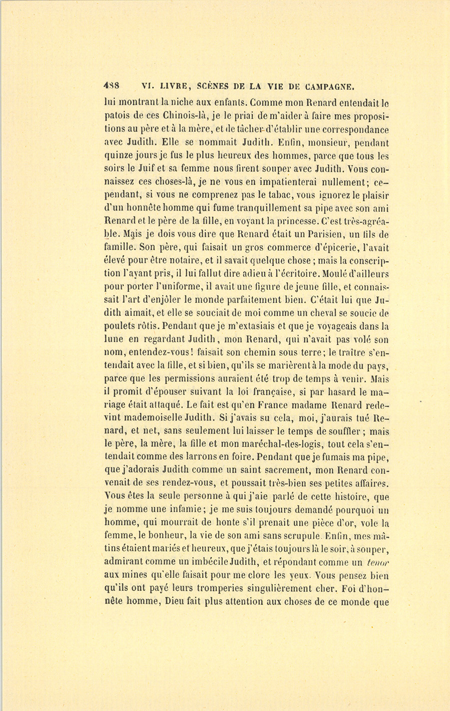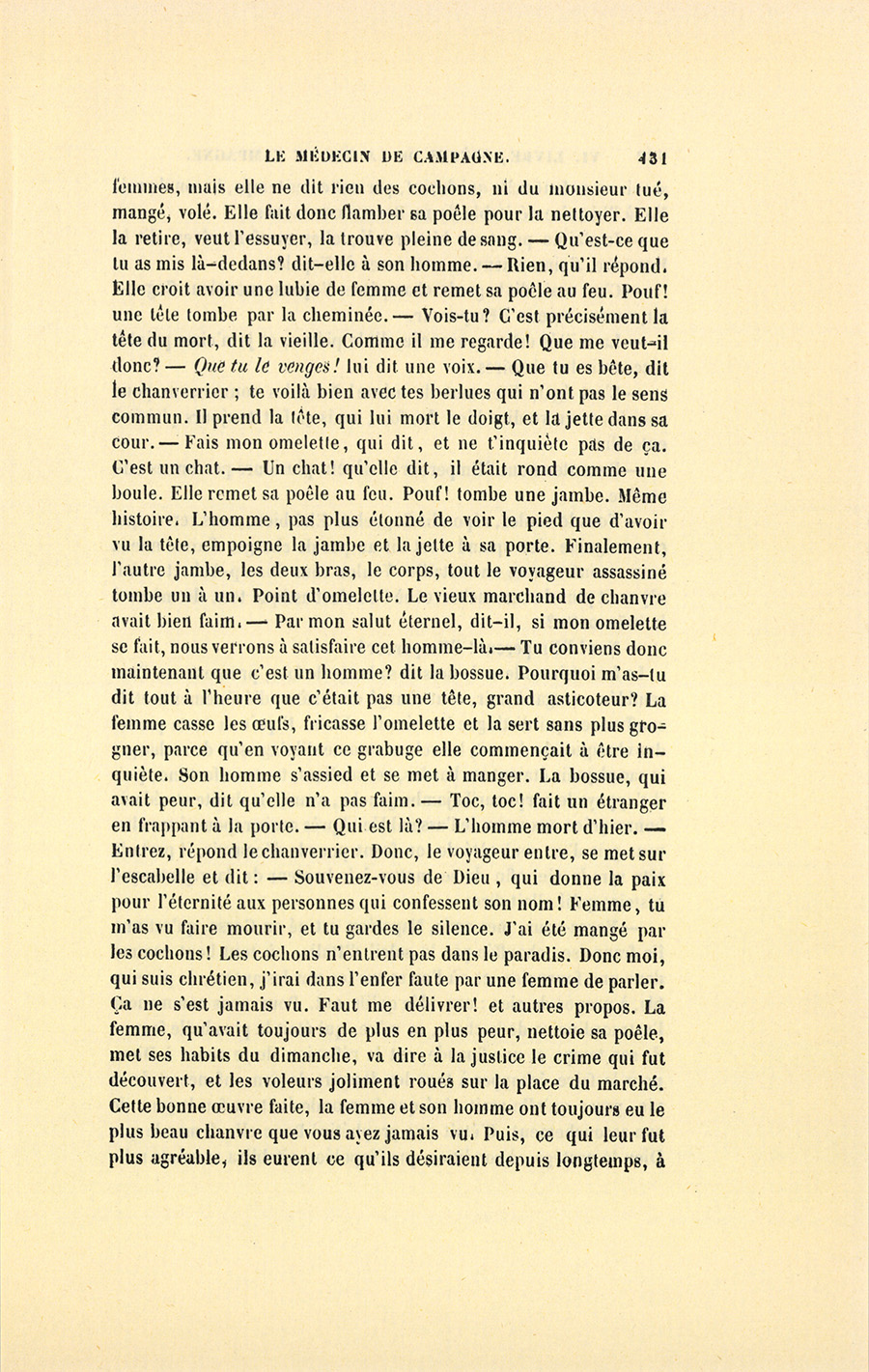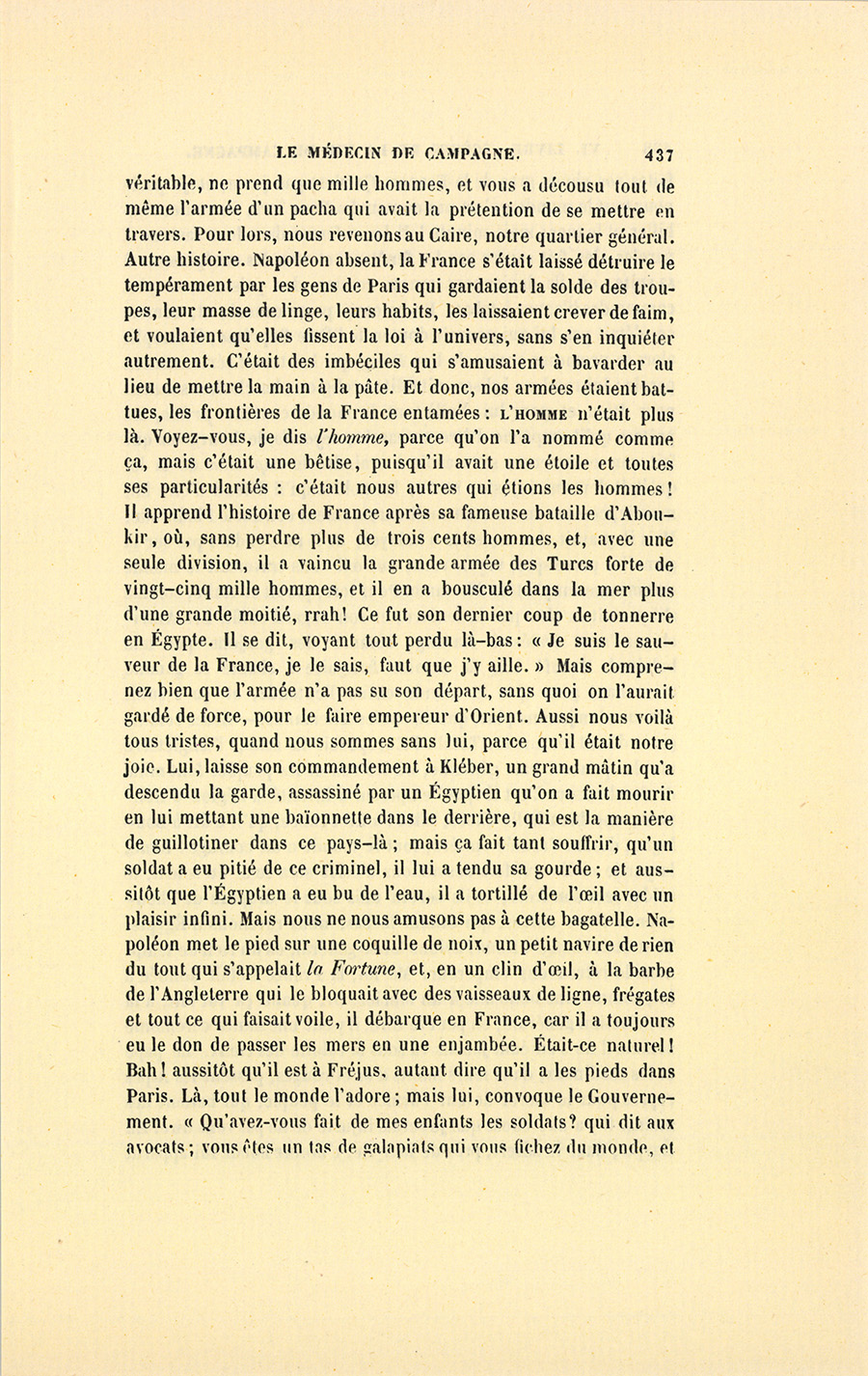 – Monsieur, répondit le militaire avec sa ténacité accoutumée, je vous donnerai donc dix francs par jour, et vous en ferez ce que {p. 328} vous voudrez. Cela posé, nous nous entendrons mieux, ajouta-t-il en prenant la main du médecin et la lui serrant avec une cordialité pénétrante. Malgré mes dix francs, vous verrez bien que je ne suis pas un Arabe.