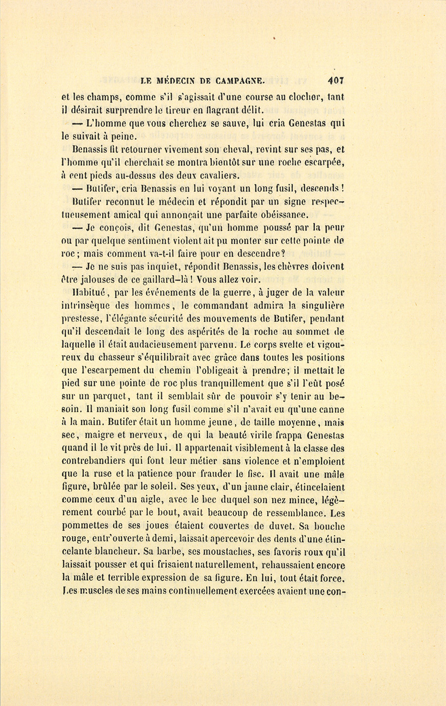 Benassis était un homme de taille ordinaire, mais large des épaules et large de poitrine. Une ample redingote verte, boutonnée jusqu’au cou, empêcha l’officier de saisir les détails si caractéristiques de ce personnage ou de son maintien ; mais l’ombre et l’immobilité dans laquelle resta le corps servirent à faire ressortir la figure, alors {p. 320} fortement éclairée par un reflet des flammes. Cet homme avait un visage semblable à celui d’un satyre : même front légèrement cambré, mais plein de proéminences toutes plus ou moins significatives ; même nez retroussé, spirituellement fendu dans le bout ; mêmes pommettes saillantes. La bouche était sinueuse, les lèvres étaient épaisses et rouges. Le menton se relevait brusquement. Les yeux bruns et animés par un regard vif auquel la couleur nacrée du blanc de l’œil donnait un grand éclat, exprimaient des passions amorties. Les cheveux jadis noirs et maintenant gris, les rides profondes de son visage et ses gros sourcils déjà blanchis, son nez devenu bulbeux et veiné, son teint jaune et marbré par des taches rouges, tout annonçait en lui l’âge de cinquante ans et les rudes travaux de sa profession. L’officier ne put que présumer la capacité de la tête, alors couverte d’une casquette ; mais quoique cachée par cette coiffure, elle lui parut être une de ces têtes proverbialement nommées têtes carrées. Habitué, par les rapports qu’il avait eus avec les hommes d’énergie que rechercha Napoléon, à distinguer les traits des personnes destinées aux grandes choses, Genestas devina quelque mystère dans cette vie obscure, et se dit en voyant ce visage extraordinaire : – Par quel hasard est-il resté médecin de campagne ? Après avoir sérieusement observé cette physionomie qui, malgré ses analogies avec les autres figures humaines, trahissait une secrète existence en désaccord avec ses apparentes vulgarités, il partagea nécessairement l’attention que le médecin donnait au malade, et la vue de ce malade changea complétement le cours de ses réflexions.