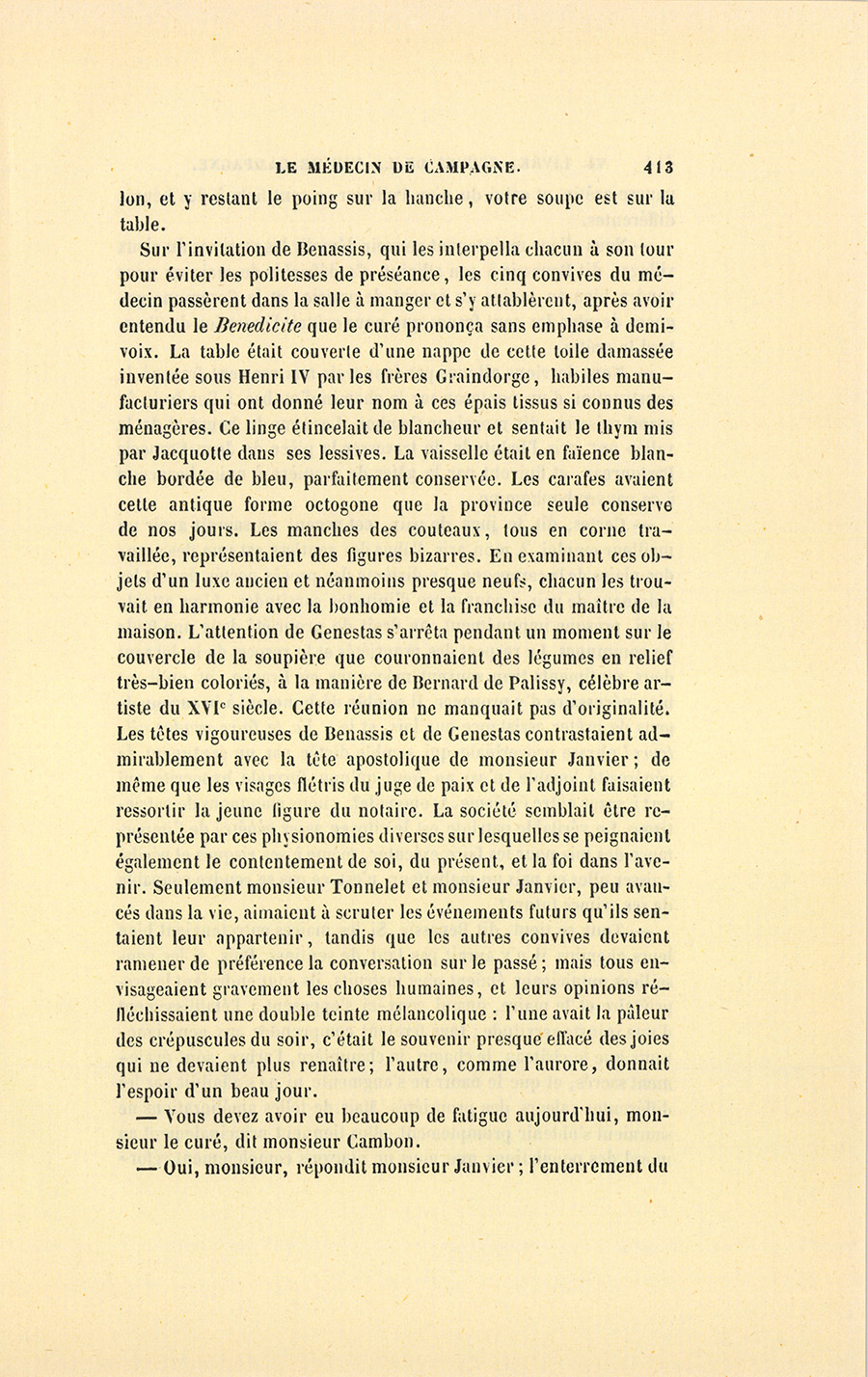 – À l’enterrement de ce pauvre petit Jacques, qu’est mon neveu. Ce petit chétif est mort hier matin. Il semblait vraiment que ce fût ce cher monsieur Benassis qui le soutînt. Tous ces jeunes, {p. 508} ça meurt ! ajouta Moreau d’un air moitié plaintif, moitié goguenard.