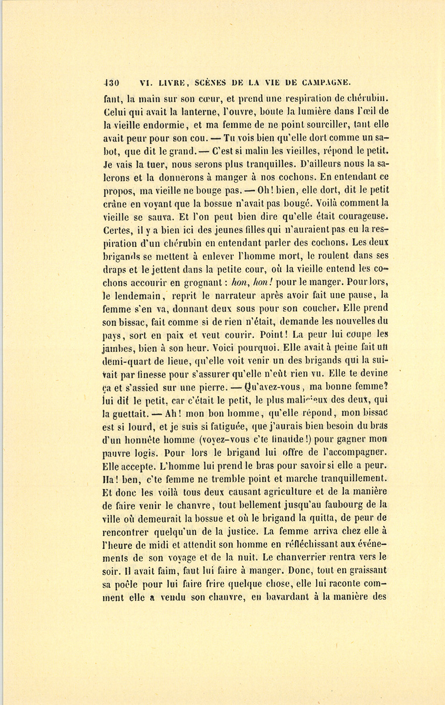 {p. 314} À cette demande la vieille leva la tête, regarda le soldat d’un air doucement goguenard, et répondit : – Si je les aime ! J’en ai déjà rendu trois, ajouta-t-elle en soupirant, je ne les garde que jusqu’à six ans.