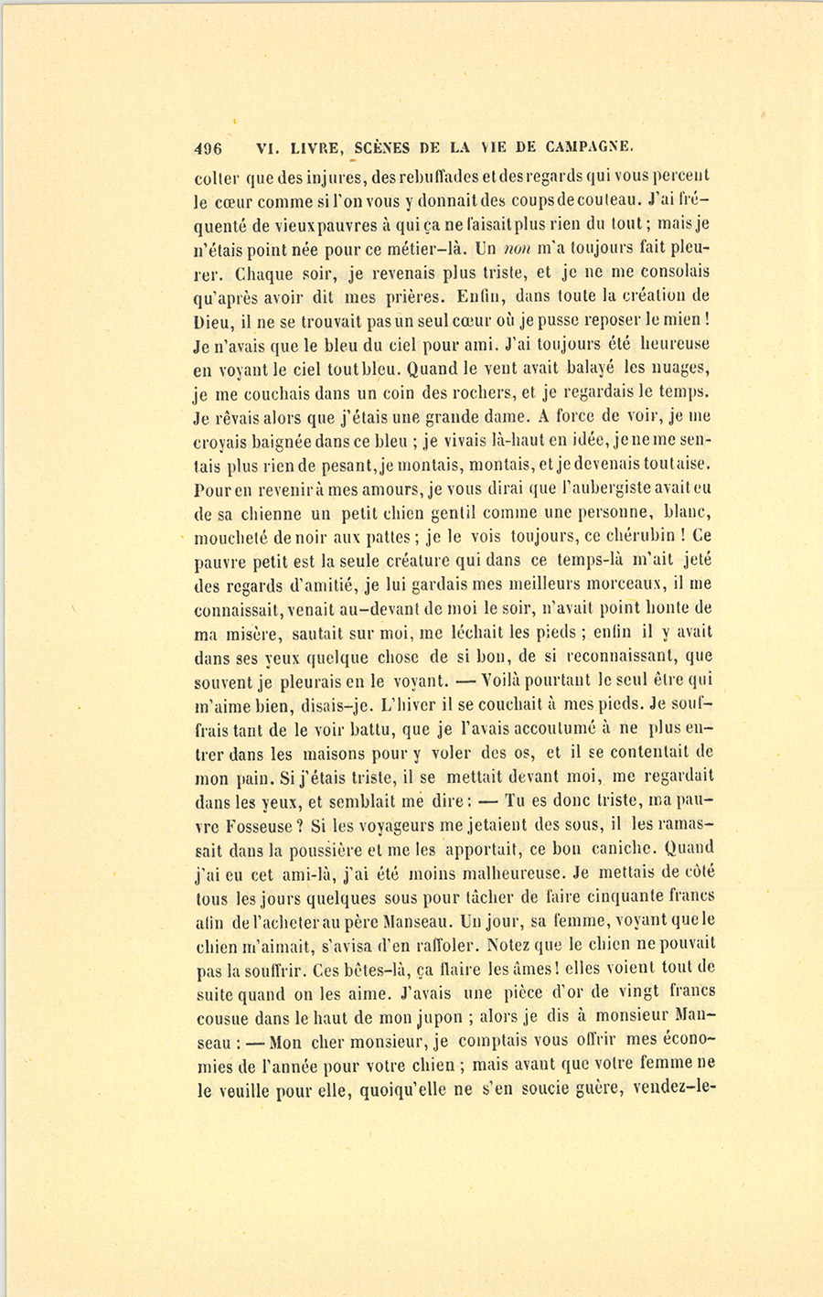 – À l’âge de seize ans, dit la Fosseuse, quoique je fusse malingre, j’étais forcée de mendier mon pain sur les routes de la Savoie. Je couchais aux Échelles, dans une grande crèche pleine de paille. L’aubergiste qui me logeait était un bon homme, mais sa femme ne pouvait pas me souffrir et m’injuriait toujours. Ça me faisait bien de la peine, car je n’étais pas une mauvaise pauvresse ; je priais Dieu soir et matin, je ne volais point, j’allais au commandement du ciel, demandant de quoi vivre, parce que je ne savais rien faire et que j’étais vraiment malade, tout à fait incapable de lever une houe ou de dévider du coton. Eh ! bien, je fus chassée de chez l’aubergiste à cause d’un chien. Sans parents, sans amis, depuis ma naissance, je n’avais jamais rencontré chez personne de regards qui me fissent du bien. La bonne femme Morin qui m’a élevée était morte, elle a été bien bonne pour moi ; mais je ne me souviens guère de ses caresses ; d’ailleurs, la pauvre vieille travaillait à la terre comme un homme ; et, si elle me dorlotait, elle me donnait aussi des coups de cuiller sur les doigts quand j’allais trop vite en mangeant notre soupe dans son écuelle. Pauvre vieille, il ne se passe point de jours que je ne la mette dans mes prières ! veuille le bon Dieu lui faire là-haut une vie plus heureuse qu’ici-bas, surtout un lit meilleur ; elle se plaignait toujours du grabat où nous couchions toutes les deux. Vous ne sauriez vous imaginer, mes chers messieurs, comme ça vous blesse l’âme que de ne {p. 496} récolter que des injures, des rebuffades et des regards qui vous percent le cœur comme si l’on vous y donnait des coups de couteau. J’ai fréquenté de vieux pauvres à qui ça ne faisait plus rien du tout ; mais je n’étais point née pour ce métier-là. Un non m’a toujours fait pleurer. Chaque soir, je revenais plus triste, et je ne me consolais qu’après avoir dit mes prières. Enfin, dans toute la création de Dieu, il ne se trouvait pas un seul cœur où je pusse reposer le mien ! Je n’avais que le bleu du ciel pour ami. J’ai toujours été heureuse en voyant le ciel tout bleu. Quand le vent avait balayé les nuages, je me couchais dans un coin des rochers, et je regardais le temps. Je rêvais alors que j’étais une grande dame. À force de voir, je me croyais baignée dans ce bleu ; je vivais là-haut en idée, je ne me sentais plus rien de pesant, je montais, montais, et je devenais tout aise. Pour en revenir à mes amours, je vous dirai que l’aubergiste avait eu de sa chienne un petit chien gentil comme une personne, blanc, moucheté de noir aux pattes ; je le vois toujours, ce chérubin ! Ce pauvre petit est la seule créature qui dans ce temps-là m’ait jeté des regards d’amitié, je lui gardais mes meilleurs morceaux, il me connaissait, venait au-devant de moi le soir, n’avait point honte de ma misère, sautait sur moi, me léchait les pieds ; enfin il y avait dans ses yeux quelque chose de si bon, de si reconnaissant, que souvent je pleurais en le voyant. – Voilà pourtant le seul être qui m’aime bien, disais-je. L’hiver il se couchait à mes pieds. Je souffrais tant de le voir battu, que je l’avais accoutumé à ne plus entrer dans les maisons pour y voler des os, et il se contentait de mon pain. Si j’étais triste, il se mettait devant moi, me regardait dans les yeux, et semblait me dire : – Tu es donc triste, ma pauvre Fosseuse ? Si les voyageurs me jetaient des sous, il les ramassait dans la poussière et me les apportait, ce bon caniche. Quand j’ai eu cet ami-là, j’ai été moins malheureuse. Je mettais de côté tous les jours quelques sous pour tâcher de faire cinquante francs afin de l’acheter au père Manseau. Un jour, sa femme, voyant que le chien m’aimait, s’avisa d’en raffoler. Notez que le chien ne pouvait pas la souffrir. Ces bêtes-là, ça flaire les âmes ! elles voient tout de suite quand on les aime. J’avais une pièce d’or de vingt francs cousue dans le haut de mon jupon ; alors je dis à monsieur Manseau : – Mon cher monsieur, je comptais vous offrir mes économies de l’année pour votre chien ; mais avant que votre femme ne le veuille pour elle, quoiqu’elle ne s’en soucie guère, vendez-le-moi {p. 497} vingt francs ; tenez, les voici. – Non, ma mignonne, me dit-il, serrez vos vingt francs. Le ciel me préserve de prendre l’argent des pauvres ! Gardez le chien. Si ma femme crie trop, allez-vous-en. Sa femme lui fit une scène pour le chien… ah ! mon Dieu, l’on aurait dit que le feu était à la maison ; et vous ne savez pas ce qu’elle imagina ? Voyant que le chien était à moi d’amitié, qu’elle ne pourrait jamais l’avoir, elle l’a fait empoisonner. Mon pauvre caniche est mort entre mes bras, je l’ai pleuré comme si c’eût été mon enfant, et je l’ai enterré sous un sapin. Vous ne savez pas tout ce que j’ai mis dans cette fosse. Je me suis dit, en m’asseyant là, que je serais donc toujours seule sur la terre, que rien ne me réussirait, que j’allais redevenir comme j’étais auparavant, sans personne au monde, et que je ne verrais pour moi d’amitié dans aucun regard. Je suis restée enfin là toute une nuit, à la belle étoile, priant Dieu de m’avoir en pitié. Quand je revins sur la route, je vis un petit pauvre de dix ans qui n’avait pas de mains. Le bon Dieu m’a exaucée, pensais-je. Je ne l’avais jamais prié comme je le fis pendant cette nuit-là. Je vais prendre soin de ce pauvre petit, me dis-je, nous mendierons ensemble et je serai sa mère ; à deux on doit mieux réussir ; j’aurai peut-être plus de courage pour lui que je n’en ai pour moi ! D’abord le petit a paru content, il lui aurait été bien difficile de ne pas l’être, je faisais tout ce qu’il voulait, je lui donnais ce que j’avais de meilleur, enfin j’étais son esclave, il me tyrannisait ; mais ça me semblait