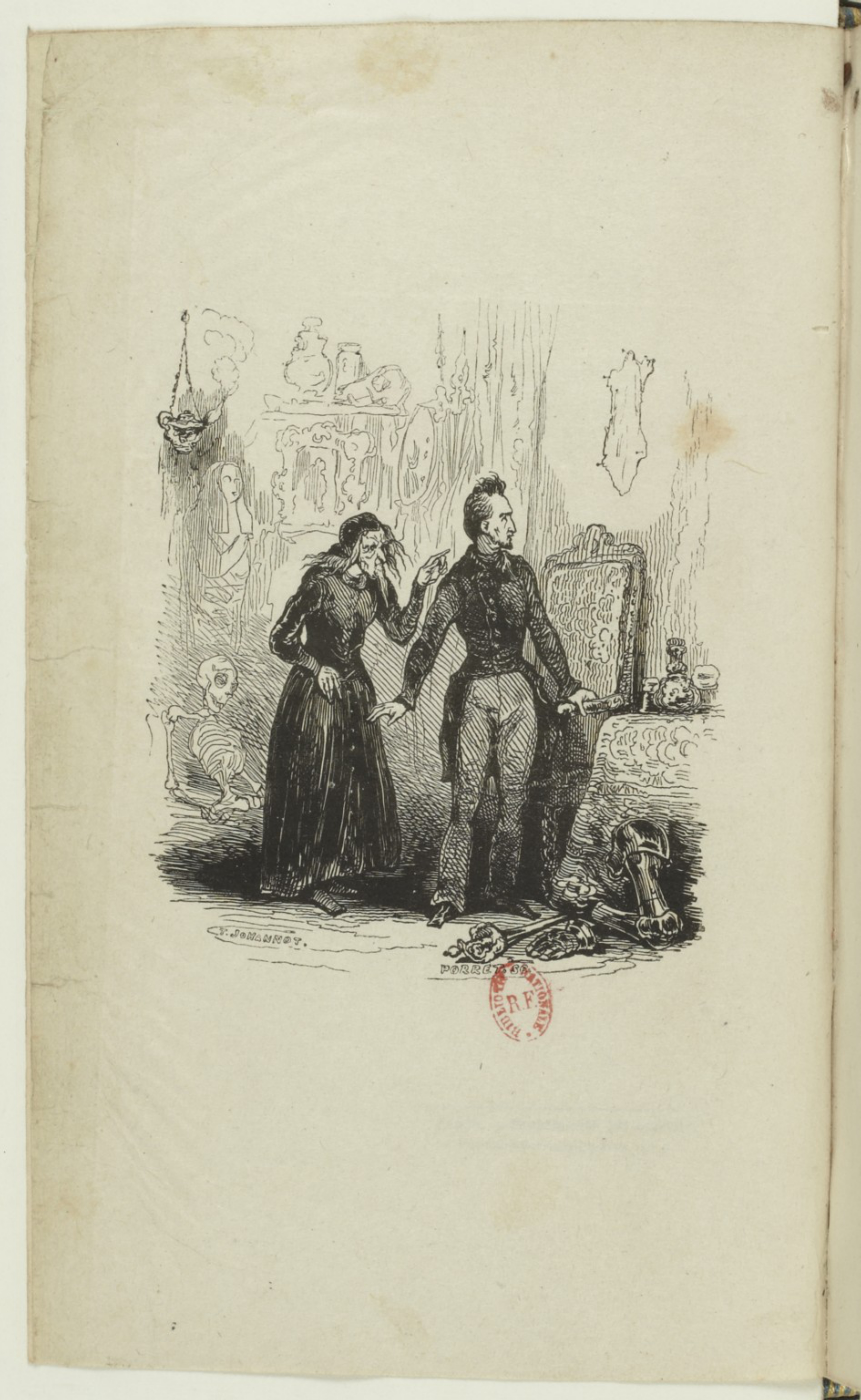 La jeune fille, croyant Valentin devenu fou, prit le talisman, et alla chercher la lampe ; puis, éclairée par la lueur vacillante, qui se projetait également sur Raphaël, elle examina très-attentivement le visage de son amant et la dernière parcelle de la peau magique.
