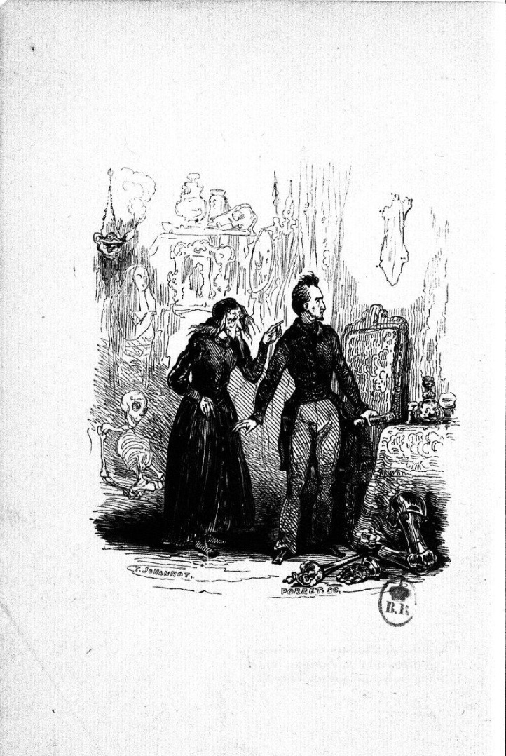 La jeune fille, croyant Valentin devenu fou, {p. 236}prit le talisman, et alla chercher la lampe ; puis, éclairée par la lueur vacillante, qui se projetait également sur Raphaël, elle examina très-attentivement le visage de son amant et la dernière parcelle de la peau magique.