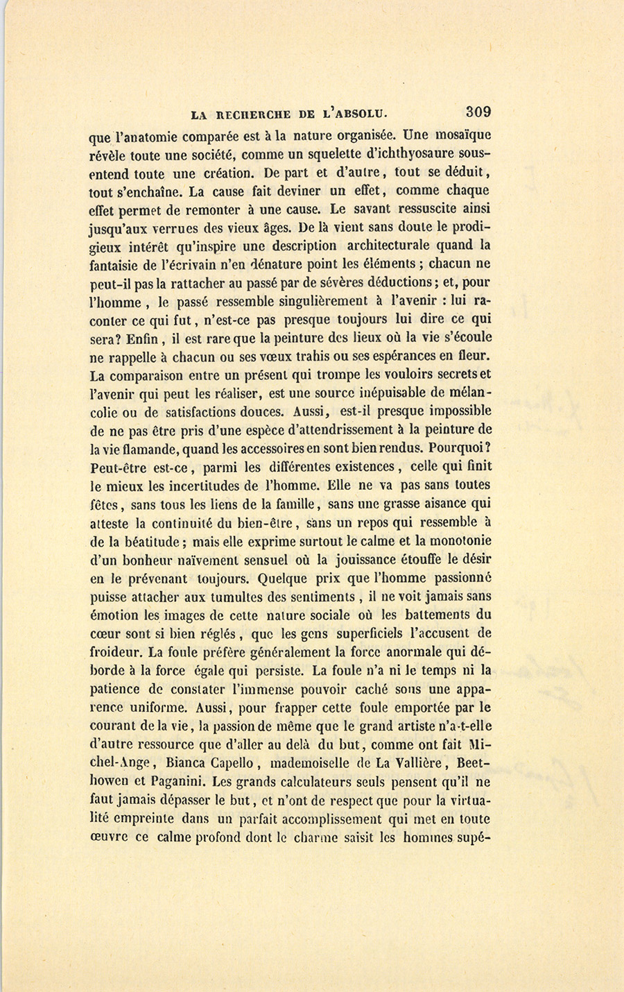 Claës ne répondit pas ; sa femme baissa la tête, joignit les mains et attendit, elle savait que ce silence n’accusait ni mépris ni dédain, mais de tyranniques préoccupations. Balthazar était un de ces êtres qui conservent long-temps au fond du cœur leur délicatesse juvénile, il se serait trouvé criminel d’exprimer la moindre pensée blessante à une femme accablée par le sentiment de sa disgrâce physique. Lui seul peut-être, parmi les hommes, savait qu’un mot, un regard peuvent effacer des années de bonheur, et sont d’autant plus cruels qu’ils contrastent plus fortement avec une {p. 324} douceur constante ; car notre nature nous porte à ressentir plus de douleur d’une dissonance dans la félicité, que nous n’éprouvons de plaisir à rencontrer une jouissance dans le malheur. Quelques instants après, Balthazar parut se réveiller, regarda vivement autour de lui, et dit : – Vêpres ? Ha ! les enfants sont à vêpres. Il fit quelques pas pour jeter les yeux sur le jardin où s’élevaient de toutes parts de magnifiques tulipes ; mais il s’arrêta tout à coup comme s’il se fût heurté contre un mur, et s’écria : – Pourquoi ne se combineraient-ils pas dans un temps donné ?