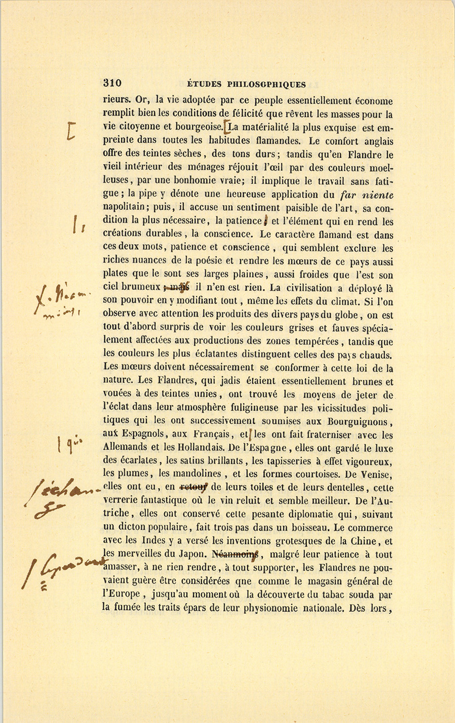 Après s’être assimilé, par la constante économie de sa conduite, les richesses et les idées de ses maîtres ou de ses voisins, ce pays, si nativement terne et dépourvu de poésie, se composa une vie originale et des mœurs caractéristiques, sans paraître entaché de servilité. L’Art y dépouilla toute idéalité pour reproduire uniquement la Forme. Aussi ne demandez à cette patrie de la poésie plastique, ni la verve de la comédie, ni l’action dramatique, ni les jets hardis de l’épopée ou de l’ode, ni le génie musical ; mais elle est fertile en découvertes, en discussions doctorales qui veulent et le temps et la lampe. Tout y est frappé au coin de la jouissance temporelle. L’homme y voit exclusivement ce qui est, sa pensée se courbe si scrupuleusement à servir les besoins de la vie qu’en aucune œuvre elle ne s’est élancée au delà du monde réel. La seule idée d’avenir conçue par ce peuple fut une sorte d’économie en politique, sa force révolutionnaire vint du désir domestique d’avoir les coudées franches à table et son aise complète sous l’auvent de ses steedes. Le sentiment du bien-être et l’esprit d’indépendance qu’inspire la fortune engendrèrent, là plus tôt qu’ailleurs, ce besoin de liberté qui plus tard travailla l’Europe. Aussi, la constance de leurs idées et la ténacité que l’éducation donne aux Flamands, en firent-elles autrefois des hommes redoutables dans la défense de leurs droits. Chez ce peuple, rien donc ne se façonne à demi, ni les maisons, ni les meubles, ni la digue, ni la culture, ni la révolte. Aussi garde-t-il le monopole de ce qu’il entreprend. La fabrication de la dentelle, œuvre de patiente agriculture et de plus patiente industrie, celle de sa toile sont héréditaires comme ses fortunes patrimoniales. S’il fallait peindre la constance sous la forme humaine la plus pure, peut-être serait-on dans le vrai, en prenant le portrait d’un bon bourgmestre des Pays-Bas, capable, comme il s’en est tant rencontré, de mourir bourgeoisement et sans éclat pour les intérêts de sa Hanse. Mais les douces poésies de cette vie patriarcale se retrouveront naturellement dans la peinture d’une des dernières maisons qui, au temps où cette histoire commence, en conservaient encore le caractère à Douai.