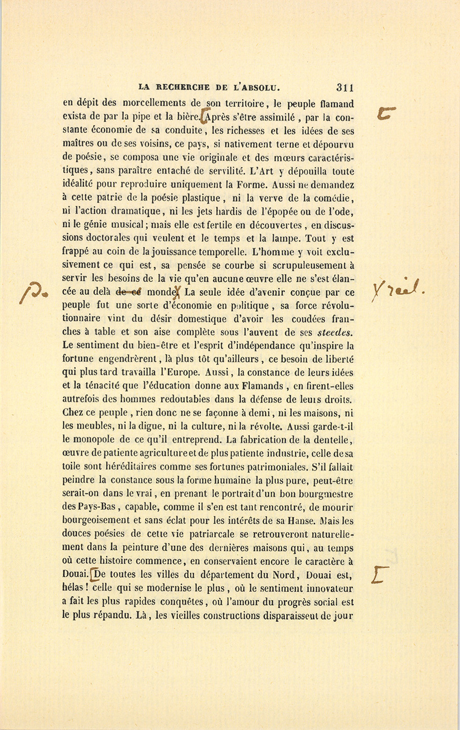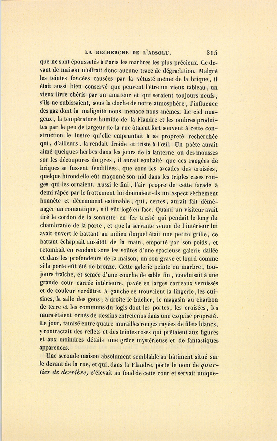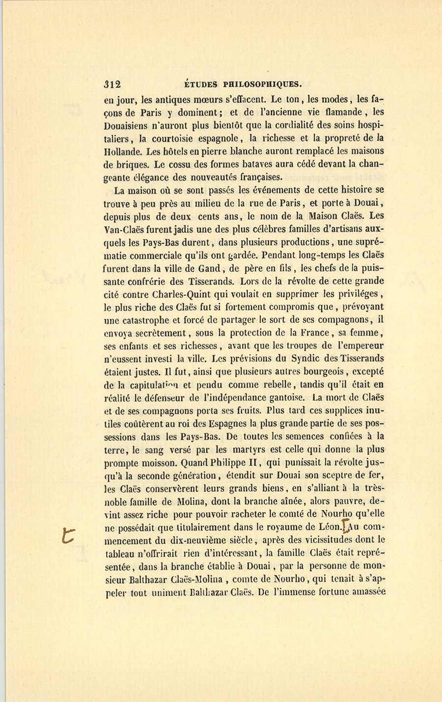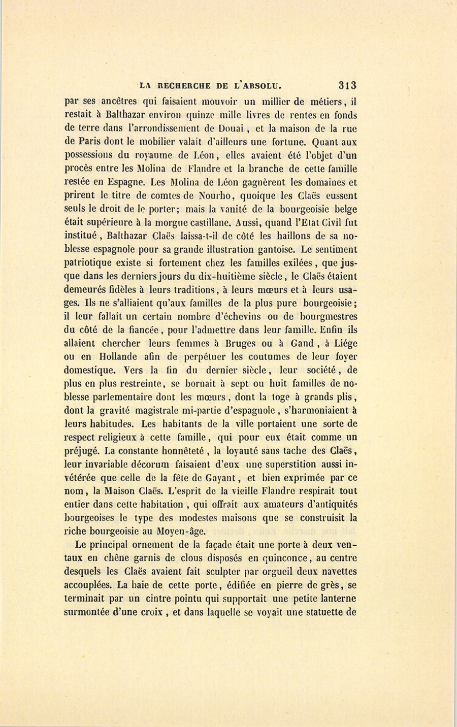 Au commencement du dix-neuvième siècle, après des vicissitudes dont le tableau n’offrirait rien d’intéressant, la famille Claës était représentée, dans la branche établie à Douai, par la personne de monsieur Balthazar Claës-Molina, comte de Nourho, qui tenait à s’appeler tout uniment Balthazar Claës. De l’immense fortune amassée {p. 313} par ses ancêtres qui faisaient mouvoir un millier de métiers, il restait à Balthazar environ quinze mille livres de rentes en fonds de terre dans l’arrondissement de Douai, et la maison de la rue de Paris dont le mobilier valait d’ailleurs une fortune. Quant aux possessions du royaume de Léon, elles avaient été l’objet d’un procès entre les Molina de Flandre et la branche de cette famille restée en Espagne. Les Molina de Léon gagnèrent les domaines et prirent le titre de comtes de Nourho, quoique les Claës eussent seuls le droit de le porter ; mais la vanité de la bourgeoisie belge était supérieure à la morgue castillane. Aussi, quand l’État Civil fut institué, Balthazar Claës laissa-t-il de côté les haillons de sa noblesse espagnole pour sa grande illustration gantoise. Le sentiment patriotique existe si fortement chez les familles exilées, que jusque dans les derniers jours du dix-huitième siècle, les Claës étaient demeurés fidèles à leurs traditions, à leurs mœurs et à leurs usages. Ils ne s’alliaient qu’aux familles de la plus pure bourgeoisie ; il leur fallait un certain nombre d’échevins ou de bourgmestres du côté de la fiancée, pour l’admettre dans leur famille. Enfin ils allaient chercher leurs femmes à Bruges ou à Gand, à Liége ou en Hollande afin de perpétuer les coutumes de leur foyer domestique. Vers la fin du dernier siècle, leur société, de plus en plus restreinte, se bornait à sept ou huit familles de noblesse parlementaire dont les mœurs, dont la toge à grands plis, dont la gravité magistrale mi-partie d’espagnole, s’harmoniaient à leurs habitudes. Les habitants de la ville portaient une sorte de respect religieux à cette famille, qui pour eux était comme un préjugé. La constante honnêteté, la loyauté sans tache des Claës, leur invariable décorum faisaient d’eux une superstition aussi invétérée que celle de la fête de Gayant, et bien exprimée par ce nom, la Maison Claës. L’esprit de la vieille Flandre respirait tout entier dans cette habitation, qui offrait aux amateurs d’antiquités bourgeoises le type des modestes maisons que se construisit la riche bourgeoisie au Moyen-âge.