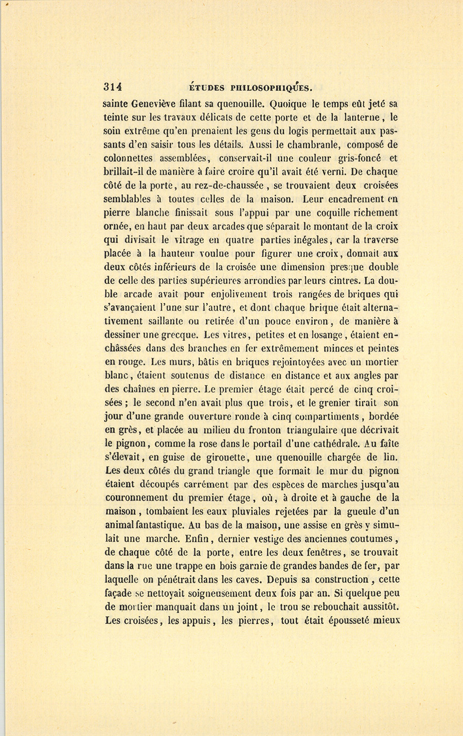 Le principal ornement de la façade était une porte à deux ventaux en chêne garnis de clous disposés en quinconce, au centre desquels les Claës avaient fait sculpter par orgueil deux navettes accouplées. La baie de cette porte, édifiée en pierre de grès, se terminait par un cintre pointu qui supportait une petite lanterne surmontée d’une croix, et dans laquelle se voyait une statuette de {p. 314} sainte Geneviève filant sa quenouille. Quoique le temps eût jeté sa teinte sur les travaux délicats de cette porte et de la lanterne, le soin extrême qu’en prenaient les gens du logis permettait aux passants d’en saisir tous les détails. Aussi le chambranle, composé de colonnettes assemblées, conservait-il une couleur gris-foncé et brillait-il de manière à faire croire qu’il avait été verni. De chaque côté de la porte, au rez-de-chaussée, se trouvaient deux croisées semblables à toutes celles de la maison. Leur encadrement en pierre blanche finissait sous l’appui par une coquille richement ornée, en haut par deux arcades que séparait le montant de la croix qui divisait le vitrage en quatre parties inégales, car la traverse placée à la hauteur voulue pour figurer une croix, donnait aux deux côtés inférieurs de la croisée une dimension presque double de celle des parties supérieures arrondies par leurs cintres. La double arcade avait pour enjolivement trois rangées de briques qui s’avançaient l’une sur l’autre, et dont chaque brique était alternativement saillante ou retirée d’un pouce environ, de manière à dessiner une grecque. Les vitres, petites et en losange, étaient enchâssées dans des branches en fer extrêmement minces et peintes en rouge. Les murs, bâtis en briques rejointoyées avec un mortier blanc, étaient soutenus de distance en distance et aux angles par des chaînes en pierre. Le premier étage était percé de cinq croisées ; le second n’en avait plus que trois, et le grenier tirait son jour d’une grande ouverture ronde à cinq compartiments, bordée en grès, et placée au milieu du fronton triangulaire que décrivait le pignon, comme la rose dans le portail d’une cathédrale. Au faîte s’élevait, en guise de girouette, une quenouille chargée de lin. Les deux côtés du grand triangle que formait le mur du pignon étaient découpés carrément par des espèces de marches jusqu’au couronnement du premier étage, où, à droite et à gauche de la maison, tombaient les eaux pluviales rejetées par la gueule d’un animal fantastique. Au bas de la maison, une assise en grès y simulait une marche. Enfin, dernier vestige des anciennes coutumes, de chaque côté de la porte, entre les deux fenêtres, se trouvait dans la rue une trappe en bois garnie de grandes bandes de fer, par laquelle on pénétrait dans les caves. Depuis sa construction, cette façade se nettoyait soigneusement deux fois par an. Si quelque peu de mortier manquait dans un joint, le trou se rebouchait aussitôt. Les croisées, les appuis, les pierres, tout était épousseté mieux {p. 315} que ne sont époussetés à Paris les marbres les plus précieux. Ce devant de maison n’offrait donc aucune trace de dégradation. Malgré les teintes foncées causées par la vétusté même de la brique, il était aussi bien conservé que peuvent l’être un vieux tableau, un vieux livre chéris par un amateur et qui seraient toujours neufs, s’ils ne subissaient, sous la cloche de notre atmosphère, l’influence des gaz dont la malignité nous menace nous-mêmes. Le ciel nuageux, la température humide de la Flandre et les ombres produites par le peu de largeur de la rue ôtaient fort souvent à cette construction le lustre qu’elle empruntait à sa propreté recherchée qui, d’ailleurs, la rendait froide et triste à l’œil. Un poète aurait aimé quelques herbes dans les jours de la lanterne ou des mousses sur les découpures du grès, il aurait souhaité que ces rangées de briques se fussent fendillées, que sous les arcades des croisées, quelque hirondelle eût maçonné son nid dans les triples cases rouges qui les ornaient. Aussi le fini, l’air propre de cette façade à demi râpée par le frottement lui donnaient-ils un aspect sèchement honnête et décemment estimable, qui, certes, aurait fait déménager un romantique, s’il eût logé en face. Quand un visiteur avait tiré le cordon de la sonnette en fer tressé qui pendait le long du chambranle de la porte, et que la servante venue de l’intérieur lui avait ouvert le battant au milieu duquel était une petite grille, ce battant échappait aussitôt de la main, emporté par son poids, et retombait en rendant sous les voûtes d’une spacieuse galerie dallée et dans les profondeurs de la maison, un son grave et lourd comme si la porte eût été de bronze. Cette galerie peinte en marbre, toujours fraîche, et semée d’une couche de sable fin, conduisait à une grande cour carrée intérieure, pavée en larges carreaux vernissés et de couleur verdâtre. À gauche se trouvaient la lingerie, les cuisines, la salle des gens ; à droite le bûcher, le magasin au charbon de terre et les communs du logis dont les portes, les croisées, les murs étaient ornés de dessins entretenus dans une exquise propreté. Le jour, tamisé entre quatre murailles rouges rayées de filets blancs, y contractait des reflets et des teintes roses qui prêtaient aux figures et aux moindres détails une grâce mystérieuse et de fantastiques apparences.