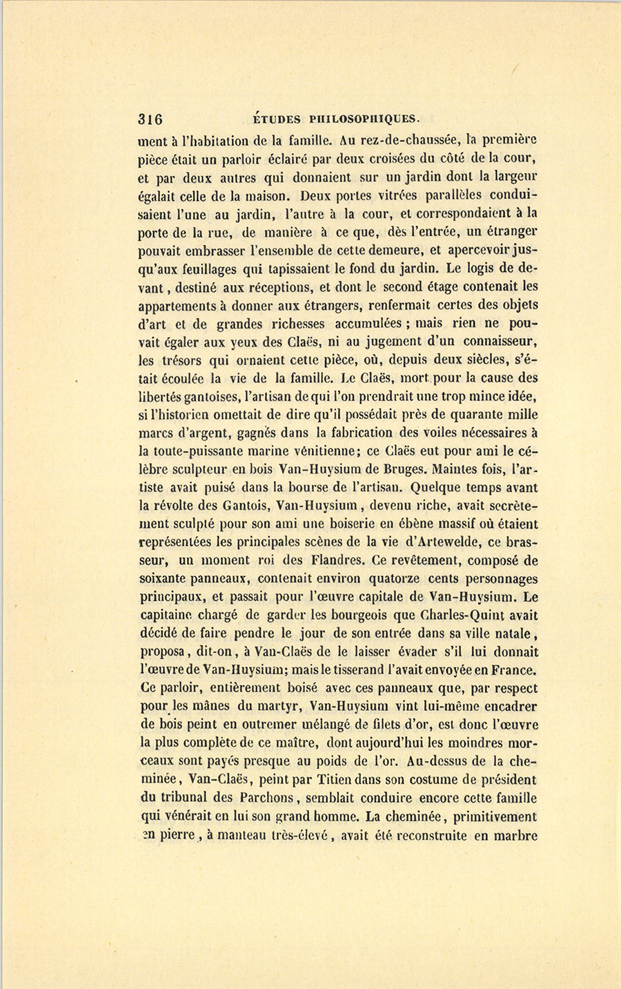 Une seconde maison absolument semblable au bâtiment situé sur le devant de la rue, et qui, dans la Flandre, porte le nom de quartier de derrière, s’élevait au fond de cette cour et servait {p. 316} uniquement à l’habitation de la famille. Au rez-de-chaussée, la première pièce était un parloir éclairé par deux croisées du côté de la cour, et par deux autres qui donnaient sur un jardin dont la largeur égalait celle de la maison. Deux portes vitrées parallèles conduisaient l’une au jardin, l’autre à la cour, et correspondaient à la porte de la rue, de manière à ce que, dès l’entrée, un étranger pouvait embrasser l’ensemble de cette demeure, et apercevoir jusqu’aux feuillages qui tapissaient le fond du jardin. Le logis de devant, destiné aux réceptions, et dont le second étage contenait les appartements à donner aux étrangers, renfermait certes des objets d’art et de grandes richesses accumulées ; mais rien ne pouvait égaler aux yeux des Claës, ni au jugement d’un connaisseur, les trésors qui ornaient cette pièce, où, depuis deux siècles, s’était écoulée la vie de la famille. Le Claës, mort pour la cause des libertés gantoises, l’artisan de qui l’on prendrait une trop mince idée, si l’historien omettait de dire qu’il possédait près de quarante mille marcs d’argent, gagnés dans la fabrication des voiles nécessaires à la toute-puissante marine vénitienne ; ce Claës eut pour ami le célèbre sculpteur en bois Van-Huysium de Bruges. Maintes fois, l’artiste avait puisé dans la bourse de l’artisan. Quelque temps avant la révolte des Gantois, Van-Huysium, devenu riche, avait secrètement sculpté pour son ami une boiserie en ébène massif où étaient représentées les principales scènes de la vie d’Artewelde, ce brasseur, un moment roi des Flandres. Ce revêtement, composé de soixante panneaux, contenait environ quatorze cents personnages principaux, et passait pour l’œuvre capitale de Van-Huysium. Le capitaine chargé de garder les bourgeois que Charles-Quint avait décidé de faire pendre le jour de son entrée dans sa ville natale, proposa, dit-on, à Van-Claës de le laisser évader s’il lui donnait l’œuvre de Van-Huysium ; mais le tisserand l’avait envoyée en France. Ce parloir, entièrement boisé avec ces panneaux que, par respect pour les mânes du martyr, Van-Huysium vint lui-même encadrer de bois peint en outremer mélangé de filets d’or, est donc l’œuvre la plus complète de ce maître, dont aujourd’hui les moindres morceaux sont payés presque au poids de l’or. Au-dessus de la cheminée, Van-Claës, peint par Titien dans son costume de président du tribunal des Parchons, semblait conduire encore cette famille qui vénérait en lui son grand homme. La cheminée, primitivement en pierre, à manteau très-élevé, avait été reconstruite en marbre {p. 317} blanc dans le dernier siècle, et supportait un vieux cartel et deux flambeaux à cinq branches contournées, de mauvais goût, mais en argent massif. Les quatre fenêtres étaient décorées de grands rideaux en damas rouge, à fleurs noires, doublés de soie blanche, et le meuble de même étoffe avait été renouvelé sous Louis XIV. Le parquet, évidemment moderne, était composé de grandes plaques de bois blanc encadrées par des bandes de chêne. Le plafond formé de plusieurs cartouches, au fond desquels était un mascaron ciselé par Van-Huysium, avait été respecté et conservait les teintes brunes du chêne de Hollande. Aux quatre coins de ce parloir s’élevaient des colonnes tronquées, surmontées par des flambeaux semblables à ceux de la cheminée, une table ronde en occupait le milieu. Le long des murs, étaient symétriquement rangées des tables à jouer. Sur deux consoles dorées, à dessus de marbre blanc, se trouvaient à l’époque où commence cette histoire deux globes de verre pleins d’eau dans lesquels nageaient sur un lit de sable et de coquillages des poissons rouges, dorés ou argentés. Cette pièce était à la fois brillante et sombre. Le plafond absorbait nécessairement la clarté, sans en rien refléter. Si du côté du jardin le jour abondait et venait papilloter dans les tailles de l’ébène, les croisées de la cour donnant peu de lumière, faisaient à peine briller les filets d’or imprimés sur les parois opposées. Ce parloir si magnifique par un beau jour était donc, la plupart du temps, rempli des teintes douces, des tons roux et mélancoliques que le soleil épanche sur la cime des forêts en automne. Il est inutile de continuer la description de la maison Claës dans les autres parties de laquelle se passeront nécessairement plusieurs scènes de cette histoire, il suffit, en ce moment, d’en connaître les principales dispositions.