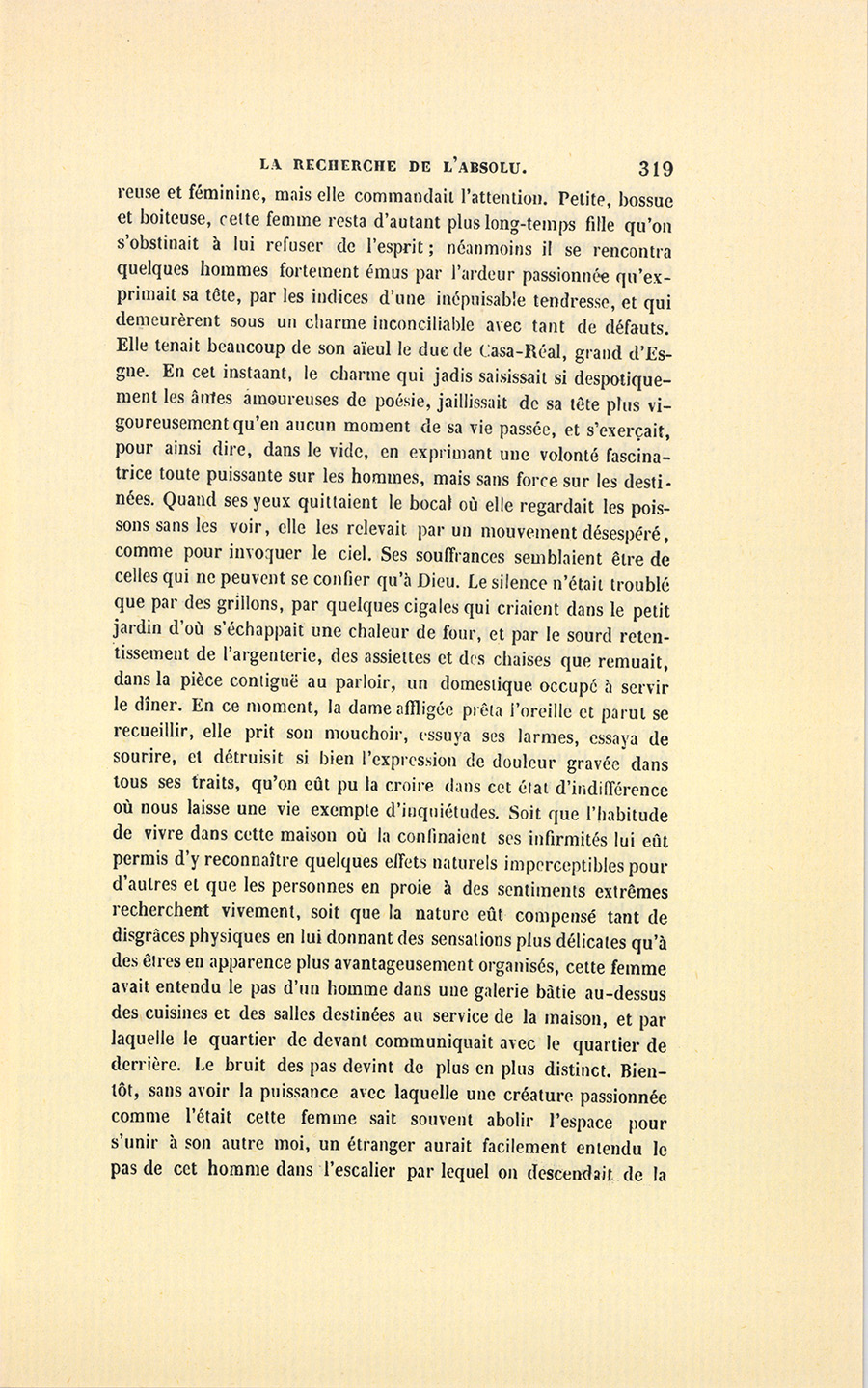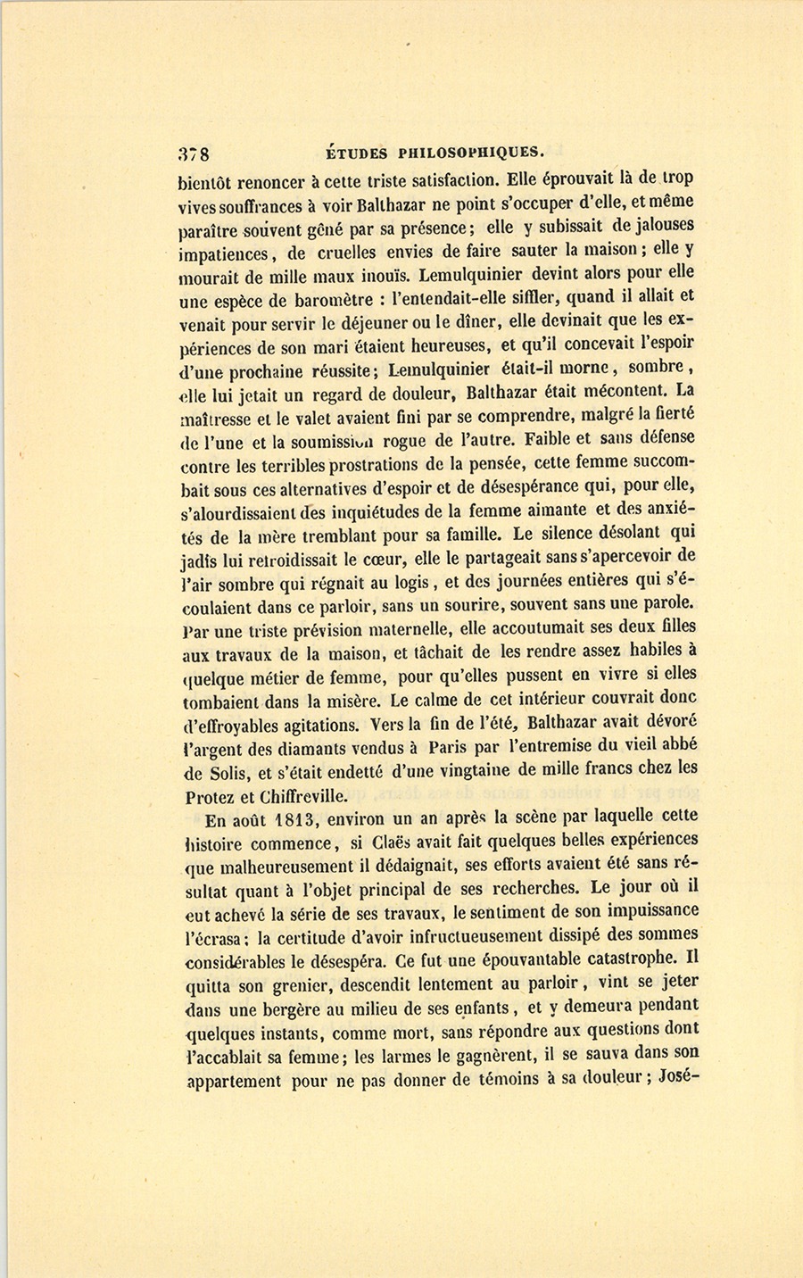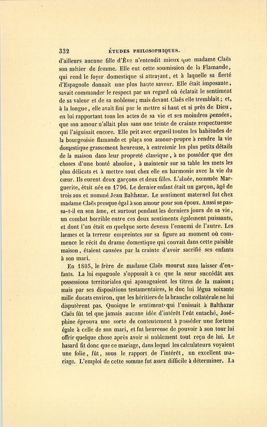 Pour donner plus d’intérêt à la scène que provoqua cette situation, il est indispensable de jeter un coup d’œil sur la vie antérieure de Balthazar Claës et de la petite-fille du duc de Casa-Réal.