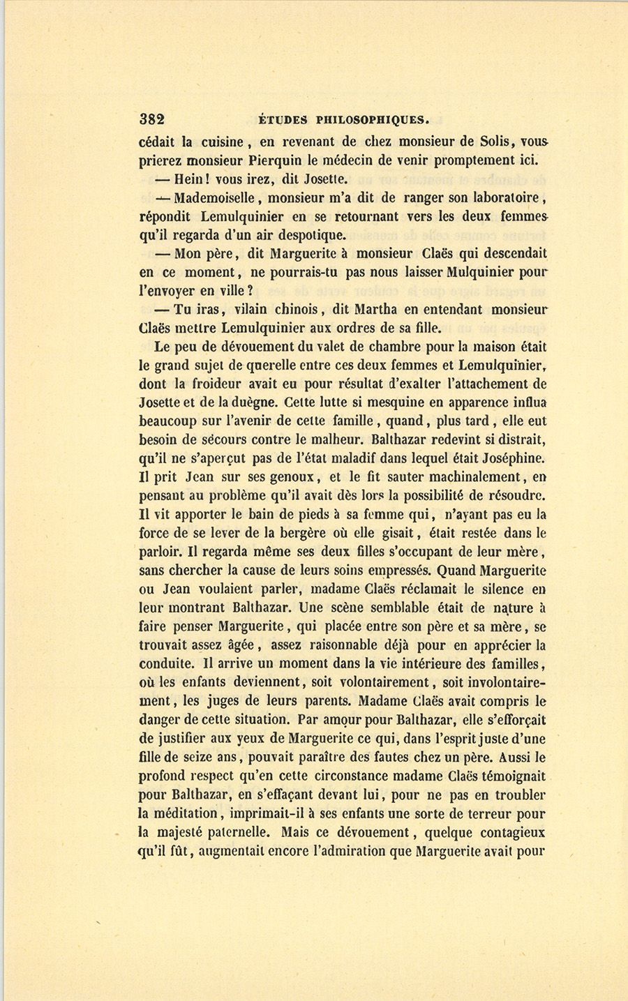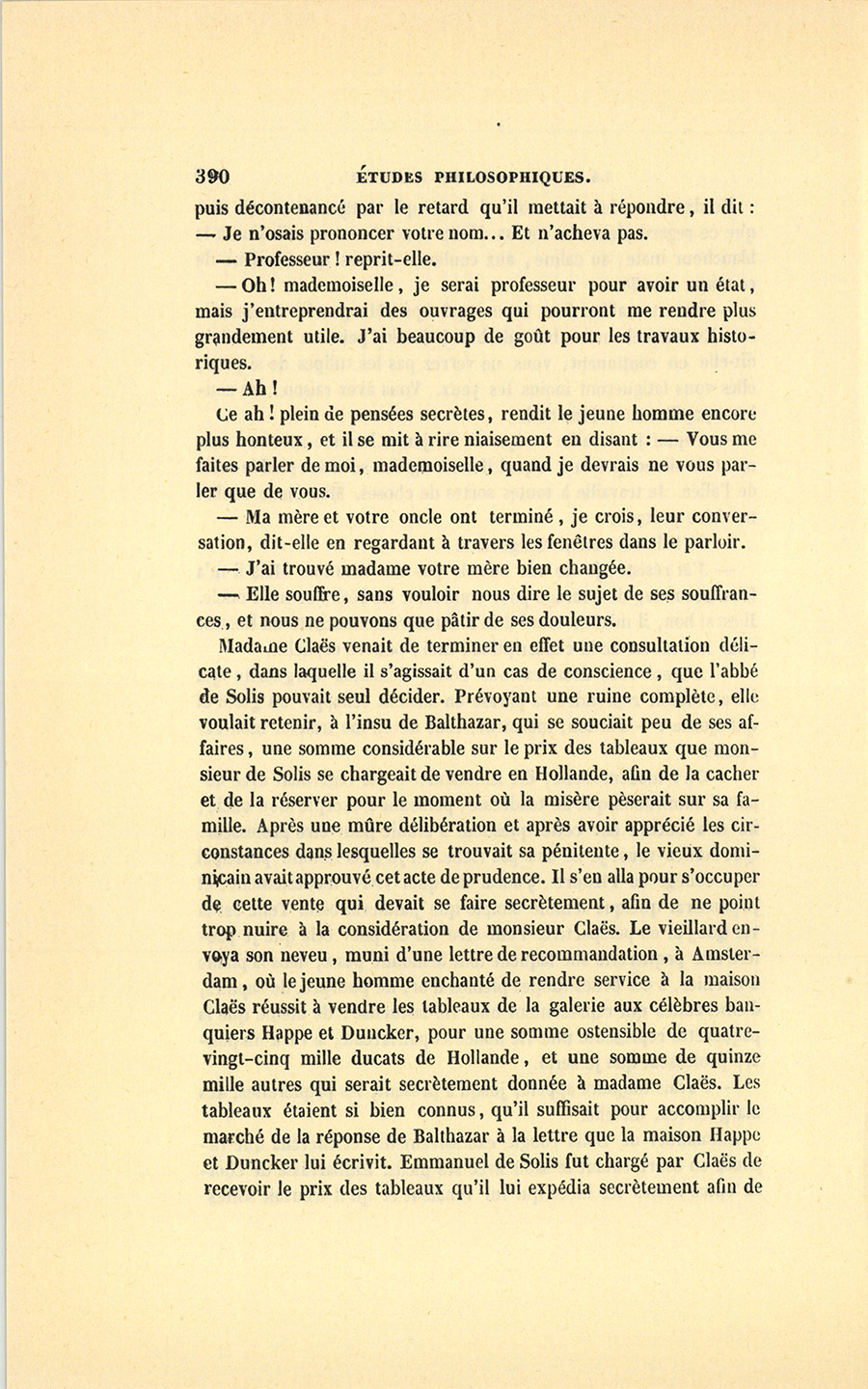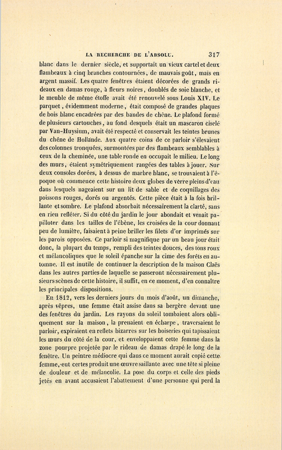Pour donner plus d’intérêt à la scène que provoqua cette situation, il est indispensable de jeter un coup d’œil sur la vie antérieure de Balthazar Claës et de la petite-fille du duc de Casa-Réal.