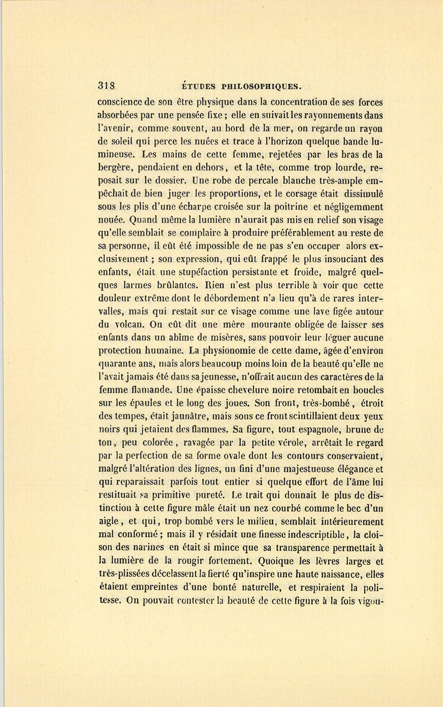 En 1812, vers les derniers jours du mois d’août, un dimanche, après vêpres, une femme était assise dans sa bergère devant une des fenêtres du jardin. Les rayons du soleil tombaient alors obliquement sur la maison, la prenaient en écharpe, traversaient le parloir, expiraient en reflets bizarres sur les boiseries qui tapissaient les murs du côté de la cour, et enveloppaient cette femme dans la zone pourpre projetée par le rideau de damas drapé le long de la fenêtre. Un peintre médiocre qui dans ce moment aurait copié cette femme, eût certes produit une œuvre saillante avec une tête si pleine de douleur et de mélancolie. La pose du corps et celle des pieds jetés en avant accusaient l’abattement d’une personne qui perd la {p. 318} conscience de son être physique dans la concentration de ses forces absorbées par une pensée fixe ; elle en suivait les rayonnements dans l’avenir, comme souvent, au bord de la mer, on regarde un rayon de soleil qui perce les nuées et trace à l’horizon quelque bande lumineuse. Les mains de cette femme, rejetées par les bras de la bergère, pendaient en dehors, et la tête, comme trop lourde, reposait sur le dossier. Une robe de percale blanche très-ample empêchait de bien juger les proportions, et le corsage était dissimulé sous les plis d’une écharpe croisée sur la poitrine et négligemment nouée. Quand même la lumière n’aurait pas mis en relief son visage qu’elle semblait se complaire à produire préférablement au reste de sa personne, il eût été impossible de ne pas s’en occuper alors exclusivement ; son expression, qui eût frappé le plus insouciant des enfants, était une stupéfaction persistante et froide, malgré quelques larmes brûlantes. Rien n’est plus terrible à voir que cette douleur extrême dont le débordement n’a lieu qu’à de rares intervalles, mais qui restait sur ce visage comme une lave figée autour du volcan. On eût dit une mère mourante obligée de laisser ses enfants dans un abîme de misères, sans pouvoir leur léguer aucune protection humaine. La physionomie de cette dame, âgée d’environ quarante ans, mais alors beaucoup moins loin de la beauté qu’elle ne l’avait jamais été dans sa jeunesse, n’offrait aucun des caractères de la femme flamande. Une épaisse chevelure noire retombait en boucles sur les épaules et le long des joues. Son front, très-bombé, étroit des tempes, était jaunâtre, mais sous ce front scintillaient deux yeux noirs qui jetaient des flammes. Sa figure, tout espagnole, brune de ton, peu colorée, ravagée par la petite vérole, arrêtait le regard par la perfection de sa forme ovale dont les contours conservaient, malgré l’altération des lignes, un fini d’une majestueuse élégance et qui reparaissait parfois tout entier si quelque effort de l’âme lui restituait sa primitive pureté. Le trait qui donnait le plus de distinction à cette figure mâle était un nez courbé comme le bec d’un aigle, et qui, trop bombé vers le milieu, semblait intérieurement mal conformé ; mais il y résidait une finesse indescriptible, la cloison des narines en était si mince que sa transparence permettait à la lumière de la rougir fortement. Quoique les lèvres larges et très-plissées décelassent la fierté qu’inspire une haute naissance, elles étaient empreintes d’une bonté naturelle, et respiraient la politesse. On pouvait contester la beauté de cette figure à la fois {p. 319} vigoureuse et féminine, mais elle commandait l’attention. Petite, bossue et boiteuse, cette femme resta d’autant plus long-temps fille qu’on s’obstinait à lui refuser de l’esprit ; néanmoins il se rencontra quelques hommes fortement émus par l’ardeur passionnée qu’exprimait sa tête, par les indices d’une inépuisable tendresse, et qui demeurèrent sous un charme inconciliable avec tant de défauts. Elle tenait beaucoup de son aïeul le duc de Casa-Réal, grand d’Espagne. En cet instant, le charme qui jadis saisissait si despotiquement les âmes amoureuses de poésie, jaillissait de sa tête plus vigoureusement qu’en aucun moment de sa vie passée, et s’exerçait, pour ainsi dire, dans le vide, en exprimant une volonté fascinatrice toute puissante sur les hommes, mais sans force sur les destinées. Quand ses yeux quittaient le bocal où elle regardait les poissons sans les voir, elle les relevait par un mouvement désespéré, comme pour invoquer le ciel. Ses souffrances semblaient être de celles qui ne peuvent se confier qu’à Dieu. Le silence n’était troublé que par des grillons, par quelques cigales qui criaient dans le petit jardin d’où s’échappait une chaleur de four, et par le sourd retentissement de l’argenterie, des assiettes et des chaises que remuait, dans la pièce contiguë au parloir, un domestique occupé à servir le dîner. En ce moment, la dame affligée prêta l’oreille et parut se recueillir, elle prit son mouchoir, essuya ses larmes, essaya de sourire, et détruisit si bien l’expression de douleur gravée dans tous ses traits, qu’on eût pu la croire dans cet état d’indifférence où nous laisse une vie exempte d’inquiétudes. Soit que l’habitude de vivre dans cette maison où la confinaient ses infirmités lui eût permis d’y reconnaître quelques effets naturels imperceptibles pour d’autres et que les personnes en proie à des sentiments extrêmes recherchent vivement, soit que la nature eût compensé tant de disgrâces physiques en lui donnant des sensations plus délicates qu’à des êtres en apparence plus avantageusement organisés, cette femme avait entendu le pas d’un homme dans une galerie bâtie au-dessus des cuisines et des salles destinées au service de la maison, et par laquelle le quartier de devant communiquait avec le quartier de derrière. Le bruit des pas devint de plus en plus distinct. Bientôt, sans avoir la puissance avec laquelle une créature p