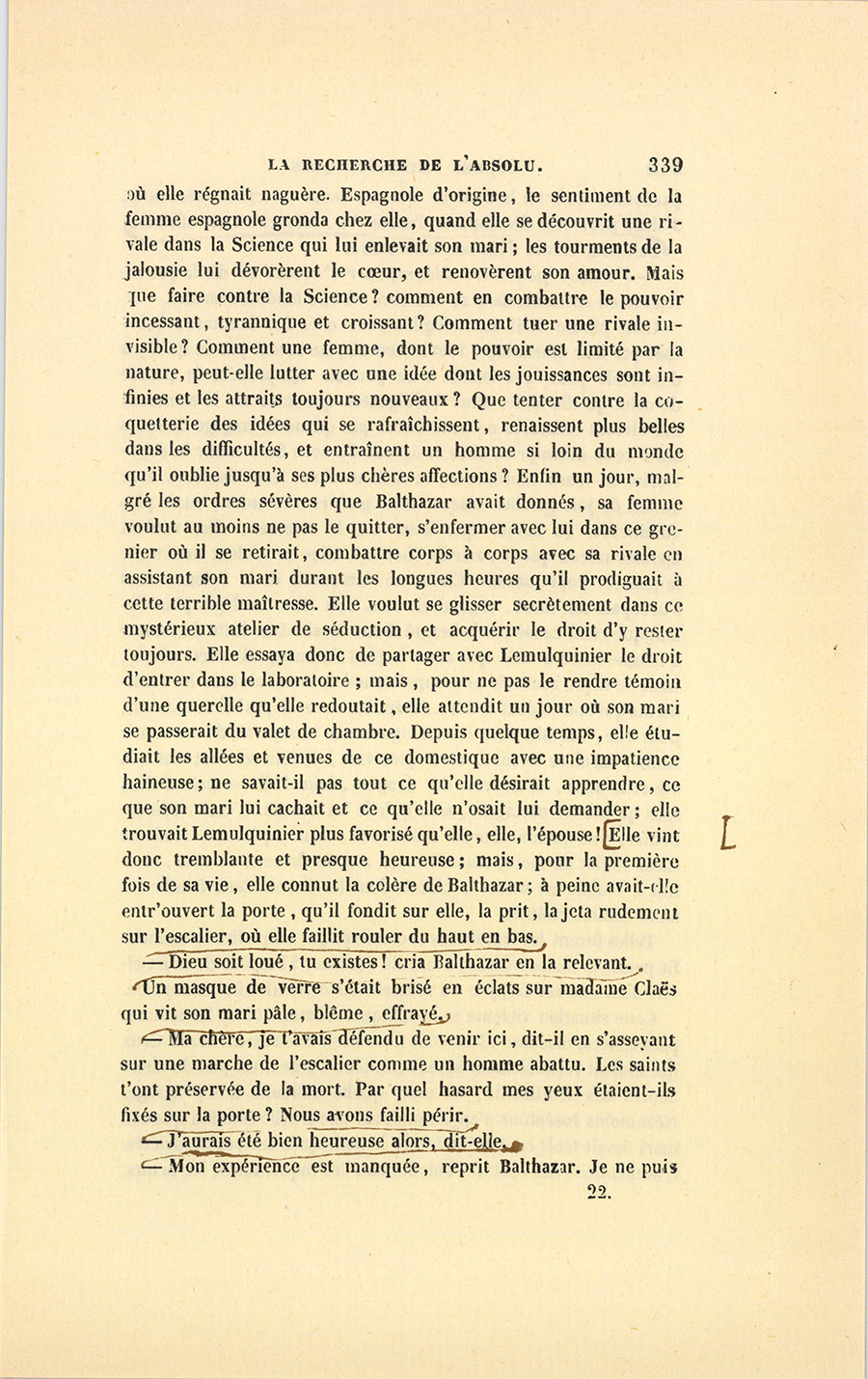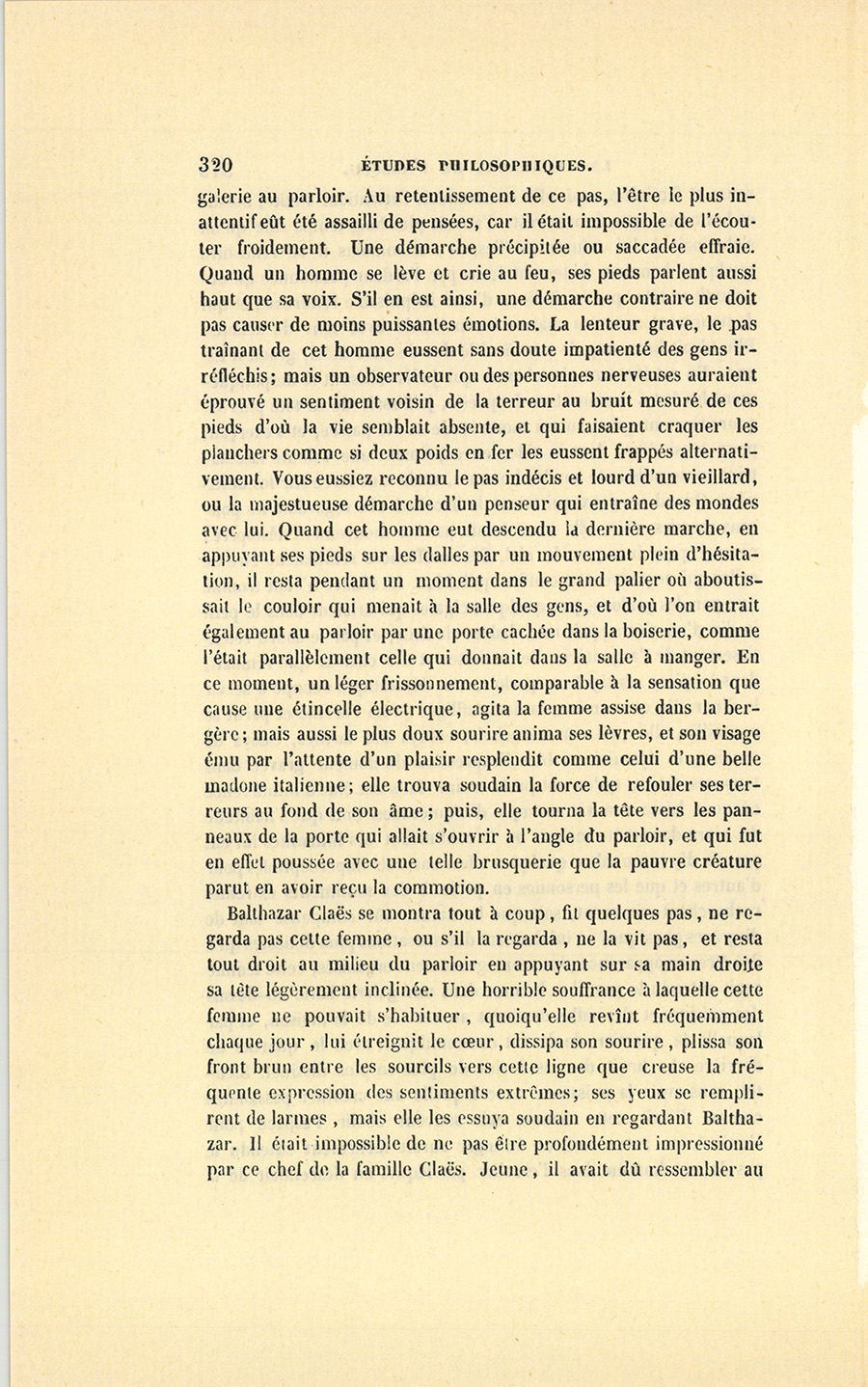 À cet aspect, Balthazar eut, comme tous les gens distraits, une vive réaction et devina pour ainsi dire le secret de cette crise, il prit aussitôt madame Claës dans ses bras, ouvrit la porte qui donnait sur la petite antichambre, et franchit si rapidement le vieil escalier de bois, que la robe de sa femme ayant accroché une gueule des tarasques qui formaient les balustres, il en resta un lé5 entier arraché à grand bruit. Il donna, pour l’ouvrir, un coup de pied à la porte du vestibule commun à leurs appartements ; mais il trouva la chambre de sa femme fermée.