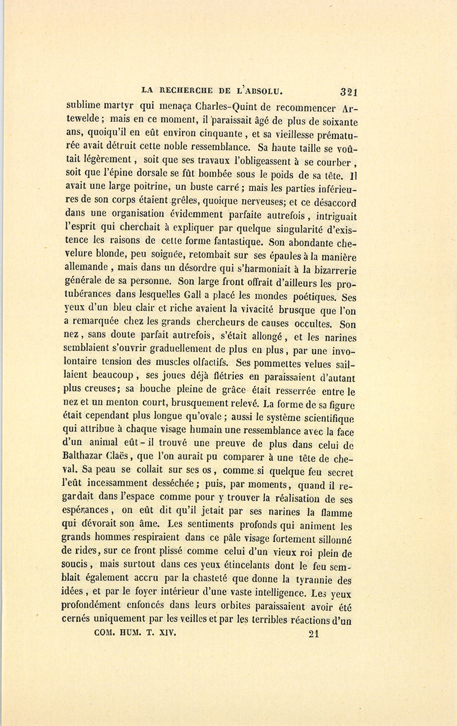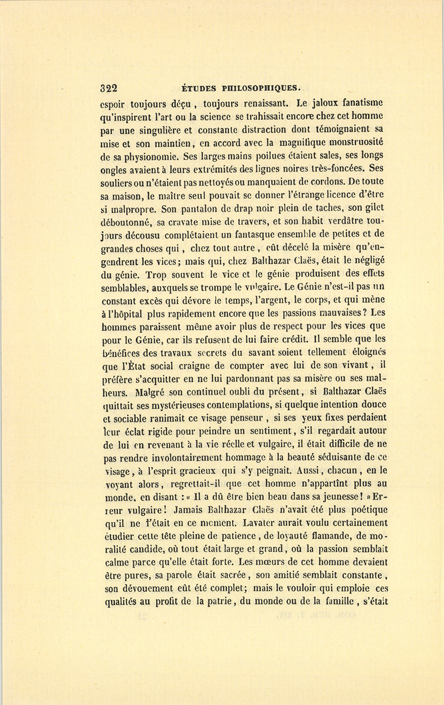 Balthazar Claës se montra tout à coup, fit quelques pas, ne regarda pas cette femme, ou s’il la regarda, ne la vit pas, et resta tout droit au milieu du parloir en appuyant sur sa main droite sa tête légèrement inclinée. Une horrible souffrance à laquelle cette femme ne pouvait s’habituer, quoiqu’elle revînt fréquemment chaque jour, lui étreignit le cœur, dissipa son sourire, plissa son front brun entre les sourcils vers cette ligne que creuse la fréquente expression des sentiments extrêmes ; ses yeux se remplirent de larmes, mais elle les essuya soudain en regardant Balthazar. Il était impossible de ne pas être profondément impressionné par ce chef de la famille Claës. Jeune, il avait dû ressembler au {p. 321} sublime martyr qui menaça Charles-Quint de recommencer Artewelde ; mais en ce moment, il paraissait âgé de plus de soixante ans, quoiqu’il en eût environ cinquante, et sa vieillesse prématurée avait détruit cette noble ressemblance. [ill.] Sa haute taille se voûtait légèrement, soit que ses travaux l’obligeassent à se courber, soit que l’épine dorsale se fût bombée sous le poids de sa tête. Il avait une large poitrine, un buste carré ; mais les parties inférieures de son corps étaient grêles, quoique nerveuses ; et ce désaccord dans une organisation évidemment parfaite autrefois, intriguait l’esprit qui cherchait à expliquer par quelque singularité d’existence les raisons de cette forme fantastique. Son abondante chevelure blonde, peu soignée, retombait sur ses épaules à la manière allemande, mais dans un désordre qui s’harmoniait à la bizarrerie générale de sa personne. Son large front offrait d’ailleurs les protubérances dans lesquelles Gall a placé les mondes poétiques. Ses yeux d’un bleu clair et riche avaient la vivacité brusque que l’on a remarquée chez les grands chercheurs de causes occultes. Son nez, sans doute parfait autrefois, s’était allongé, et les narines semblaient s’ouvrir graduellement de plus en plus, par une involontaire tension des muscles olfactifs. Ses pommettes velues saillaient beaucoup, ses joues déjà flétries en paraissaient d’autant plus creuses ; sa bouche pleine de grâce était resserrée entre le nez et un menton court, brusquement relevé. La forme de sa figure était cependant plus longue qu’ovale ; aussi le système scientifique qui attribue à chaque visage humain une ressemblance avec la face d’un animal eût-il trouvé une preuve de plus dans celui de Balthazar Claës, que l’on aurait pu comparer à une tête de cheval. Sa peau se collait sur ses os, comme si quelque feu secret l’eût incessamment desséchée ; puis, par moments, quand il regardait dans l’espace comme pour y trouver la réalisation de ses espérances, on eût dit qu’il jetait par ses narines la flamme qui dévorait son âme. Les sentiments profonds qui animent les grands hommes respiraient dans ce pâle visage fortement sillonné de rides, sur ce front plissé comme celui d’un vieux roi plein de soucis, mais surtout dans ces yeux étincelants dont le feu semblait également accru par la chasteté que donne la tyrannie des idées, et par le foyer intérieur d’une vaste intelligence. Les yeux profondément enfoncés dans leurs orbites paraissaient avoir été cernés uniquement par les veilles et par les terribles réactions d’un {p. 322} espoir toujours déçu, toujours renaissant. Le jaloux fanatisme qu’inspirent l’art ou la science se trahissait encore chez cet homme par une singulière et constante distraction dont témoignaient sa mise et son maintien, en accord avec la magnifique monstruosité de sa physionomie. Ses larges mains poilues étaient sales, ses longs ongles avaient à leurs extrémités des lignes noires très-foncées. Ses souliers ou n’étaient pas nettoyés ou manquaient de cordons. De toute sa maison, le maître seul pouvait se donner l’étrange licence d’être si malpropre. Son pantalon de drap noir plein de taches, son gilet déboutonné, sa cravate mise de travers, et son habit verdâtre toujours décousu complétaient un fantasque ensemble de petites et de grandes choses qui, chez tout autre, eût décelé la misère qu’engendrent les vices ; mais qui, chez Balthazar Claës, était le négligé du génie. Trop souvent le vice et le génie produisent des effets semblables, auxquels se trompe le vulgaire. Le Génie n’est-il pas un constant excès qui dévore le temps, l’argent, le corps, et qui mène à l’hôpital plus rapidement encore que les passions mauvaises ? Les hommes paraissent même avoir plus de respect pour les vices que pour le Génie, car ils refusent de lui faire crédit. Il semble que les bénéfices des travaux secrets du savant soient tellement éloignés que l’État social craigne de compter avec lui de son vivant, il préfère s’acquitter en ne lui pardonnant pas sa misère ou ses malheurs. Malgré son continuel oubli du présent, si Balthazar Claës quittait ses mystérieuses contemplations, si quelque intention douce et sociable ranimait ce visage penseur, si ses yeux fixes perdaient leur éclat rigide pour peindre un sentiment, s’il regardait autour de lui en revenant à la vie réelle et vulgaire, il était difficile de ne pas rendre involontairement hommage à la beauté séduisante de ce visage, à l’esprit gracieux qui s’y peignait. Aussi, chacun, en le voyant alors, regrettait-il que cet homme n’appartînt plus au monde, en disant : « Il a dû être bien beau dans sa jeunesse ! » Erreur vulgaire ! Jamais Balthazar Claës n’avait été plus poétique qu’il ne l’était en ce moment. Lavater aurait voulu certainement étudier cette tête pleine de patience, de loyauté flamande, de moralité candide, où tout était large et grand, où la passion semblait calme parce qu’elle était forte. Les mœurs de cet homme devaient être pures, sa parole était sacrée, son amitié semblait const