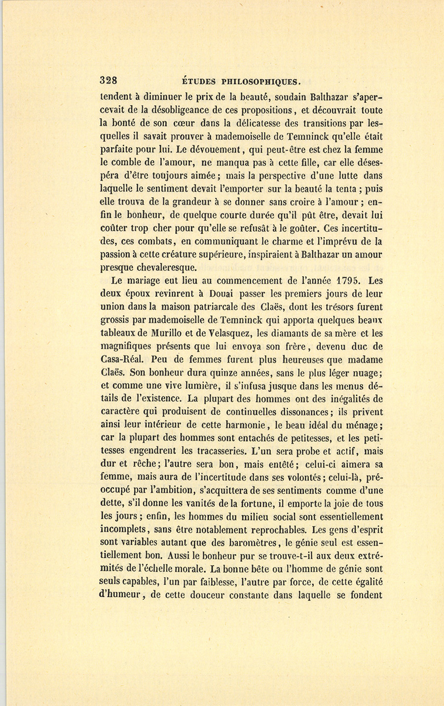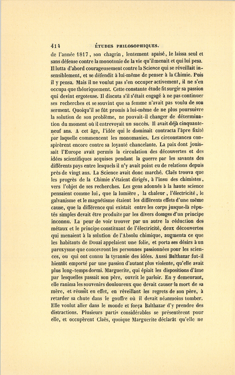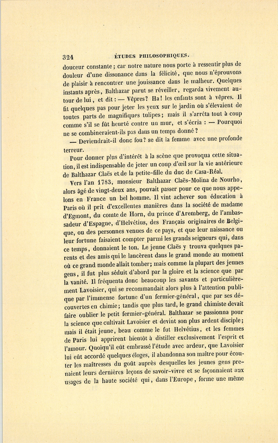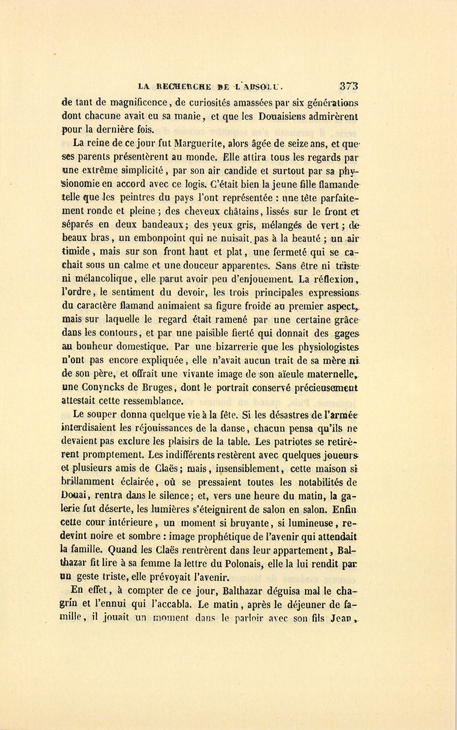 Vers l’an 1783, monsieur Balthazar Claës-Molina de Nourho, alors âgé de vingt-deux ans, pouvait passer pour ce que nous appelons en France un bel homme. Il vint achever son éducation à Paris où il prit d’excellentes manières dans la société de madame d’Egmont, du comte de Horn, du prince d’Aremberg, de l’ambassadeur d’Espagne, d’Helvétius, des Français originaires de Belgique, ou des personnes venues de ce pays, et que leur naissance ou leur fortune faisaient compter parmi les grands seigneurs qui, dans ce temps, donnaient le ton. Le jeune Claës y trouva quelques parents et des amis qui le lancèrent dans le grand monde au moment où ce grand monde allait tomber ; mais comme la plupart des jeunes gens, il fut plus séduit d’abord par la gloire et la science que par la vanité. Il fréquenta donc beaucoup les savants et particulièrement Lavoisier, qui se recommandait alors plus à l’attention publique par l’immense fortune d’un fermier-général, que par ses découvertes en chimie ; tandis que plus tard, le grand chimiste devait faire oublier le petit fermier-général. Balthazar se passionna pour la science que cultivait Lavoisier et devint son plus ardent disciple ; mais il était jeune, beau comme le fut Helvétius, et les femmes de Paris lui apprirent bientôt à distiller exclusivement l’esprit et l’amour. Quoiqu’il eût embrassé l’étude avec ardeur, que Lavoisier lui eût accordé quelques éloges, il abandonna son maître pour écouter les maîtresses du goût auprès desquelles les jeunes gens prenaient leurs dernières leçons de savoir-vivre et se façonnaient aux usages de la haute société qui, dans l’Europe, forme une même {p. 325} famille. Le songe enivrant du succès dura peu ; après avoir respiré l’air de Paris, Balthazar partit fatigué d’une vie creuse qui ne convenait ni à son âme ardente ni à son cœur aimant. La vie domestique, si douce, si calme, et dont il se souvenait au seul nom de la Flandre, lui parut mieux convenir à son caractère et aux ambitions de son cœur. Les dorures d’aucun salon parisien n’avaient effacé les mélodies du parloir brun et du petit jardin où son enfance s’était écoulée si heureuse. Il faut n’avoir ni foyer ni patrie pour rester à Paris. Paris est la ville du cosmopolite ou des hommes qui ont épousé le monde et qui l’étreignent incessamment avec le bras de la Science, de l’Art ou du Pouvoir. L’enfant de la Flandre revint à Douai comme le pigeon de La Fontaine à son nid, il pleura de joie en y rentrant le jour où se promenait Gayant. Gayant, ce superstitieux bonheur de toute la ville, ce triomphe des souvenirs flamands, s’était introduit lors de l’émigration de sa famille à Douai. La mort de son père et celle de sa mère laissèrent la maison Claës déserte, et l’y occupèrent pendant quelque temps. Sa première douleur passée, il sentit le besoin de se marier pour compléter l’existence heureuse dont toutes les religions l’avaient ressaisi ; il voulut suivre les errements du foyer domestique en allant, comme ses ancêtres, chercher une femme soit à Gand, soit à Bruges, soit à Anvers ; mais aucune des personnes qu’il y rencontra ne lui convint. Il avait sans doute, sur le mariage, quelques idées particulières, car il fut dès sa jeunesse accusé de ne pas marcher dans la voie commune. Un jour, il entendit parler, chez l’un de ses parents, à Gand, d’une demoiselle de Bruxelles qui devint l’objet de discussions assez vives. Les uns trouvaient que la beauté de mademoiselle de Temninck s’effaçait par ses imperfections ; les autres la voyaient parfaite malgré ses défauts. Le vieux cousin de Balthazar Claës dit à ses convives que, belle ou non, elle avait une âme qui la lui ferait épouser, s’il était à marier ; et il raconta comment elle venait de renoncer à la succession de son père et de sa mère afin de procurer à son jeune frère un mariage digne de son nom, en préférant ainsi le bonheur de ce frère au sien propre et lui sacrifiant toute sa vie. Il n’était pas à croire que mademoiselle de Temninck se mariât vieille et sans fortune, quand, jeune héritière, il ne se présentait aucun parti pour elle. Quelques jours après, Balthazar Claës recherchait mademoiselle de Temninck, alors âgée de vingt-cinq ans, et de laquelle il s’était vivement épris. Joséphine de Temninck se crut {p. 326} l’objet d’un caprice, et refusa d’écouter monsieur Claës ; mais la passion est si communicative, et pour une pauvre fille contrefaite et boiteuse, un amour inspiré à un homme jeune et bien fait, comporte de si grandes séductions, qu’elle consentit à se laisser courtiser.