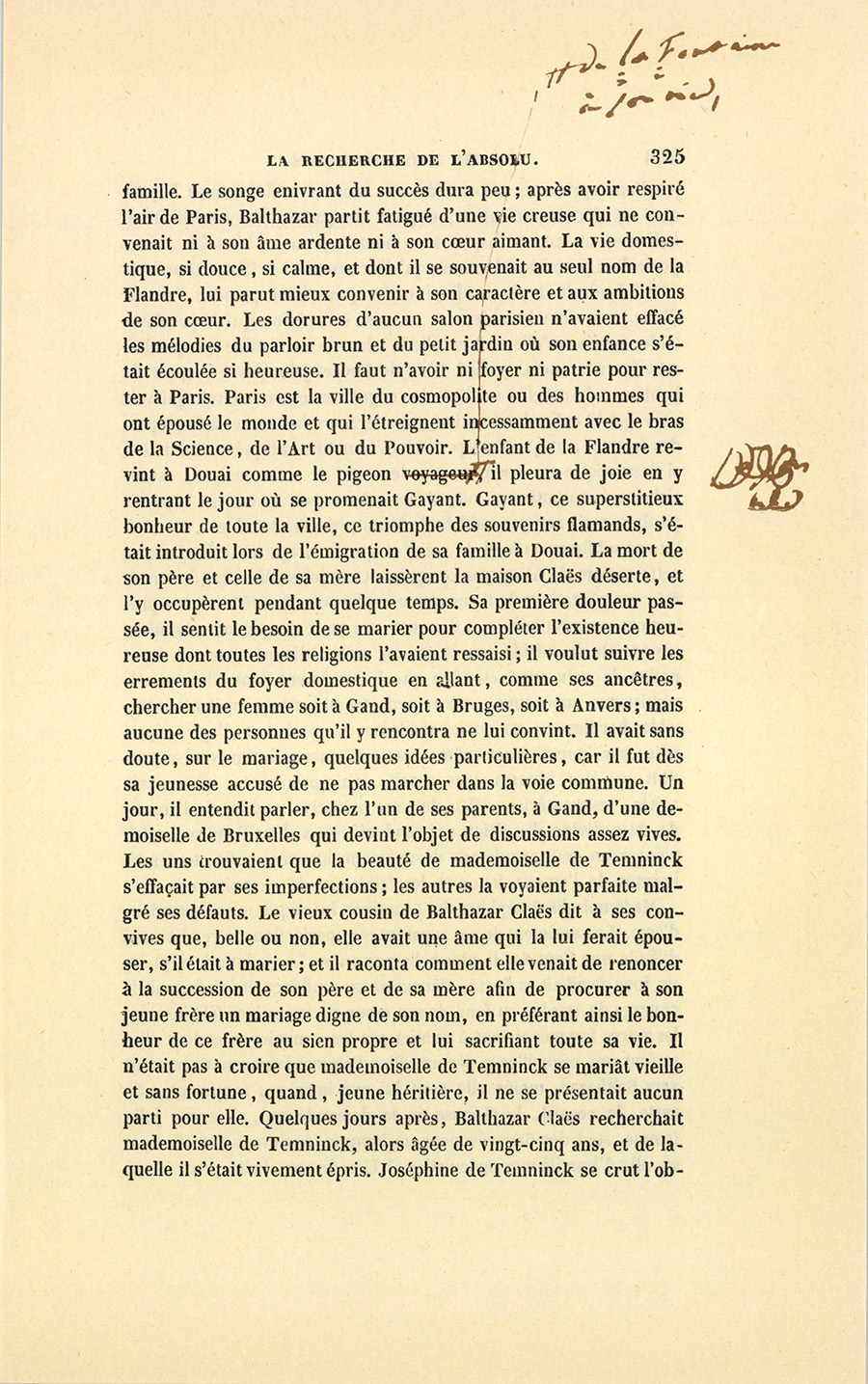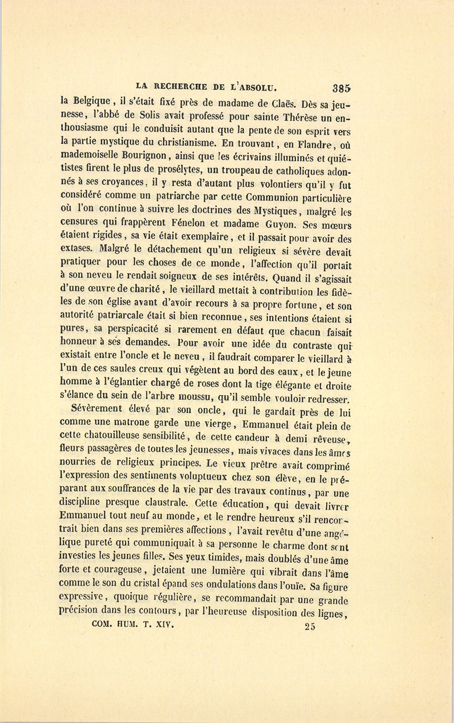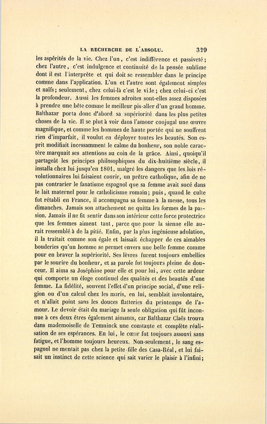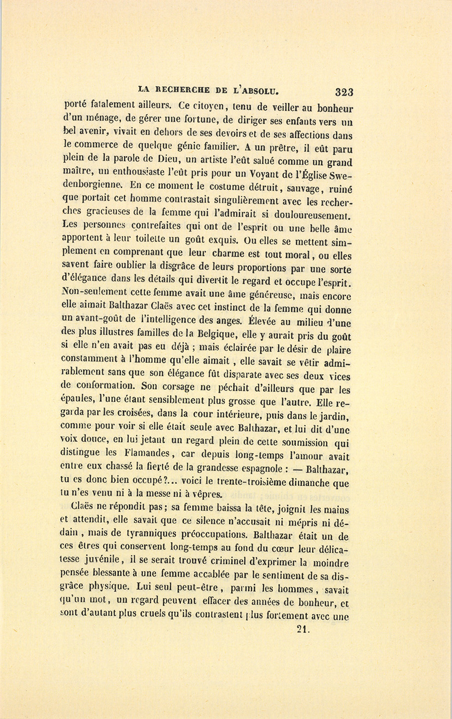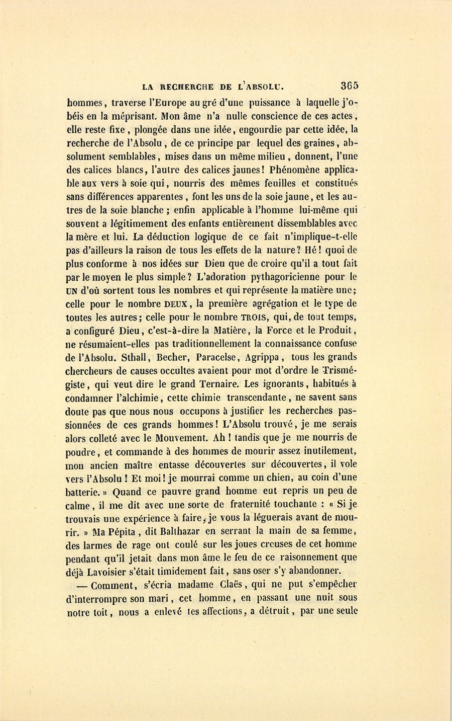 Vers l’an 1783, monsieur Balthazar Claës-Molina de Nourho, alors âgé de vingt-deux ans, pouvait passer pour ce que nous appelons en France un bel homme. Il vint achever son éducation à Paris où il prit d’excellentes manières dans la société de madame d’Egmont, du comte de Horn, du prince d’Aremberg, de l’ambassadeur d’Espagne, d’Helvétius, des Français originaires de Belgique, ou des personnes venues de ce pays, et que leur naissance ou leur fortune faisaient compter parmi les grands seigneurs qui, dans ce temps, donnaient le ton. Le jeune Claës y trouva quelques parents et des amis qui le lancèrent dans le grand monde au moment où ce grand monde allait tomber ; mais comme la plupart des jeunes gens, il fut plus séduit d’abord par la gloire et la science que par la vanité. Il fréquenta donc beaucoup les savants et particulièrement Lavoisier, qui se recommandait alors plus à l’attention publique par l’immense fortune d’un fermier-général, que par ses découvertes en chimie ; tandis que plus tard, le grand chimiste devait faire oublier le petit fermier-général. Balthazar se passionna pour la science que cultivait Lavoisier et devint son plus ardent disciple ; mais il était jeune, beau comme le fut Helvétius, et les femmes de Paris lui apprirent bientôt à distiller exclusivement l’esprit et l’amour. Quoiqu’il eût embrassé l’étude avec ardeur, que Lavoisier lui eût accordé quelques éloges, il abandonna son maître pour écouter les maîtresses du goût auprès desquelles les jeunes gens prenaient leurs dernières leçons de savoir-vivre et se façonnaient aux usages de la haute société qui, dans l’Europe, forme une même {p. 325} famille. Le songe enivrant du succès dura peu ; après avoir respiré l’air de Paris, Balthazar partit fatigué d’une vie creuse qui ne convenait ni à son âme ardente ni à son cœur aimant. La vie domestique, si douce, si calme, et dont il se souvenait au seul nom de la Flandre, lui parut mieux convenir à son caractère et aux ambitions de son cœur. Les dorures d’aucun salon parisien n’avaient effacé les mélodies du parloir brun et du petit jardin où son enfance s’était écoulée si heureuse. Il faut n’avoir ni foyer ni patrie pour rester à Paris. Paris est la ville du cosmopolite ou des hommes qui ont épousé le monde et qui l’étreignent incessamment avec le bras de la Science, de l’Art ou du Pouvoir. L’enfant de la Flandre revint à Douai comme le pigeon de La Fontaine à son nid, il pleura de joie en y rentrant le jour où se promenait Gayant. Gayant, ce superstitieux bonheur de toute la ville, ce triomphe des souvenirs flamands, s’était introduit lors de l’émigration de sa famille à Douai. La mort de son père et celle de sa mère laissèrent la maison Claës déserte, et l’y occupèrent pendant quelque temps. Sa première douleur passée, il sentit le besoin de se marier pour compléter l’existence heureuse dont toutes les religions l’avaient ressaisi ; il voulut suivre les errements du foyer domestique en allant, comme ses ancêtres, chercher une femme soit à Gand, soit à Bruges, soit à Anvers ; mais aucune des personnes qu’il y rencontra ne lui convint. Il avait sans doute, sur le mariage, quelques idées particulières, car il fut dès sa jeunesse accusé de ne pas marcher dans la voie commune. Un jour, il entendit parler, chez l’un de ses parents, à Gand, d’une demoiselle de Bruxelles qui devint l’objet de discussions assez vives. Les uns trouvaient que la beauté de mademoiselle de Temninck s’effaçait par ses imperfections ; les autres la voyaient parfaite malgré ses défauts. Le vieux cousin de Balthazar Claës dit à ses convives que, belle ou non, elle avait une âme qui la lui ferait épouser, s’il était à marier ; et il raconta comment elle venait de renoncer à la succession de son père et de sa mère afin de procurer à son jeune frère un mariage digne de son nom, en préférant ainsi le bonheur de ce frère au sien propre et lui sacrifiant toute sa vie. Il n’était pas à croire que mademoiselle de Temninck se mariât vieille et sans fortune, quand, jeune héritière, il ne se présentait aucun parti pour elle. Quelques jours après, Balthazar Claës recherchait mademoiselle de Temninck, alors âgée de vingt-cinq ans, et de laquelle il s’était vivement épris. Joséphine de Temninck se crut {p. 326} l’objet d’un caprice, et refusa d’écouter monsieur Claës ; mais la passion est si communicative, et pour une pauvre fille contrefaite et boiteuse, un amour inspiré à un homme jeune et bien fait, comporte de si grandes séductions, qu’elle consentit à se laisser courtiser.