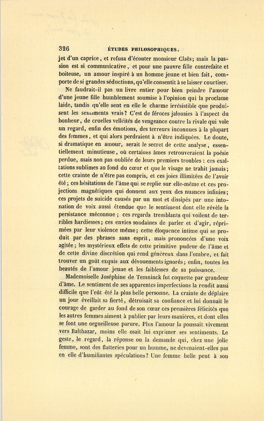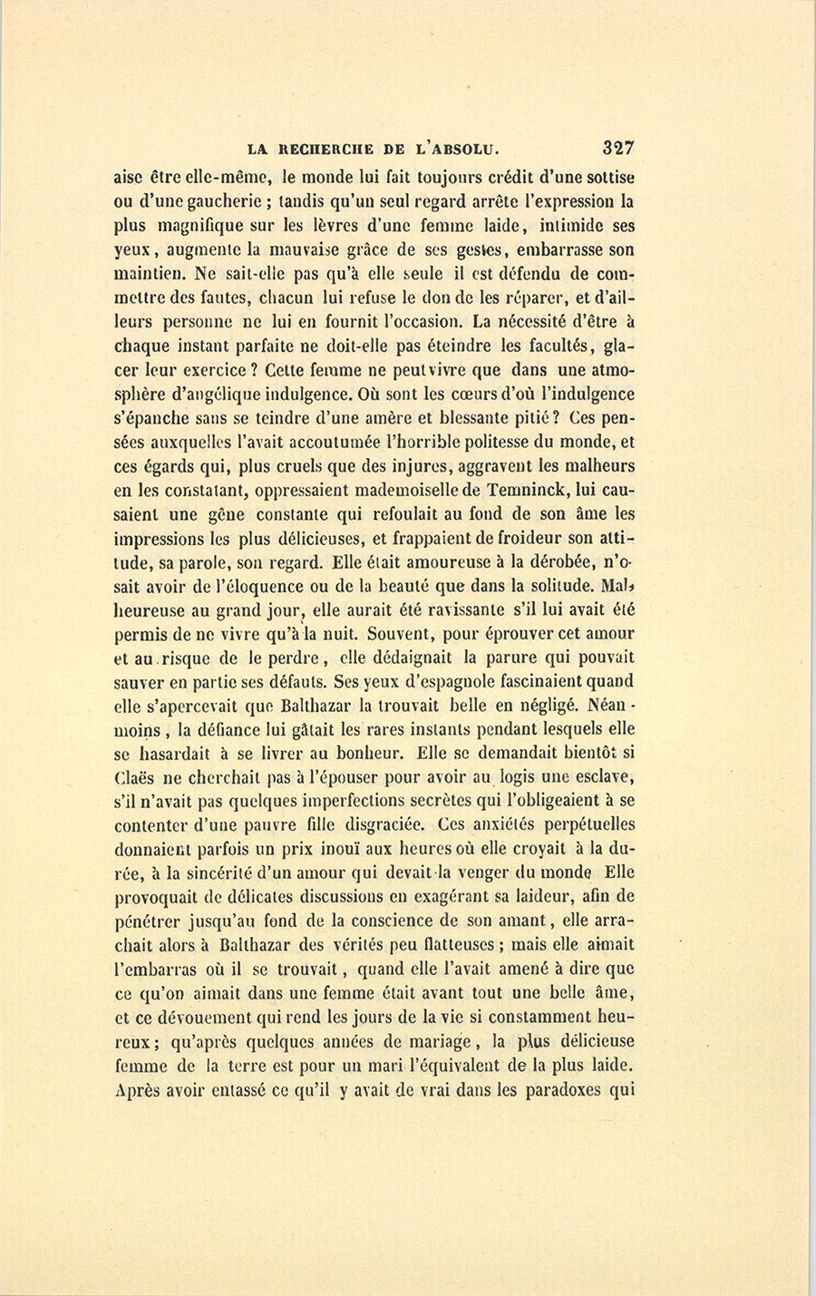 Mademoiselle Joséphine de Temninck fut coquette par grandeur d’âme. Le sentiment de ses apparentes imperfections la rendit aussi difficile que l’eût été la plus belle personne. La crainte de déplaire un jour éveillait sa fierté, détruisait sa confiance et lui donnait le courage de garder au fond de son cœur ces premières félicités que les autres femmes aiment à publier par leurs manières, et dont elles se font une orgueilleuse parure. Plus l’amour la poussait vivement vers Balthazar, moins elle osait lui exprimer ses sentiments. Le geste, le regard, la réponse ou la demande qui, chez une jolie femme, sont des flatteries pour un homme, ne devenaient-elles pas en elle d’humiliantes spéculations ? Une femme belle peut à son {p. 327} aise être elle-même, le monde lui fait toujours crédit d’une sottise ou d’une gaucherie ; tandis qu’un seul regard arrête l’expression la plus magnifique sur les lèvres d’une femme laide, intimide ses yeux, augmente la mauvaise grâce de ses gestes, embarrasse son maintien. Ne sait-elle pas qu’à elle seule il est défendu de commettre des fautes, chacun lui refuse le don de les réparer, et d’ailleurs personne ne lui en fournit l’occasion. La nécessité d’être à chaque instant parfaite ne doit-elle pas éteindre les facultés, glacer leur exercice ? Cette femme ne peut vivre que dans une atmosphère d’angélique indulgence. Où sont les cœurs d’où l’indulgence s’épanche sans se teindre d’une amère et blessante pitié ? Ces pensées auxquelles l’avait accoutumée l’horrible politesse du monde, et ces égards qui, plus cruels que des injures, aggravent les malheurs en les constatant, oppressaient mademoiselle de Temninck, lui causaient une gêne constante qui refoulait au fond de son âme les impressions les plus délicieuses, et frappaient de froideur son attitude, sa parole, son regard. Elle était amoureuse à la dérobée, n’osait avoir de l’éloquence ou de la beauté que dans la solitude. Malheureuse au grand jour, elle aurait été ravissante s’il lui avait été permis de ne vivre qu’à la nuit. Souvent, pour éprouver cet amour et au risque de le perdre, elle dédaignait la parure qui pouvait sauver en partie ses défauts. Ses yeux d’espagnole fascinaient quand elle s’apercevait que Balthazar la trouvait belle en négligé. Néanmoins, la défiance lui gâtait les rares instants pendant lesquels elle se hasardait à se livrer au bonheur. Elle se demandait bientôt si Claës ne cherchait pas à l’épouser pour avoir au logis une esclave, s’il n’avait pas quelques imperfections secrètes qui l’obligeaient à se contenter d’une pauvre fille disgraciée. Ces anxiétés perpétuelles donnaient parfois un prix inouï aux heures où elle croyait à la durée, à la sincérité d’un amour qui devait la venger du monde. Elle provoquait de délicates discussions en exagérant sa laideur, afin de pénétrer jusqu’au fond de la conscience de son amant, elle arrachait alors à Balthazar des vérités peu flatteuses ; mais elle aimait l’embarras où il se trouvait, quand elle l’avait amené à dire que ce qu’on aimait dans une femme était avant tout une belle âme, et ce dévouement qui rend les jours de la vie si constamment heureux ; qu’après quelques années de mariage, la plus délicieuse femme de la terre est pour un mari l’équivalent de la plus laide. Après avoir entassé ce qu’il y avait de vrai dans les paradoxes qui {p. 328} tendent à diminuer le prix de la beauté, soudain Balthazar s’apercevait de la désobligeance de ces propositions, et découvrait toute la bonté de son cœur dans la délicatesse des transitions par lesquelles il savait prouver à mademoiselle de Temninck qu’elle était parfaite pour lui. Le dévouement, qui peut-être est chez la femme le comble de l’amour, ne manqua pas à cette fille, car elle désespéra d’être toujours aimée ; mais la perspective d’une lutte dans laquelle le sentiment devait l’emporter sur la beauté la tenta ; puis elle trouva de la grandeur à se donner sans croire à l’amour ; enfin le bonheur, de quelque courte durée qu’il pût être, devait lui coûter trop cher pour qu’elle se refusât à le goûter. Ces incertitudes, ces combats, en communiquant le charme et l’imprévu de la passion à cette créature supérieure, inspiraient à Balthazar un amour presque chevaleresque.