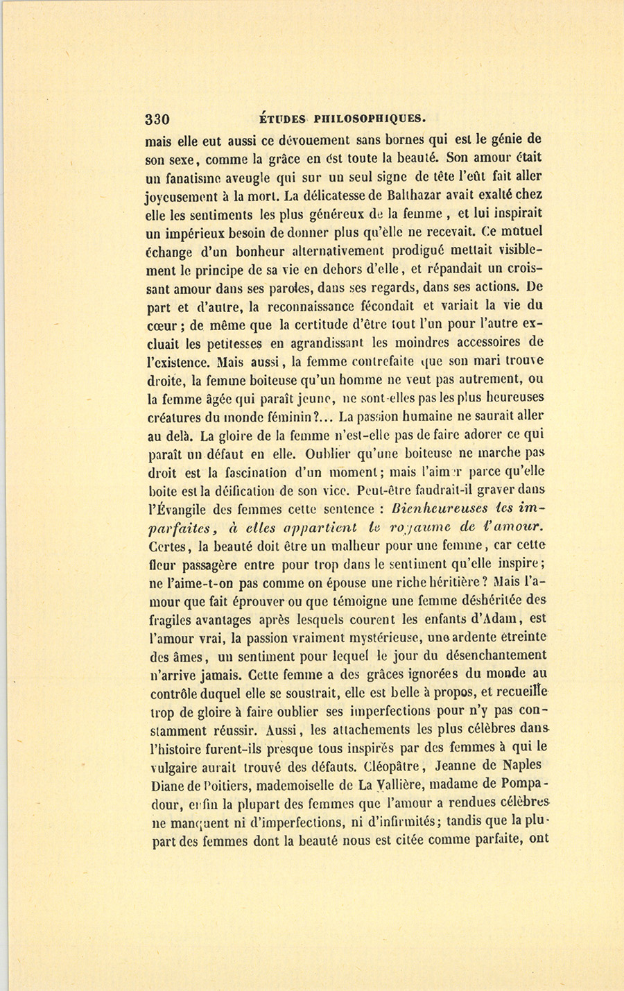 Ne faudrait-il pas un livre entier pour bien peindre l’amour d’une jeune fille humblement soumise à l’opinion qui la proclame laide, tandis qu’elle sent en elle le charme irrésistible que produisent les sentiments vrais ? C’est de féroces jalousies à l’aspect du bonheur, de cruelles velléités de vengeance contre la rivale qui vole un regard, enfin des émotions, des terreurs inconnues à la plupart des femmes, et qui alors perdraient à n’être qu’indiquées. Le doute, si dramatique en amour, serait le secret de cette analyse, essentiellement minutieuse, où certaines âmes retrouveraient la poésie perdue, mais non pas oubliée de leurs premiers troubles : ces exaltations sublimes au fond du cœur et que le visage ne trahit jamais ; cette crainte de n’être pas compris, et ces joies illimitées de l’avoir été ; ces hésitations de l’âme qui se replie sur elle-même et ces projections magnétiques qui donnent aux yeux des nuances infinies ; ces projets de suicide causés par un mot et dissipés par une intonation de voix aussi étendue que le sentiment dont elle révèle la persistance méconnue ; ces regards tremblants qui voilent de terribles hardiesses ; ces envies soudaines de parler et d’agir, réprimées par leur violence même ; cette éloquence intime qui se produit par des phrases sans esprit, mais prononcées d’une voix agitée ; les mystérieux effets de cette primitive pudeur de l’âme et de cette divine discrétion qui rend généreux dans l’ombre, et fait trouver un goût exquis aux dévouements ignorés ; enfin, toutes les beautés de l’amour jeune et les faiblesses de sa puissance.