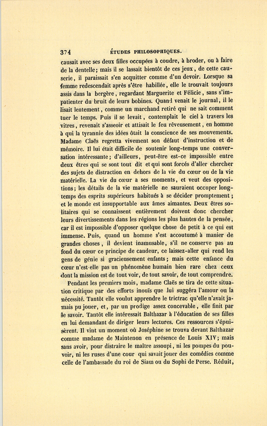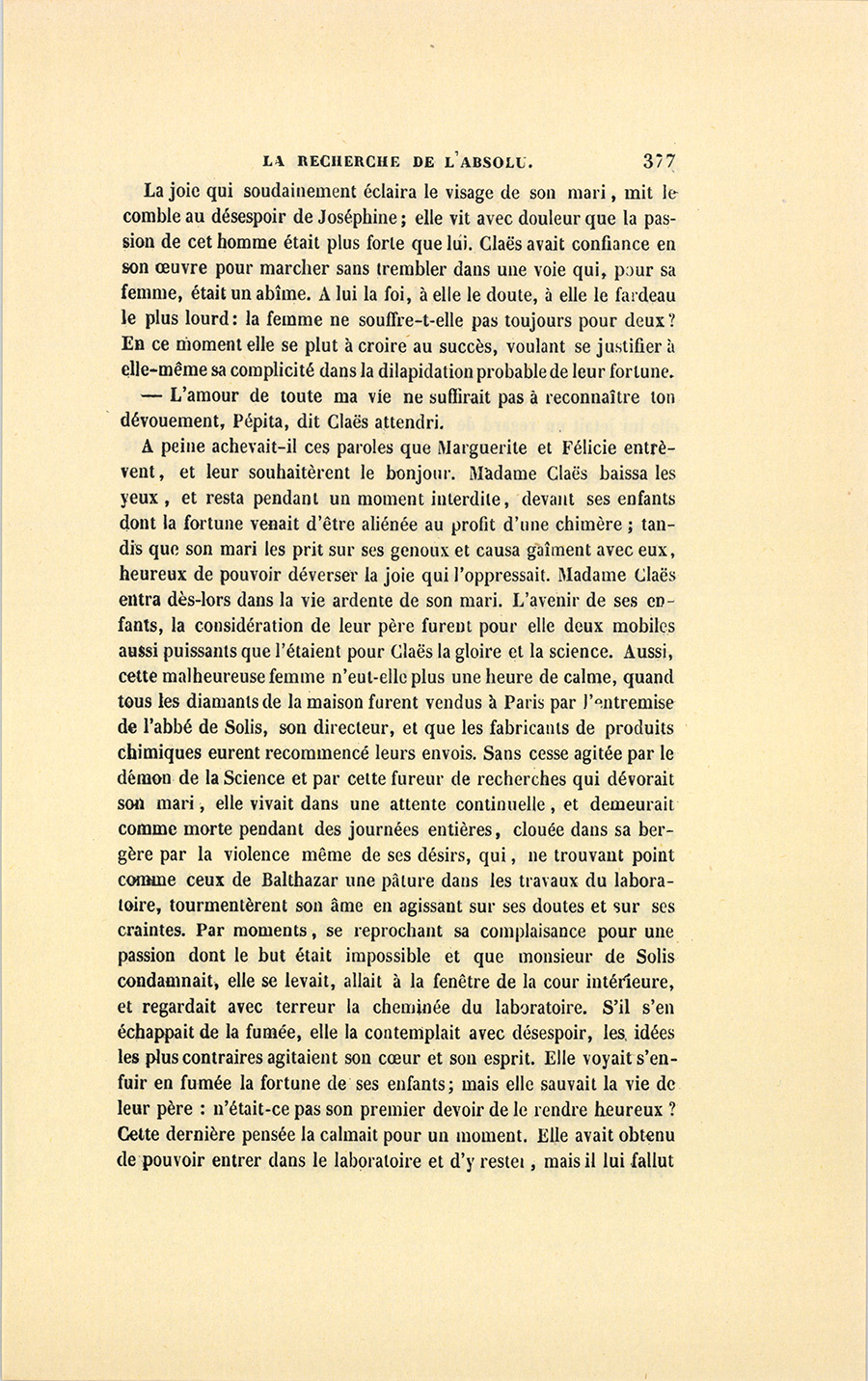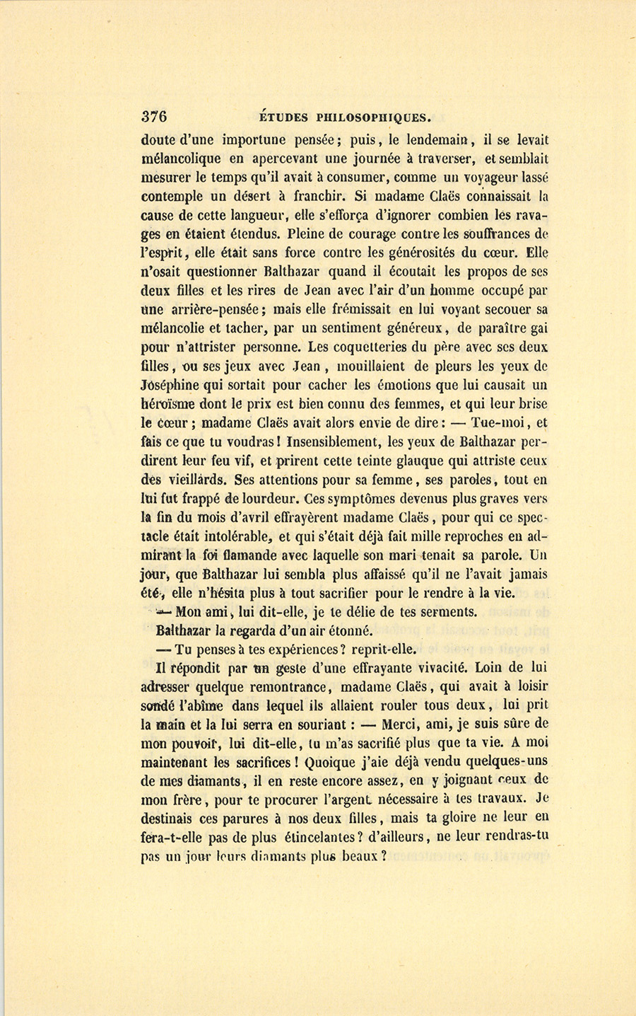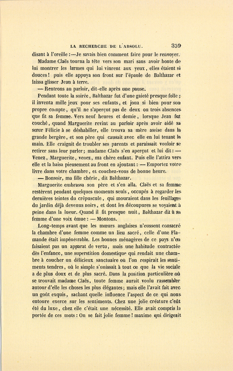 Madame Claës rougit fortement. Depuis deux ans cet anniversaire avait été oublié. Semblable à ces fous qui ont des moments pendant lesquels leurs facultés brillent d’un éclat inusité, jamais Balthazar n’avait été si spirituel dans sa tendresse. Il se montra plein d’attentions pour ses enfants, et sa conversation fut séduisante de grâce, d’esprit, d’à-propos. Ce retour de la paternité, absente depuis si long-temps, était certes la plus belle fête qu’il pût donner à sa femme pour qui sa parole et son regard avaient repris cette constante sympathie d’expression qui se sent de cœur à cœur et qui prouve une délicieuse identité de sentiment.