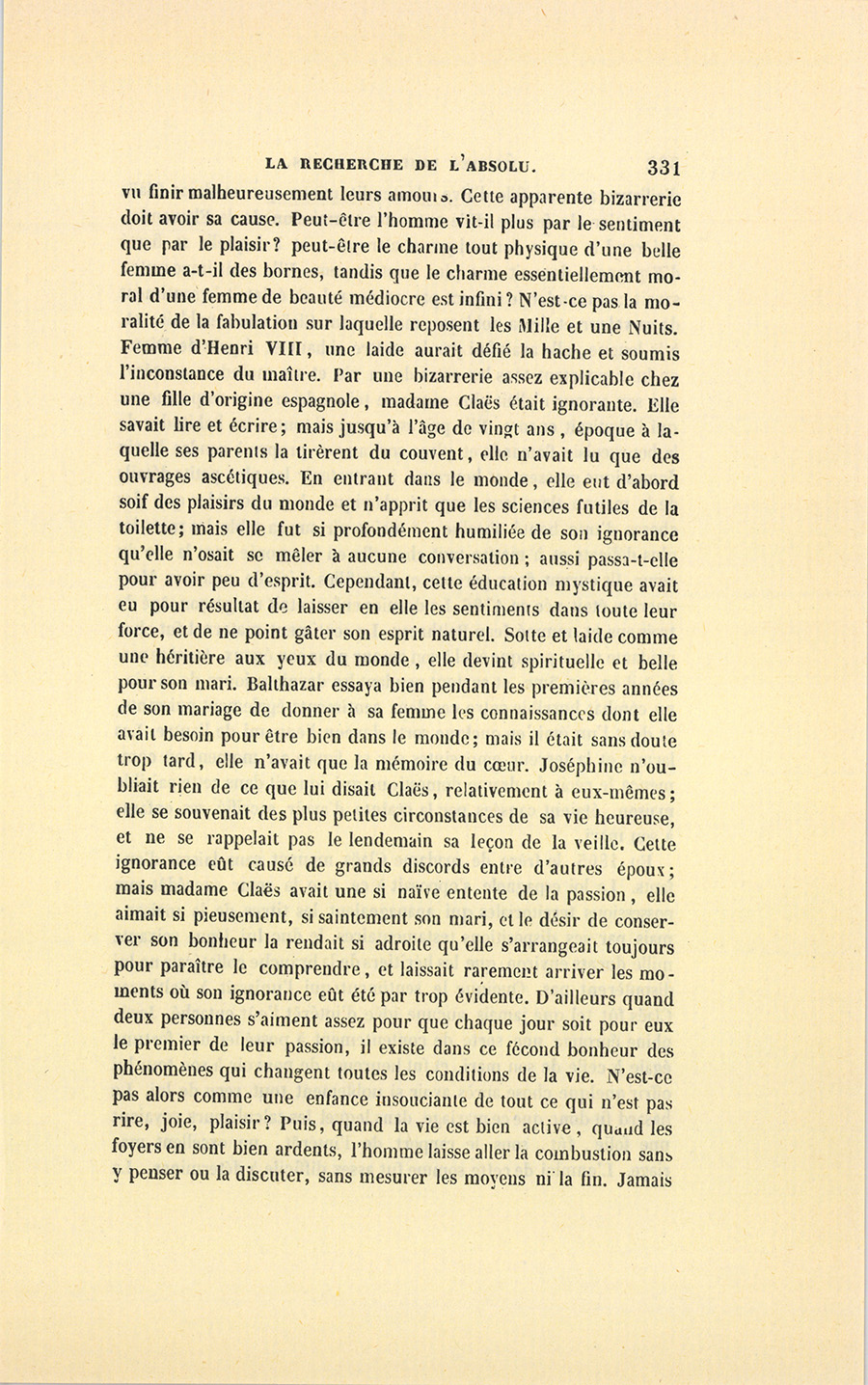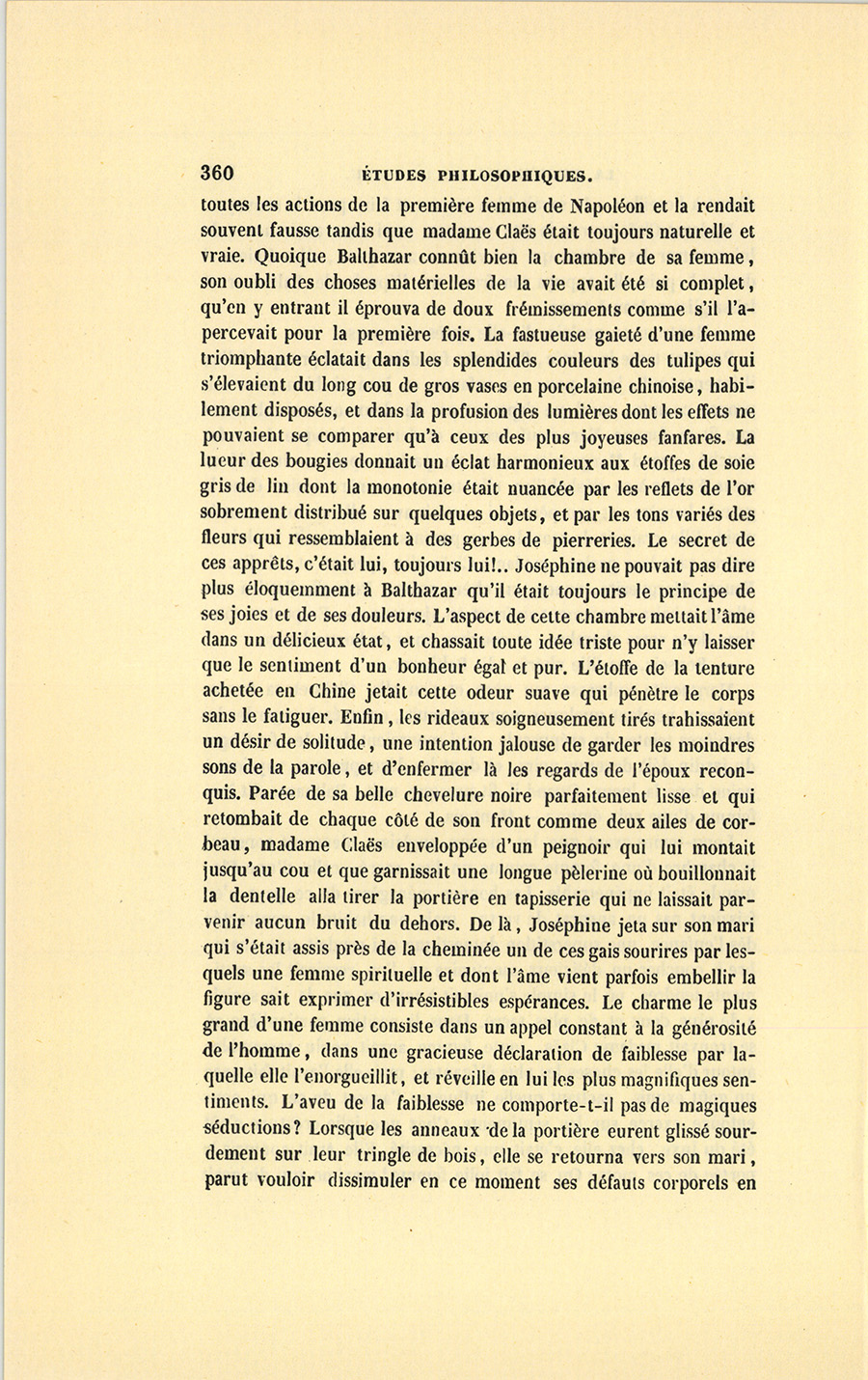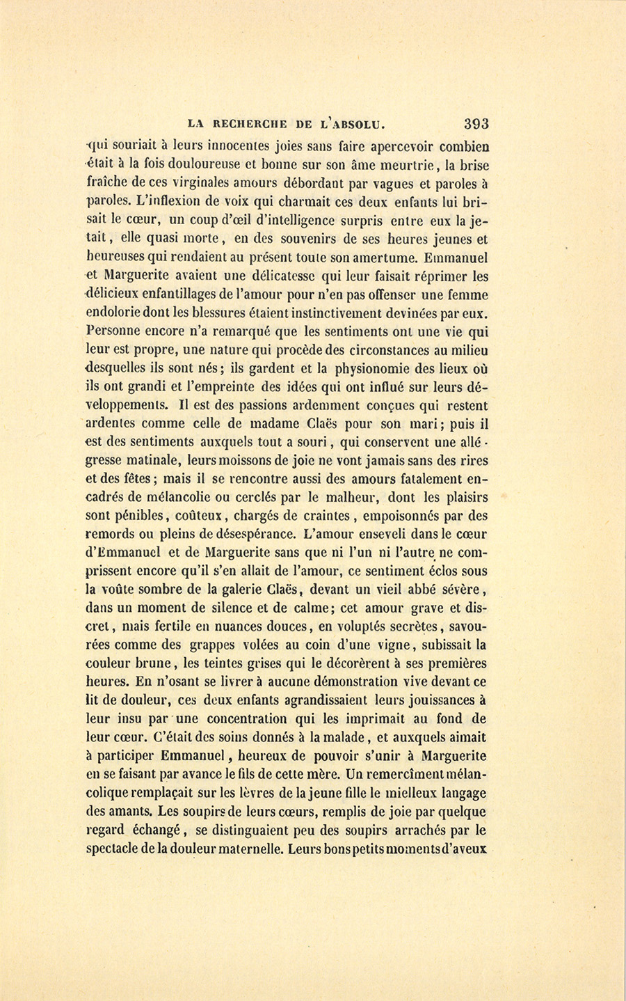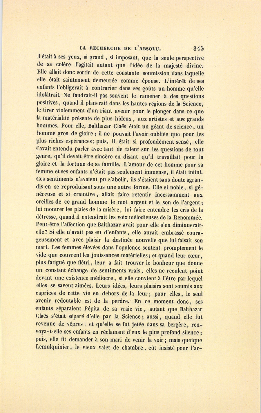 Madame Claës rougit fortement. Depuis deux ans cet anniversaire avait été oublié. Semblable à ces fous qui ont des moments pendant lesquels leurs facultés brillent d’un éclat inusité, jamais Balthazar n’avait été si spirituel dans sa tendresse. Il se montra plein d’attentions pour ses enfants, et sa conversation fut séduisante de grâce, d’esprit, d’à-propos. Ce retour de la paternité, absente depuis si long-temps, était certes la plus belle fête qu’il pût donner à sa femme pour qui sa parole et son regard avaient repris cette constante sympathie d’expression qui se sent de cœur à cœur et qui prouve une délicieuse identité de sentiment.