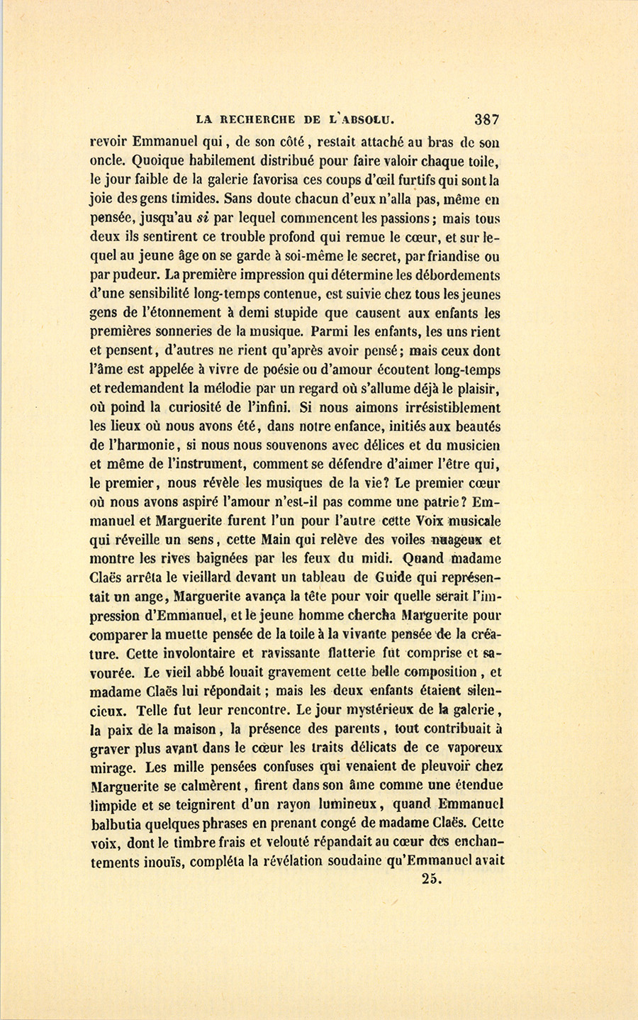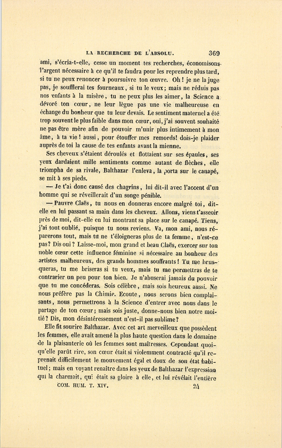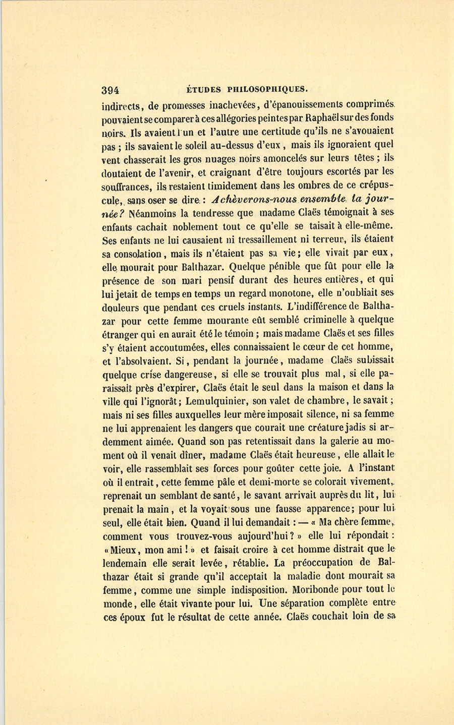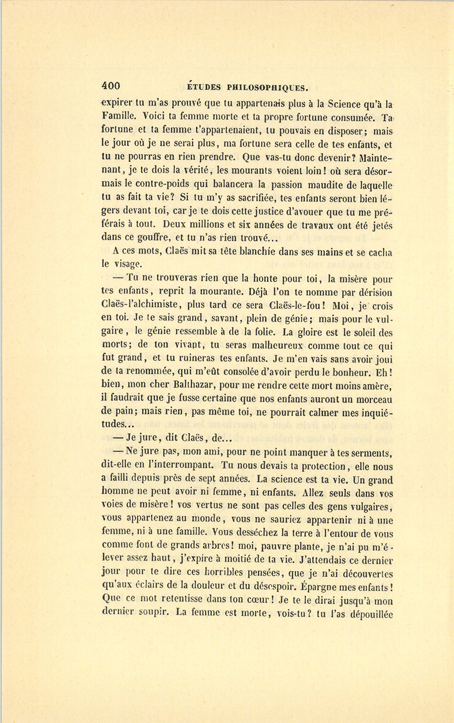 Madame Claës rougit fortement. Depuis deux ans cet anniversaire avait été oublié. Semblable à ces fous qui ont des moments pendant lesquels leurs facultés brillent d’un éclat inusité, jamais Balthazar n’avait été si spirituel dans sa tendresse. Il se montra plein d’attentions pour ses enfants, et sa conversation fut séduisante de grâce, d’esprit, d’à-propos. Ce retour de la paternité, absente depuis si long-temps, était certes la plus belle fête qu’il pût donner à sa femme pour qui sa parole et son regard avaient repris cette constante sympathie d’expression qui se sent de cœur à cœur et qui prouve une délicieuse identité de sentiment.