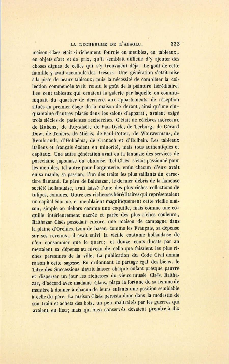 En 1805, le frère de madame Claës mourut sans laisser d’enfants. La loi espagnole s’opposait à ce que la sœur succédât aux possessions territoriales qui apanageaient les titres de la maison ; mais par ses dispositions testamentaires, le duc lui légua soixante mille ducats environ, que les héritiers de la branche collatérale ne lui disputèrent pas. Quoique le sentiment qui l’unissait à Balthazar Claës fût tel que jamais aucune idée d’intérêt l’eût entaché, Joséphine éprouva une sorte de contentement à posséder une fortune égale à celle de son mari, et fut heureuse de pouvoir à son tour lui offrir quelque chose après avoir si noblement tout reçu de lui. Le hasard fit donc que ce mariage, dans lequel les calculateurs voyaient une folie, fût, sous le rapport de l’intérêt, un excellent mariage. L’emploi de cette somme fut assez difficile à déterminer. La {p. 333} maison Claës était si richement fournie en meubles, en tableaux, en objets d’art et de prix, qu’il semblait difficile d’y ajouter des choses dignes de celles qui s’y trouvaient déjà. Le goût de cette famille y avait accumulé des trésors. Une génération s’était mise à la piste de beaux tableaux ; puis la nécessité de compléter la collection commencée avait rendu le goût de la peinture héréditaire. Les cent tableaux qui ornaient la galerie par laquelle on communiquait du quartier de derrière aux appartements de réception situés au premier étage de la maison de devant, ainsi qu’une cinquantaine d’autres placés dans les salons d’apparat, avaient exigé trois siècles de patientes recherches. C’était de célèbres morceaux de Rubens, de Ruysdaël, de Van-Dyck, de Terburg, de Gérard Dow, de Teniers, de Miéris, de Paul-Potter, de Wouwermans, de Rembrandt, d’Hobbéma, de Cranach et d’Holbein. Les tableaux italiens et français étaient en minorité, mais tous authentiques et capitaux. Une autre génération avait eu la fantaisie des services de porcelaine japonaise ou chinoise. Tel Claës s’était passionné pour les meubles, tel autre pour l’argenterie, enfin chacun d’eux avait eu sa manie, sa passion, l’un des traits les plus saillants du caractère flamand. Le père de Balthazar, le dernier débris de la fameuse société hollandaise, avait laissé l’une des plus riches collections de tulipes connues1. Outre ces richesses héréditaires qui représentaient un capital énorme, et meublaient magnifiquement cette vieille maison, simple au dehors comme une coquille, mais comme une coquille intérieurement nacrée et parée des plus riches couleurs, Balthazar Claës possédait encore une maison de campagne dans la plaine d’Orchies. Loin de baser, comme les Français, sa dépense sur ses revenus, il avait suivi la vieille coutume hollandaise de n’en consommer que le quart ; et douze cents ducats par an mettaient sa dépense au niveau de celle que faisaient les plus riches personnes de la ville. La publication du Code Civil donna raison à cette sagesse. En ordonnant le partage égal des biens, le Titre des Successions devait laisser chaque enfant presque pauvre et disperser un jour les richesses du vieux musée Claës. Balthazar, d’accord avec madame Claës, plaça la fortune de sa femme de manière à donner à chacun de leurs enfants une position semblable à celle du père. La maison Claës persista donc dans la modestie de son train et acheta des bois, un peu maltraités par les guerres qui avaient eu lieu ; mais qui bien conservés devaient prendre à dix {p. 334} ans de là une valeur énorme. La haute société de Douai, que fréquentait monsieur Claës, avait su si bien apprécier le beau caractère et les qualités de sa femme, que, par une espèce de convention tacite, elle était exemptée des devoirs auxquels les gens de province tiennent tant. Pendant la saison d’hiver qu’elle passait à la ville, elle allait rarement dans le monde, et le monde venait chez elle. Elle recevait tous les mercredis, et donnait trois grands dîners par mois. Chacun avait senti qu’elle était plus à l’aise dans sa maison, où la retenaient d’ailleurs sa passion pour son mari et les soins que réclamait l’éducation de ses enfants. Telle fut, jusqu’en 1809, la conduite de ce ménage qui n’eut rien que2 de conforme aux idées reçues. La vie de ces deux êtres, secrètement pleine d’amour et de joie, était extérieurement semblable à toute autre. La passion de Balthazar Claës pour sa femme, et que sa femme savait perpétuer, semblait, comme il le faisait observer lui-même, employer sa constance innée dans la culture du bonheur qui valait bien celle des tulipes vers laquelle il penchait dès son enfance, et le dispensait d’avoir sa manie comme chacun de ses ancêtres avait eu la sienne.