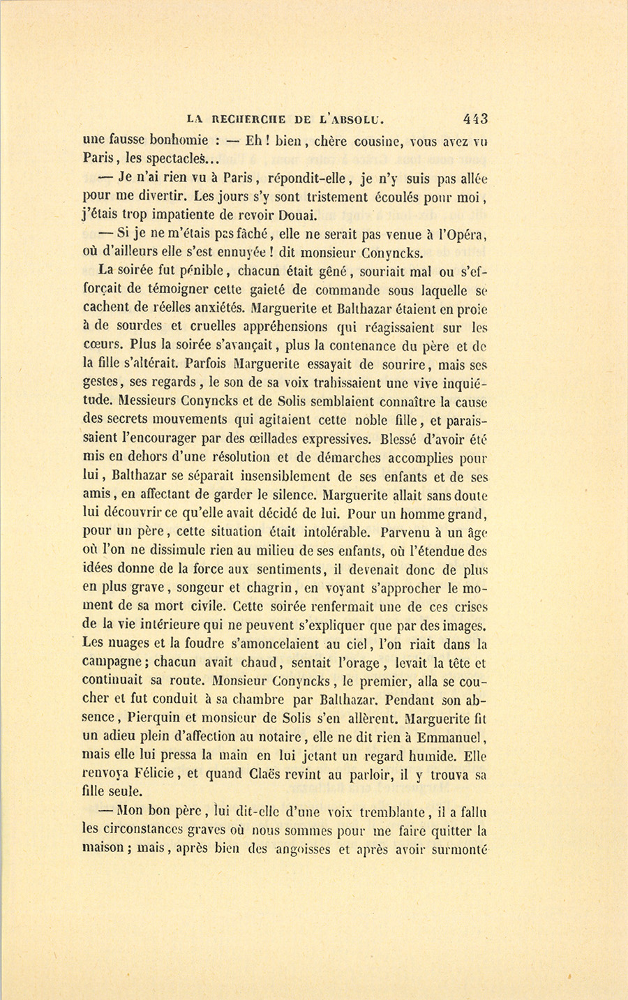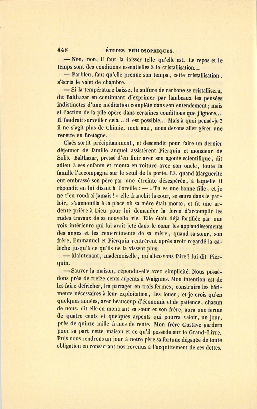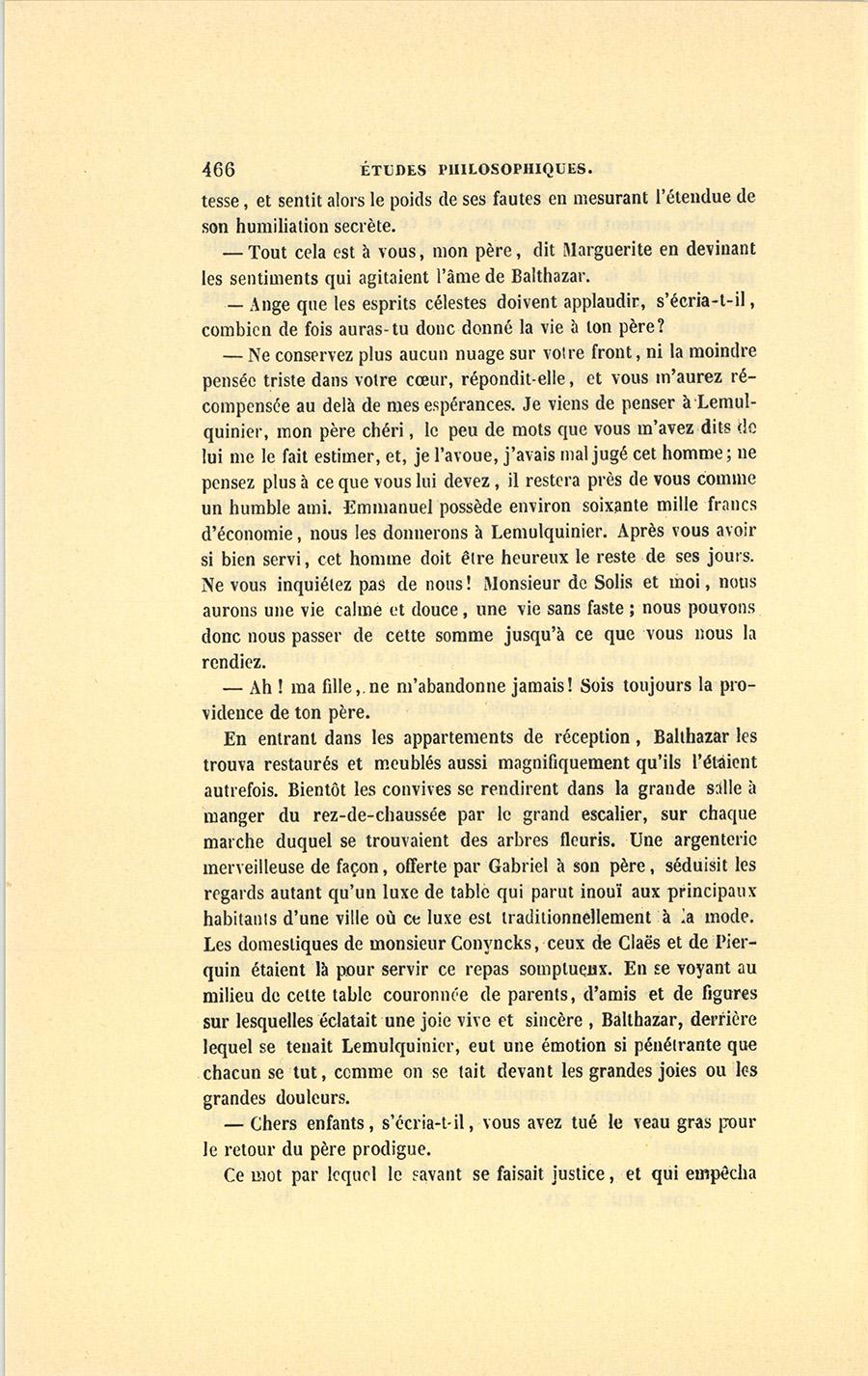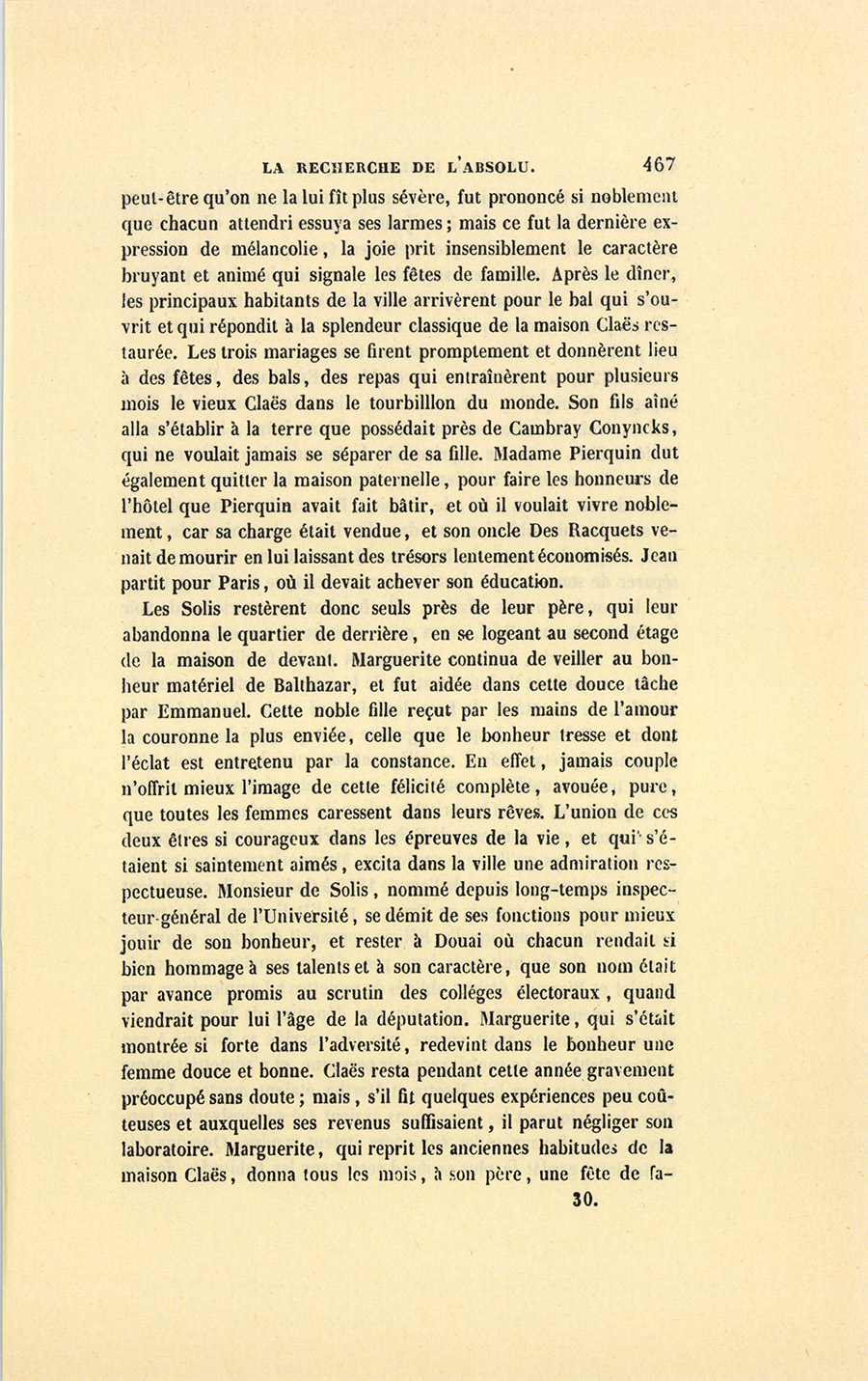 Ce mot par lequel le savant se faisait justice, et qui empêcha {p. 467} peut-être qu’on ne la lui fît plus sévère, fut prononcé si noblement que chacun attendri essuya ses larmes ; mais ce fut la dernière expression de mélancolie, la joie prit insensiblement le caractère bruyant et animé qui signale les fêtes de famille. Après le dîner, les principaux habitants de la ville arrivèrent pour le bal qui s’ouvrit et qui répondit à la splendeur classique de la maison Claës restaurée. Les trois mariages se firent promptement et donnèrent lieu à des fêtes, des bals, des repas qui entraînèrent pour plusieurs mois le vieux Claës dans le tourbillon du monde. Son fils aîné alla s’établir à la terre que possédait près de Cambray Conyncks, qui ne voulait jamais se séparer de sa fille. Madame Pierquin dut également quitter la maison paternelle, pour faire les honneurs de l’hôtel que Pierquin avait fait bâtir, et où il voulait vivre noblement, car sa charge était vendue, et son oncle Des Racquets venait de mourir en lui laissant des trésors lentement économisés. Jean partit pour Paris, où il devait achever son éducation.