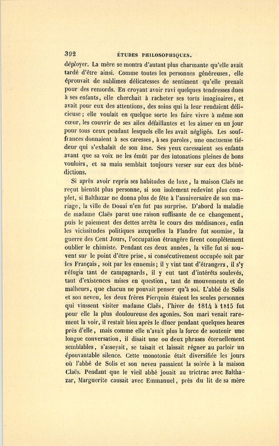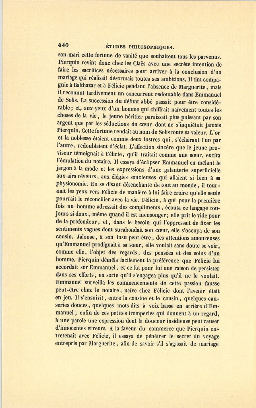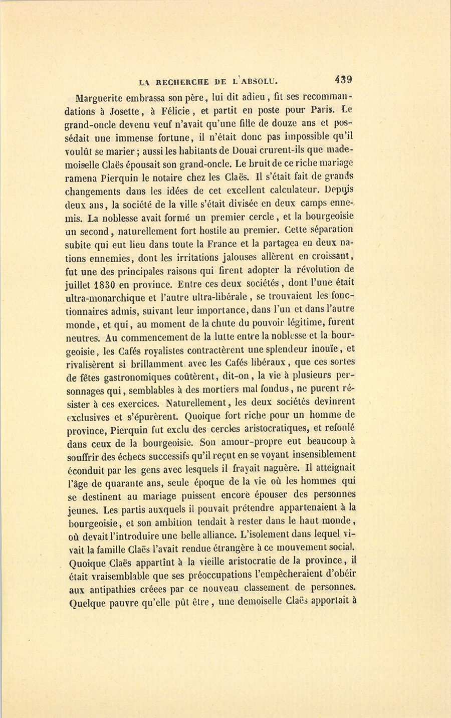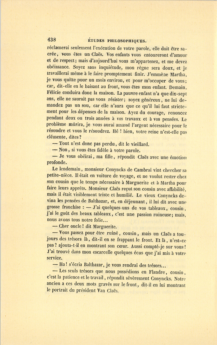Ce mot par lequel le savant se faisait justice, et qui empêcha {p. 467} peut-être qu’on ne la lui fît plus sévère, fut prononcé si noblement que chacun attendri essuya ses larmes ; mais ce fut la dernière expression de mélancolie, la joie prit insensiblement le caractère bruyant et animé qui signale les fêtes de famille. Après le dîner, les principaux habitants de la ville arrivèrent pour le bal qui s’ouvrit et qui répondit à la splendeur classique de la maison Claës restaurée. Les trois mariages se firent promptement et donnèrent lieu à des fêtes, des bals, des repas qui entraînèrent pour plusieurs mois le vieux Claës dans le tourbillon du monde. Son fils aîné alla s’établir à la terre que possédait près de Cambray Conyncks, qui ne voulait jamais se séparer de sa fille. Madame Pierquin dut également quitter la maison paternelle, pour faire les honneurs de l’hôtel que Pierquin avait fait bâtir, et où il voulait vivre noblement, car sa charge était vendue, et son oncle Des Racquets venait de mourir en lui laissant des trésors lentement économisés. Jean partit pour Paris, où il devait achever son éducation.