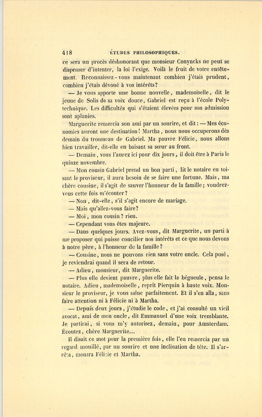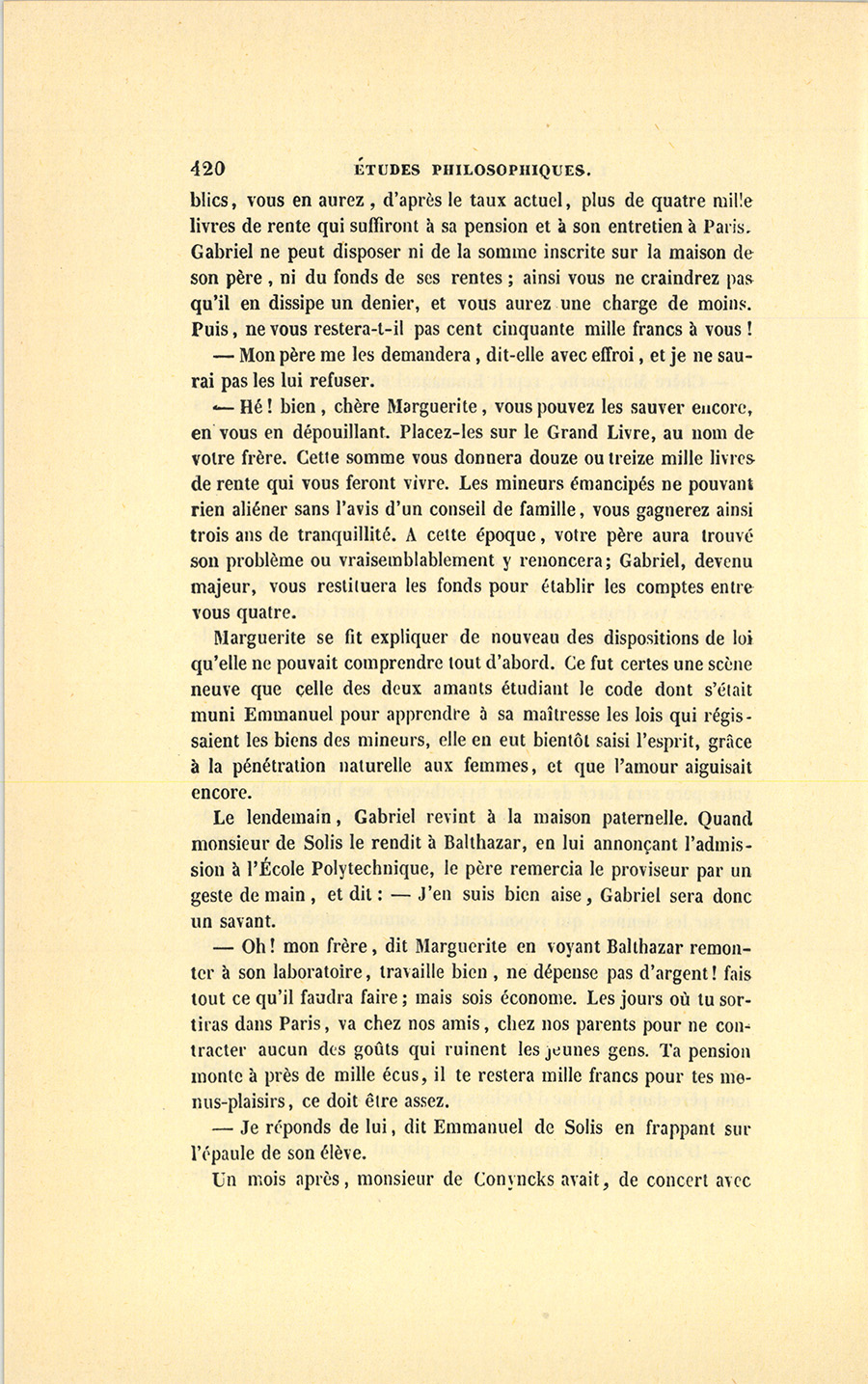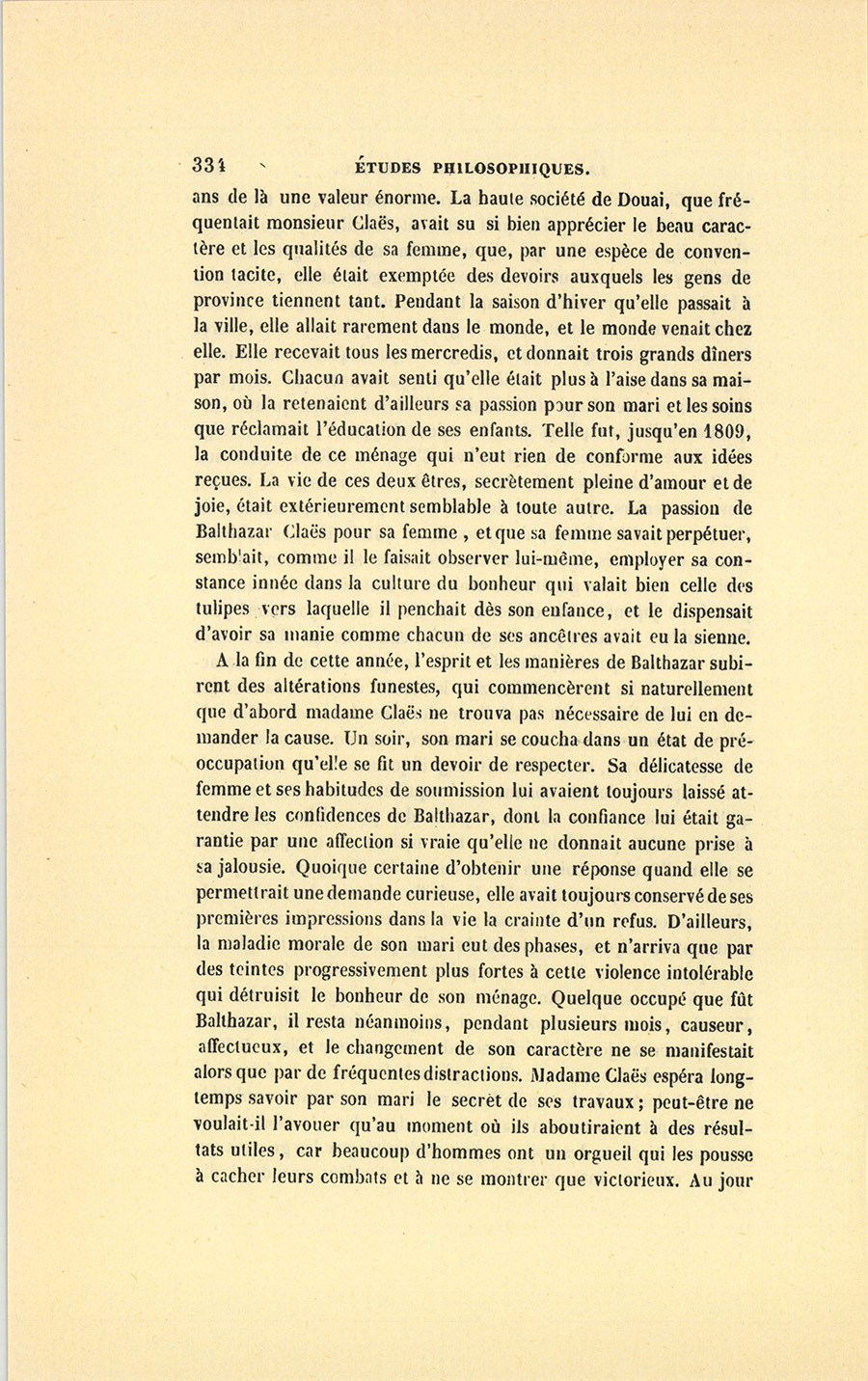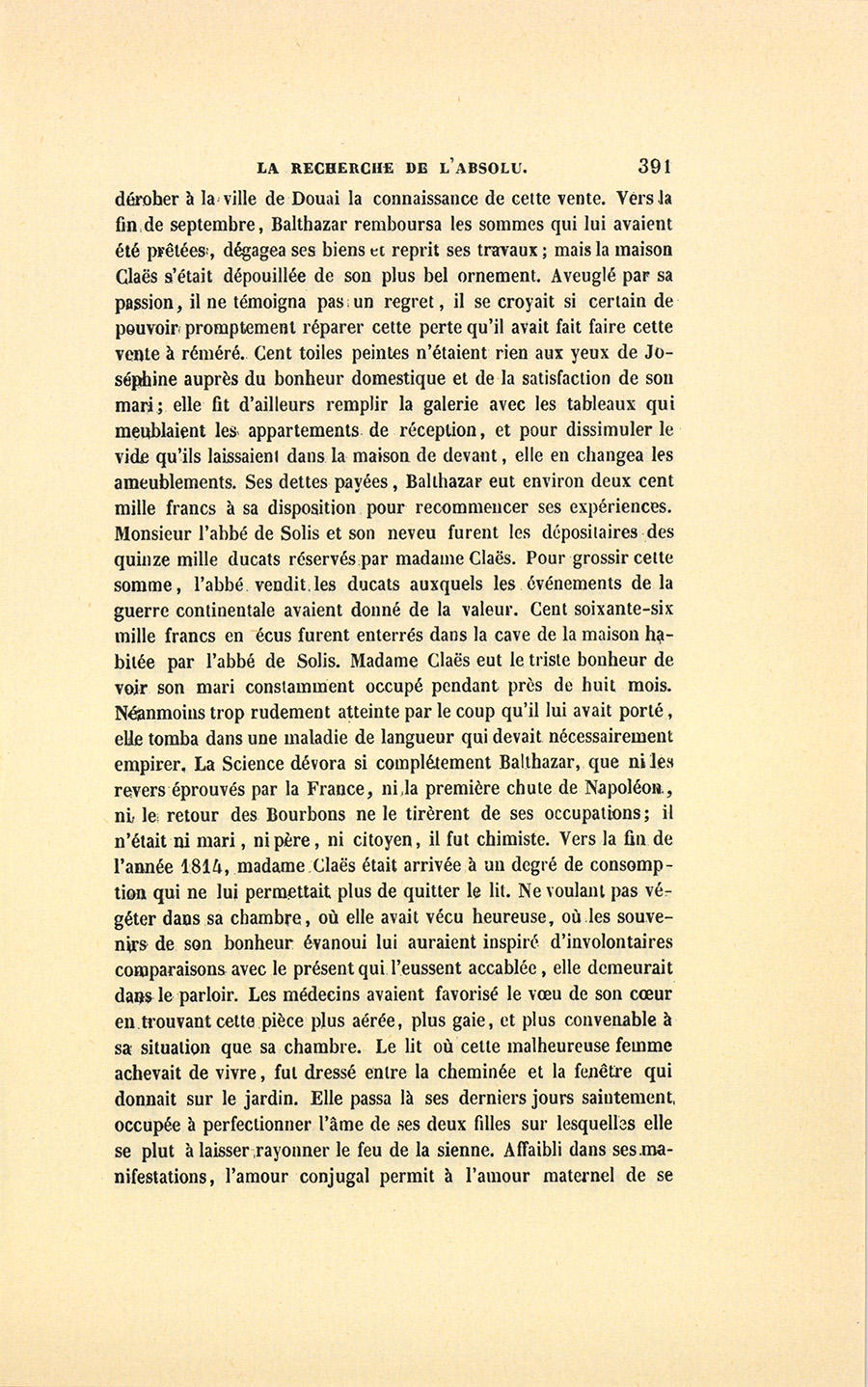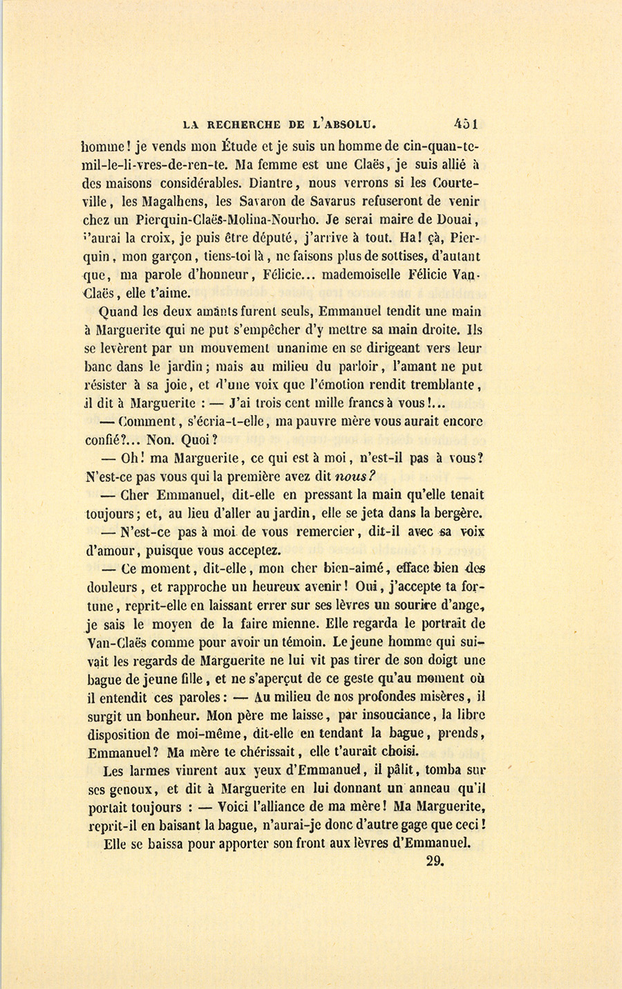 Ce mot par lequel le savant se faisait justice, et qui empêcha {p. 467} peut-être qu’on ne la lui fît plus sévère, fut prononcé si noblement que chacun attendri essuya ses larmes ; mais ce fut la dernière expression de mélancolie, la joie prit insensiblement le caractère bruyant et animé qui signale les fêtes de famille. Après le dîner, les principaux habitants de la ville arrivèrent pour le bal qui s’ouvrit et qui répondit à la splendeur classique de la maison Claës restaurée. Les trois mariages se firent promptement et donnèrent lieu à des fêtes, des bals, des repas qui entraînèrent pour plusieurs mois le vieux Claës dans le tourbillon du monde. Son fils aîné alla s’établir à la terre que possédait près de Cambray Conyncks, qui ne voulait jamais se séparer de sa fille. Madame Pierquin dut également quitter la maison paternelle, pour faire les honneurs de l’hôtel que Pierquin avait fait bâtir, et où il voulait vivre noblement, car sa charge était vendue, et son oncle Des Racquets venait de mourir en lui laissant des trésors lentement économisés. Jean partit pour Paris, où il devait achever son éducation.