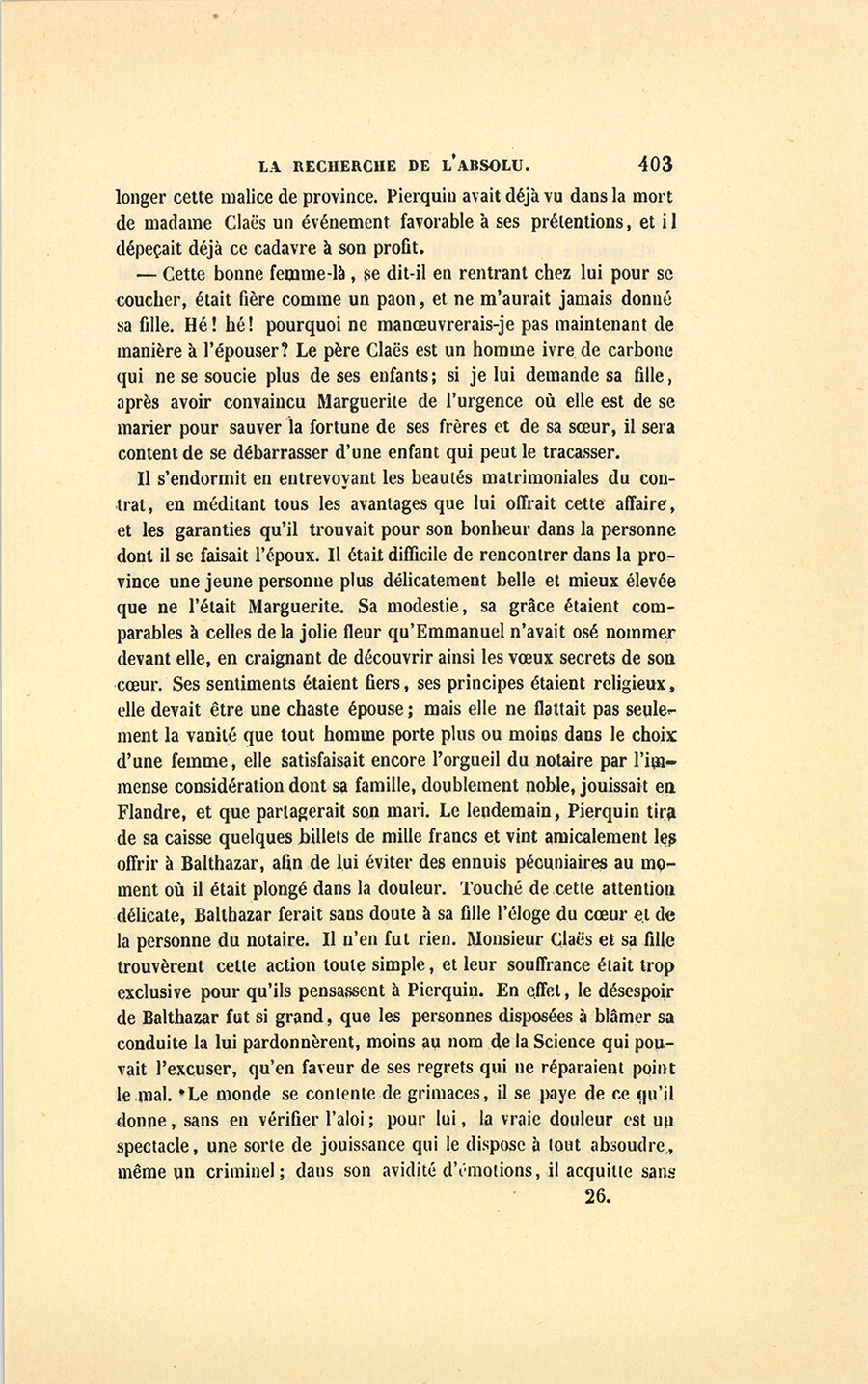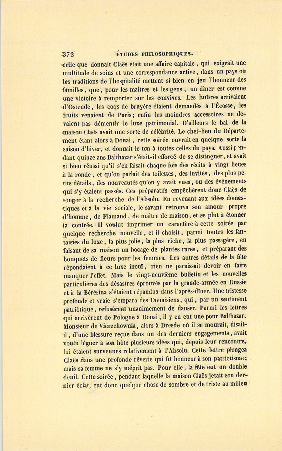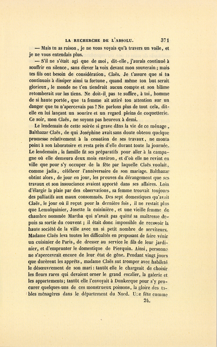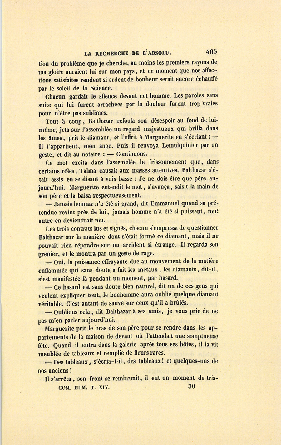 Ce mot par lequel le savant se faisait justice, et qui empêcha {p. 467} peut-être qu’on ne la lui fît plus sévère, fut prononcé si noblement que chacun attendri essuya ses larmes ; mais ce fut la dernière expression de mélancolie, la joie prit insensiblement le caractère bruyant et animé qui signale les fêtes de famille. Après le dîner, les principaux habitants de la ville arrivèrent pour le bal qui s’ouvrit et qui répondit à la splendeur classique de la maison Claës restaurée. Les trois mariages se firent promptement et donnèrent lieu à des fêtes, des bals, des repas qui entraînèrent pour plusieurs mois le vieux Claës dans le tourbillon du monde. Son fils aîné alla s’établir à la terre que possédait près de Cambray Conyncks, qui ne voulait jamais se séparer de sa fille. Madame Pierquin dut également quitter la maison paternelle, pour faire les honneurs de l’hôtel que Pierquin avait fait bâtir, et où il voulait vivre noblement, car sa charge était vendue, et son oncle Des Racquets venait de mourir en lui laissant des trésors lentement économisés. Jean partit pour Paris, où il devait achever son éducation.