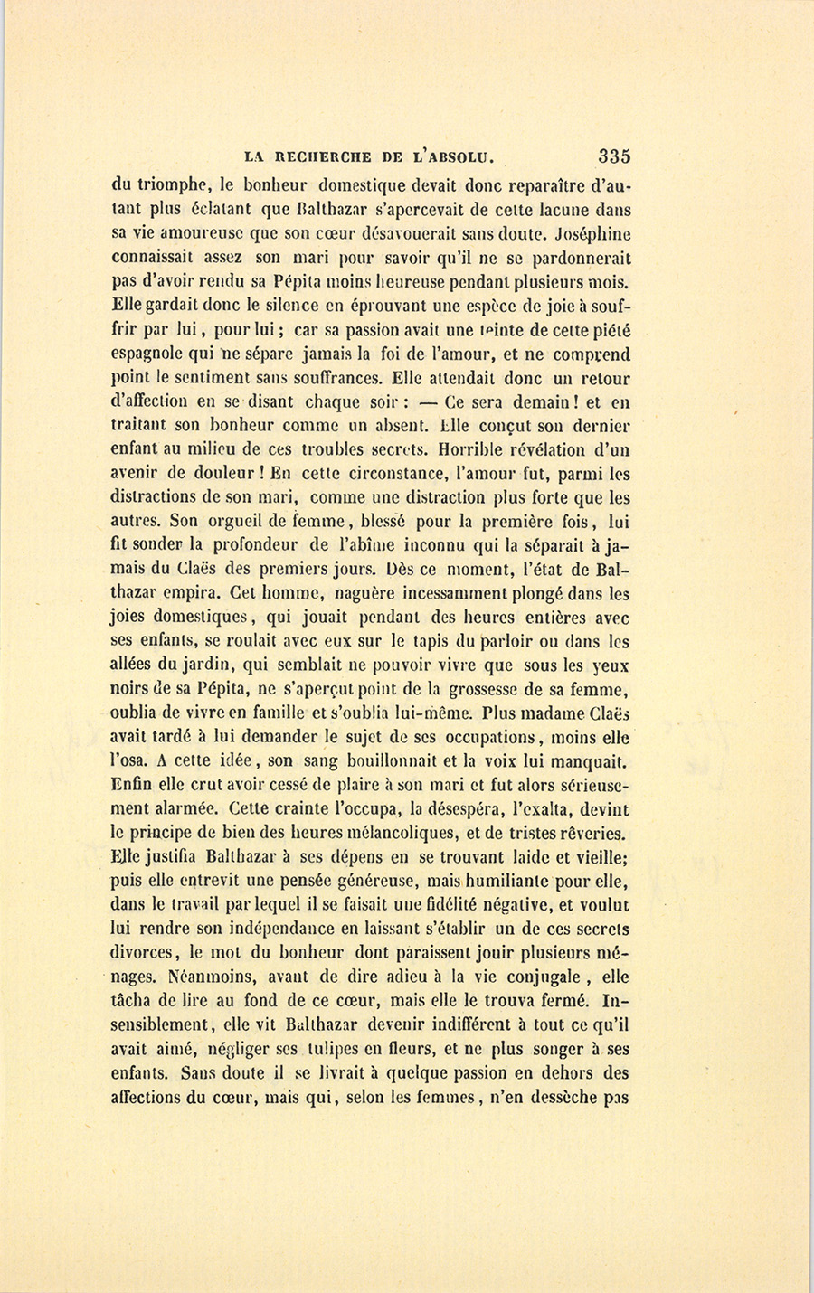 À la fin de cette année, l’esprit et les manières de Balthazar subirent des altérations funestes, qui commencèrent si naturellement que d’abord madame Claës ne trouva pas nécessaire de lui en demander la cause. Un soir, son mari se coucha dans un état de préoccupation qu’elle se fit un devoir de respecter. Sa délicatesse de femme et ses habitudes de soumission lui avaient toujours laissé attendre les confidences de Balthazar, dont la confiance lui était garantie par une affection si vraie qu’elle ne donnait aucune prise à sa jalousie. Quoique certaine d’obtenir une réponse quand elle se permettrait une demande curieuse, elle avait toujours conservé de ses premières impressions dans la vie la crainte d’un refus. D’ailleurs, la maladie morale de son mari eut des phases, et n’arriva que par des teintes progressivement plus fortes à cette violence intolérable qui détruisit le bonheur de son ménage. Quelque occupé que fût Balthazar, il resta néanmoins, pendant plusieurs mois, causeur, affectueux, et le changement de son caractère ne se manifestait alors que par de fréquentes distractions. Madame Claës espéra long-temps savoir par son mari le secret de ses travaux ; peut-être ne voulait-il l’avouer qu’au moment où ils aboutiraient à des résultats utiles, car beaucoup d’hommes ont un orgueil qui les pousse à cacher leurs combats et à ne se montrer que victorieux. Au jour {p. 335} du triomphe, le bonheur domestique devait donc reparaître d’autant plus éclatant que Balthazar s’apercevrait de cette lacune dans sa vie amoureuse que son cœur désavouerait sans doute. Joséphine connaissait assez son mari pour savoir qu’il ne se pardonnerait pas d’avoir rendu sa Pépita moins heureuse pendant plusieurs mois. Elle gardait donc le silence en éprouvant une espèce de joie à souffrir par lui, pour lui ; car sa passion avait une teinte de cette piété espagnole qui ne sépare jamais la foi de l’amour, et ne comprend point le sentiment sans souffrances. Elle attendait donc un retour d’affection en se disant chaque soir : – Ce sera demain ! et en traitant son bonheur comme un absent. Elle conçut son dernier enfant au milieu de ces troubles secrets. Horrible révélation d’un avenir de douleur ! En cette circonstance, l’amour fut, parmi les distractions de son mari, comme une distraction plus forte que les autres. Son orgueil de femme, blessé pour la première fois, lui fit sonder la profondeur de l’abîme inconnu qui la séparait à jamais du Claës des premiers jours. Dès ce moment, l’état de Balthazar empira. Cet homme, naguère incessamment plongé dans les joies domestiques, qui jouait pendant des heures entières avec ses enfants, se roulait avec eux sur le tapis du parloir ou dans les allées du jardin, qui semblait ne pouvoir vivre que sous les yeux noirs de sa Pépita, ne s’aperçut point de la grossesse de sa femme, oublia de vivre en famille et s’oublia lui-même. Plus madame Claës avait tardé à lui demander le sujet de ses occupations, moins elle l’osa. À cette idée, son sang bouillonnait et la voix lui manquait. Enfin elle crut avoir cessé de plaire à son mari et fut alors sérieusement alarmée. Cette crainte l’occupa, la désespéra, l’exalta, devint le principe de bien des heures mélancoliques, et de tristes rêveries. Elle justifia Balthazar à ses dépens en se trouvant laide et vieille ; puis elle entrevit une pensée généreuse, mais humiliante pour elle, dans le travail par lequel il se faisait une fidélité négative, et voulut lui rendre son indépendance en laissant s’établir un de ces secrets divorces, le mot du bonheur dont paraissent jouir plusieurs ménages. Néanmoins, avant de dire adieu à la vie conjugale, elle tâcha de lire au fond de ce cœur, mais elle le trouva fermé. Insensiblement, elle vit Balthazar devenir indifférent à tout ce qu’il avait aimé, négliger ses tulipes en fleurs, et ne plus songer à ses enfants. Sans doute il se livrait à quelque passion en dehors des affections du cœur, mais qui, selon les femmes, n’en dessèche pas {p. 336} moins le cœur. L’amour était endormi et non pas enfui. Si ce fut une consolation, le malheur n’en resta pas moins le même. La continuité de cette crise s’explique par un seul mot, l’espérance, secret de toutes ces situations conjugales. Au moment où la pauvre femme arrivait à un degré de désespoir qui lui prêtait le courage d’interroger son mari ; précisément, alors elle retrouvait de doux moments, pendant lesquels Balthazar lui prouvait que s’il appartenait à quelques pensées diaboliques, elles lui permettaient de redevenir parfois lui-même. Durant ces instants où son ciel s’éclaircissait, elle s’empressait trop à jouir de son bonheur pour le troubler par des importunités ; puis, quand elle s’était enhardie à questionner Balthazar, au moment même où elle allait parler, il lui échappait aussitôt, il la quittait brusquement, ou tombait dans le gouffre de ses méditations d’où rien ne le pouvait tirer. Bientôt la réaction du moral sur le physique commença ses ravages, d’abord imperceptibles, mais néanmoins saisissables à l’œil d’une femme aimante qui suivait la secrète pensée de son mari dans ses moindres manifestations. Souvent, elle avait peine à retenir ses larmes en le voyant, après le dîner, plongé dans une bergère au coin du feu, morne et pensif, l’œil arrêté sur un panneau noir sans s’apercevoir du silence qui régnait autour de lui. Elle observait avec terreur les changements insensibles qui dégradaient cette figure que l’amour avait faite sublime pour elle ; chaque jour, la vie de l’âme s’en retirait davantage, et la charpente restait sans aucune expression. Parfois, les yeux prenaient une couleur vitreuse, il semblait que la vue se retournât et s’exerçât à l’intérieur. Quand les enfants étaient couchés, après quelq