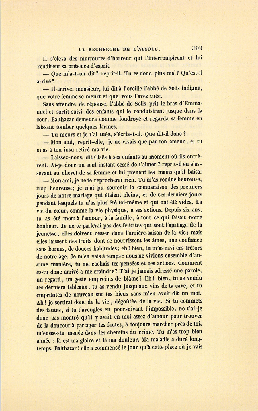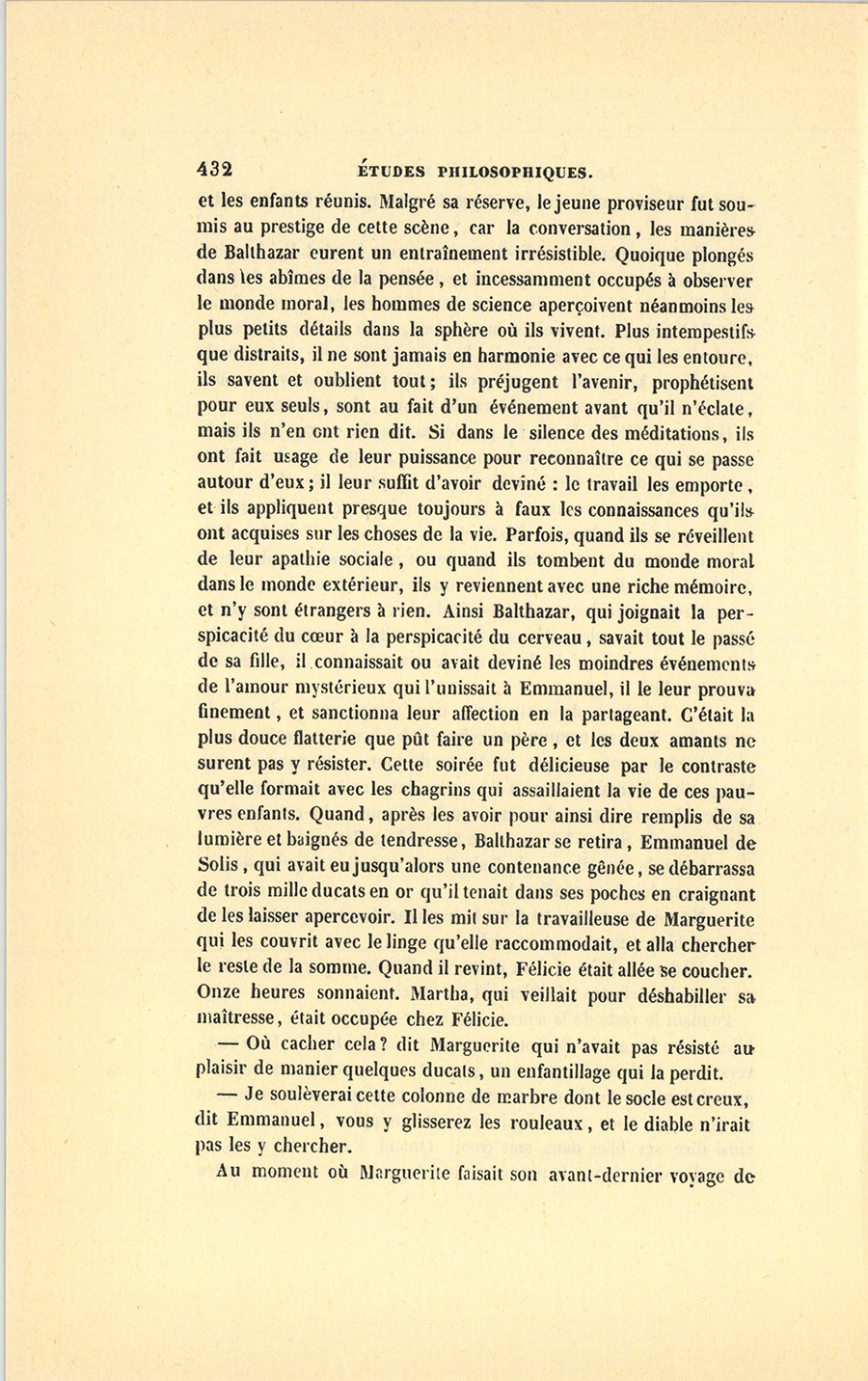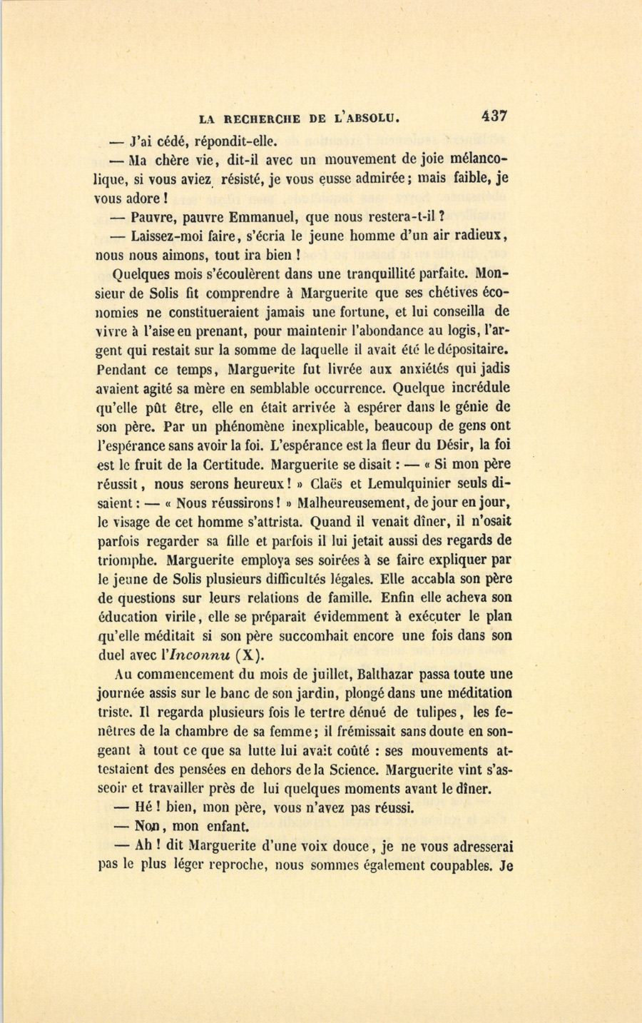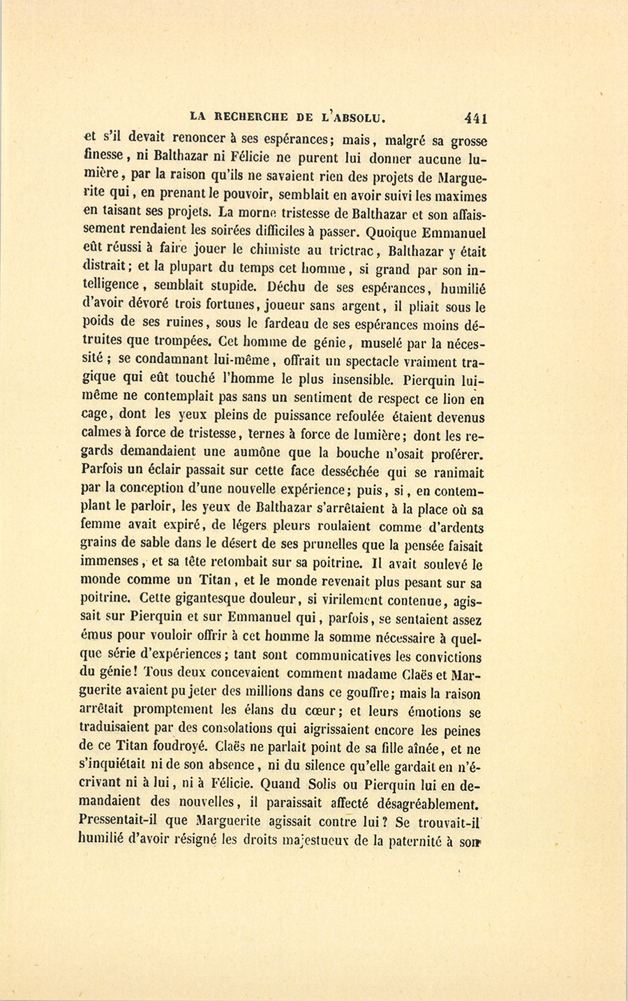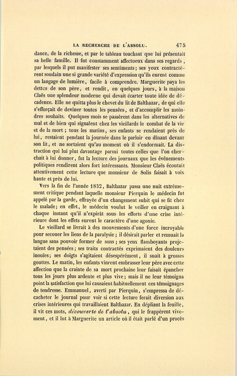 Le vieillard se livrait à des mouvements d’une force incroyable pour secouer les liens de la paralysie ; il désirait parler et remuait la langue sans pouvoir former de sons ; ses yeux flamboyants projetaient des pensées ; ses traits contractés exprimaient des douleurs inouïes ; ses doigts s’agitaient désespérément, il suait à grosses gouttes. Le matin, les enfants vinrent embrasser leur père avec cette affection que la crainte de sa mort prochaine leur faisait épancher tous les jours plus ardente et plus vive ; mais il ne leur témoigna point la satisfaction que lui causaient habituellement ces témoignages de tendresse. Emmanuel, averti par Pierquin, s’empressa de décacheter le journal pour voir si cette lecture ferait diversion aux crises intérieures qui travaillaient Balthazar. En dépliant la feuille, il vit ces mots, découverte de l’absolu, qui le frappèrent vivement, et il lut à Marguerite un article où il était parlé d’un procès {p. 476} relatif à la vente qu’un célèbre mathématicien polonais avait faite de l’Absolu. Quoique Emmanuel lût tout bas l’annonce du fait à Marguerite qui le pria de passer l’article, Balthazar avait entendu.