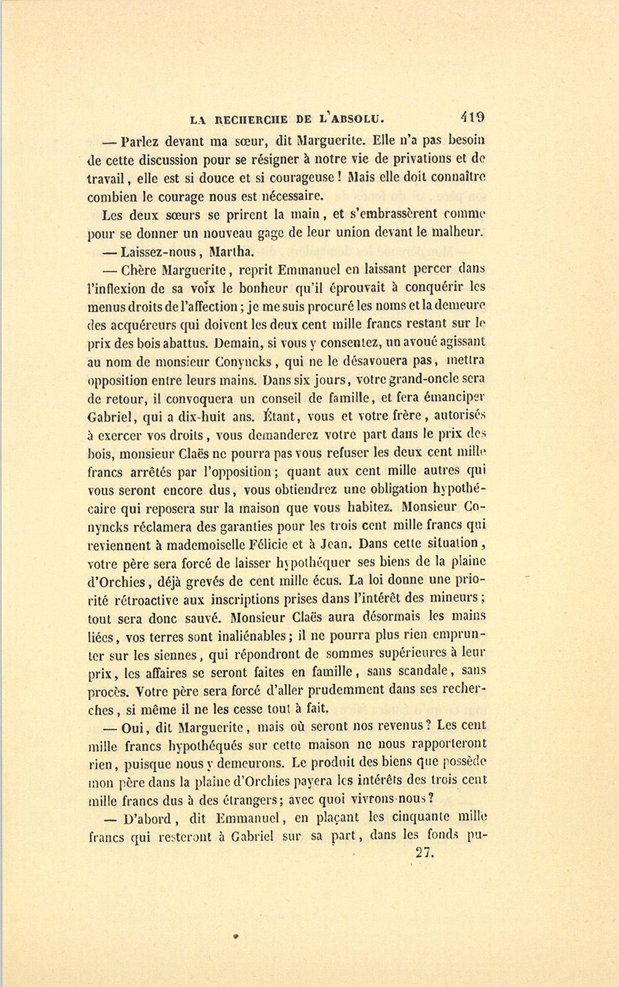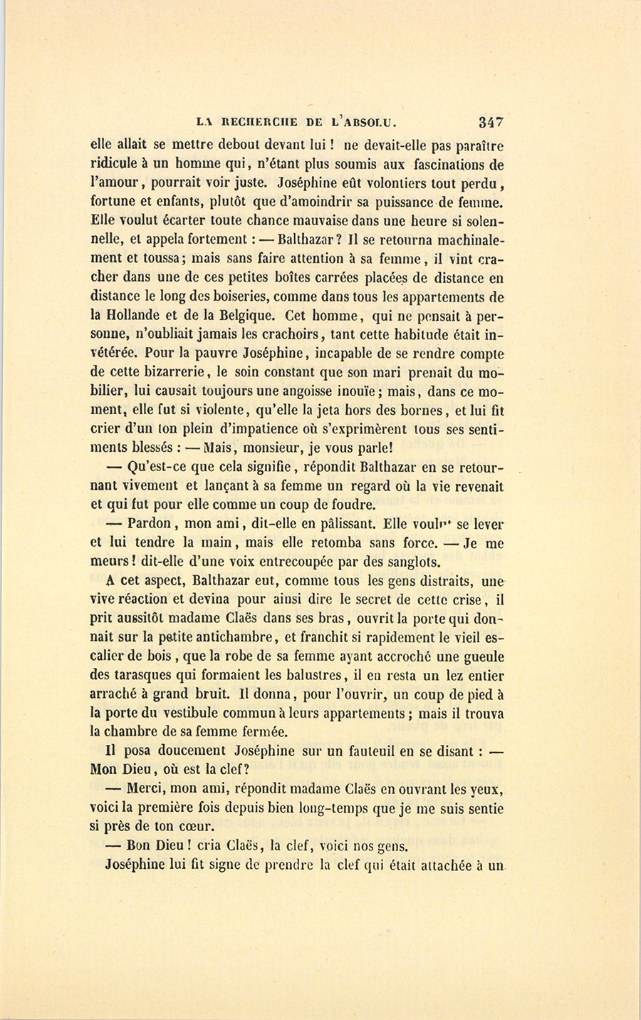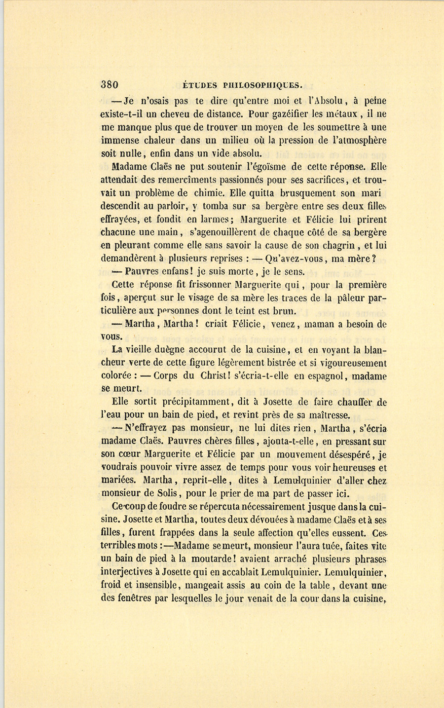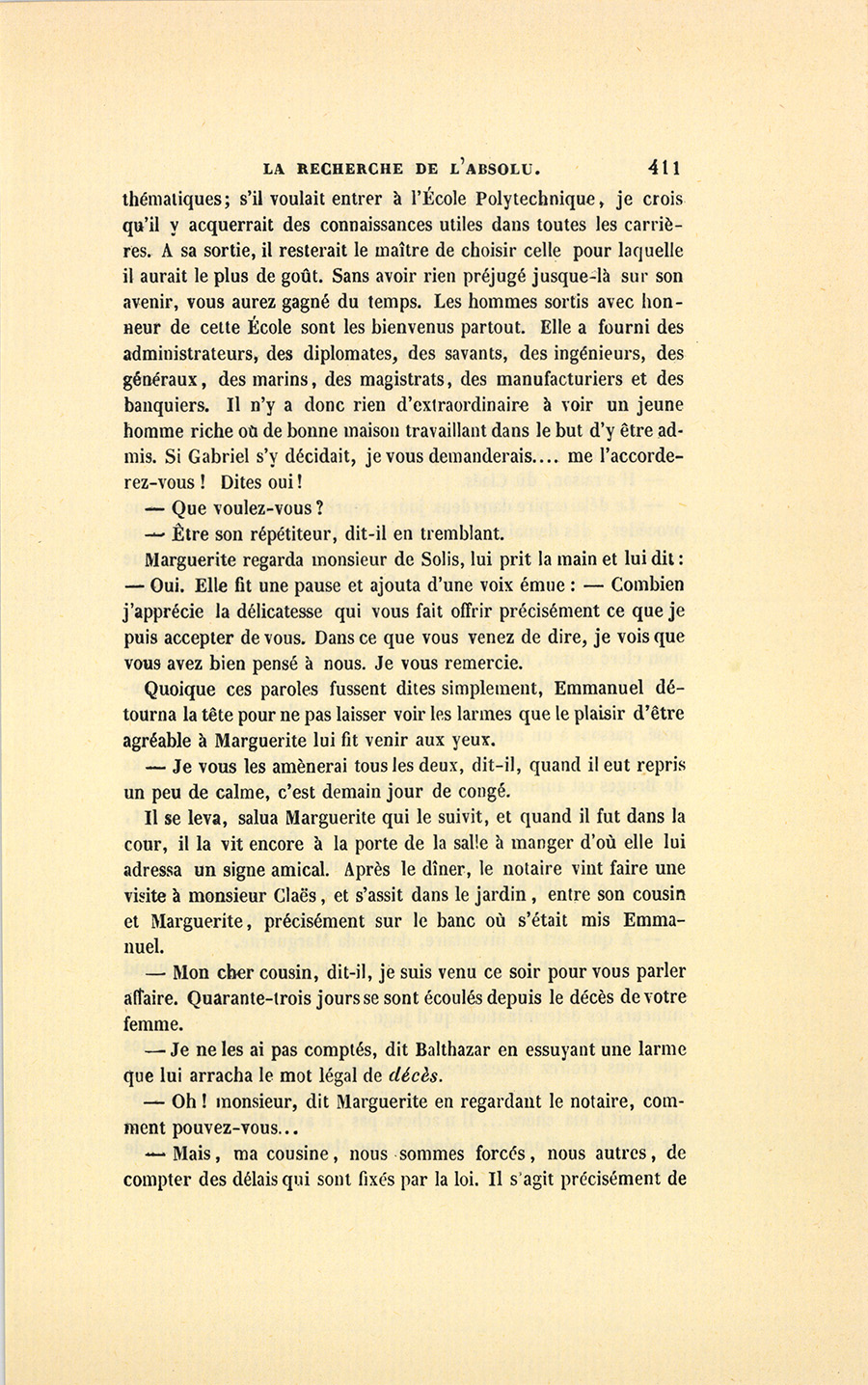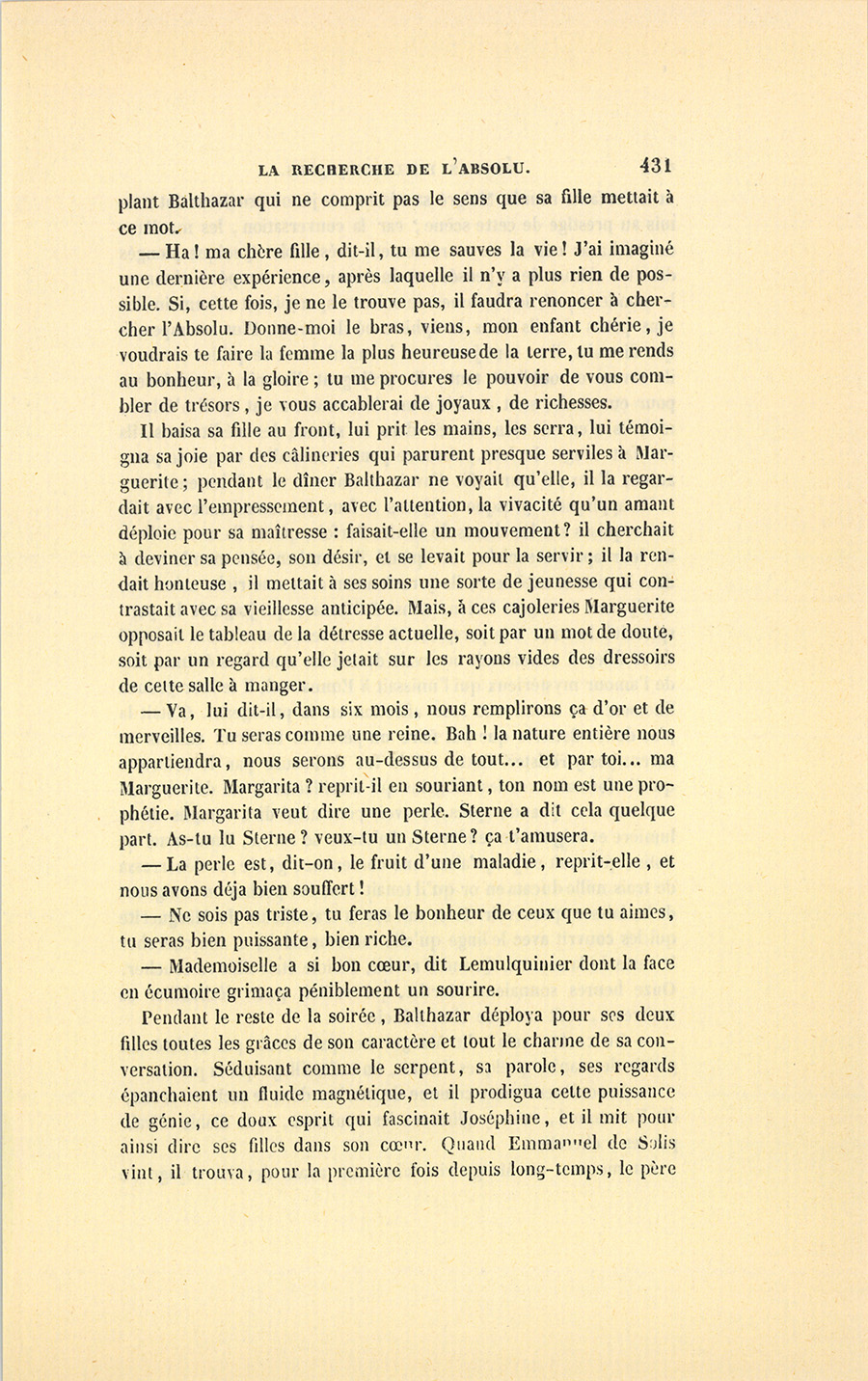 Le vieillard se livrait à des mouvements d’une force incroyable pour secouer les liens de la paralysie ; il désirait parler et remuait la langue sans pouvoir former de sons ; ses yeux flamboyants projetaient des pensées ; ses traits contractés exprimaient des douleurs inouïes ; ses doigts s’agitaient désespérément, il suait à grosses gouttes. Le matin, les enfants vinrent embrasser leur père avec cette affection que la crainte de sa mort prochaine leur faisait épancher tous les jours plus ardente et plus vive ; mais il ne leur témoigna point la satisfaction que lui causaient habituellement ces témoignages de tendresse. Emmanuel, averti par Pierquin, s’empressa de décacheter le journal pour voir si cette lecture ferait diversion aux crises intérieures qui travaillaient Balthazar. En dépliant la feuille, il vit ces mots, découverte de l’absolu, qui le frappèrent vivement, et il lut à Marguerite un article où il était parlé d’un procès {p. 476} relatif à la vente qu’un célèbre mathématicien polonais avait faite de l’Absolu. Quoique Emmanuel lût tout bas l’annonce du fait à Marguerite qui le pria de passer l’article, Balthazar avait entendu.