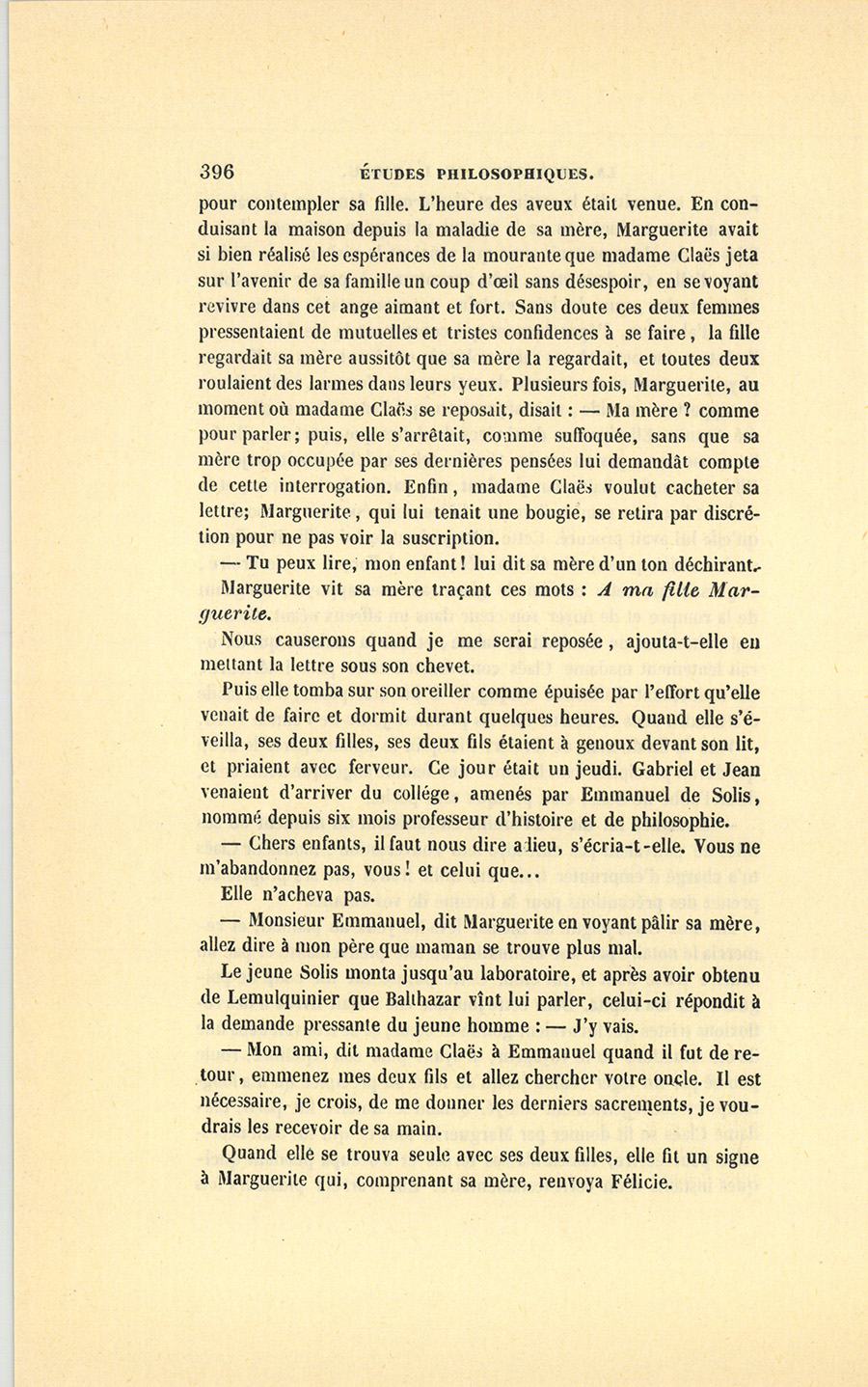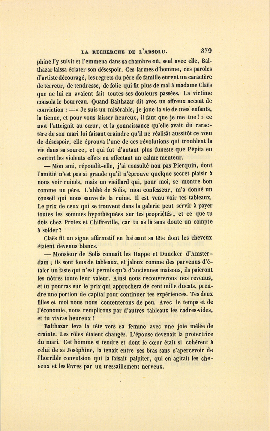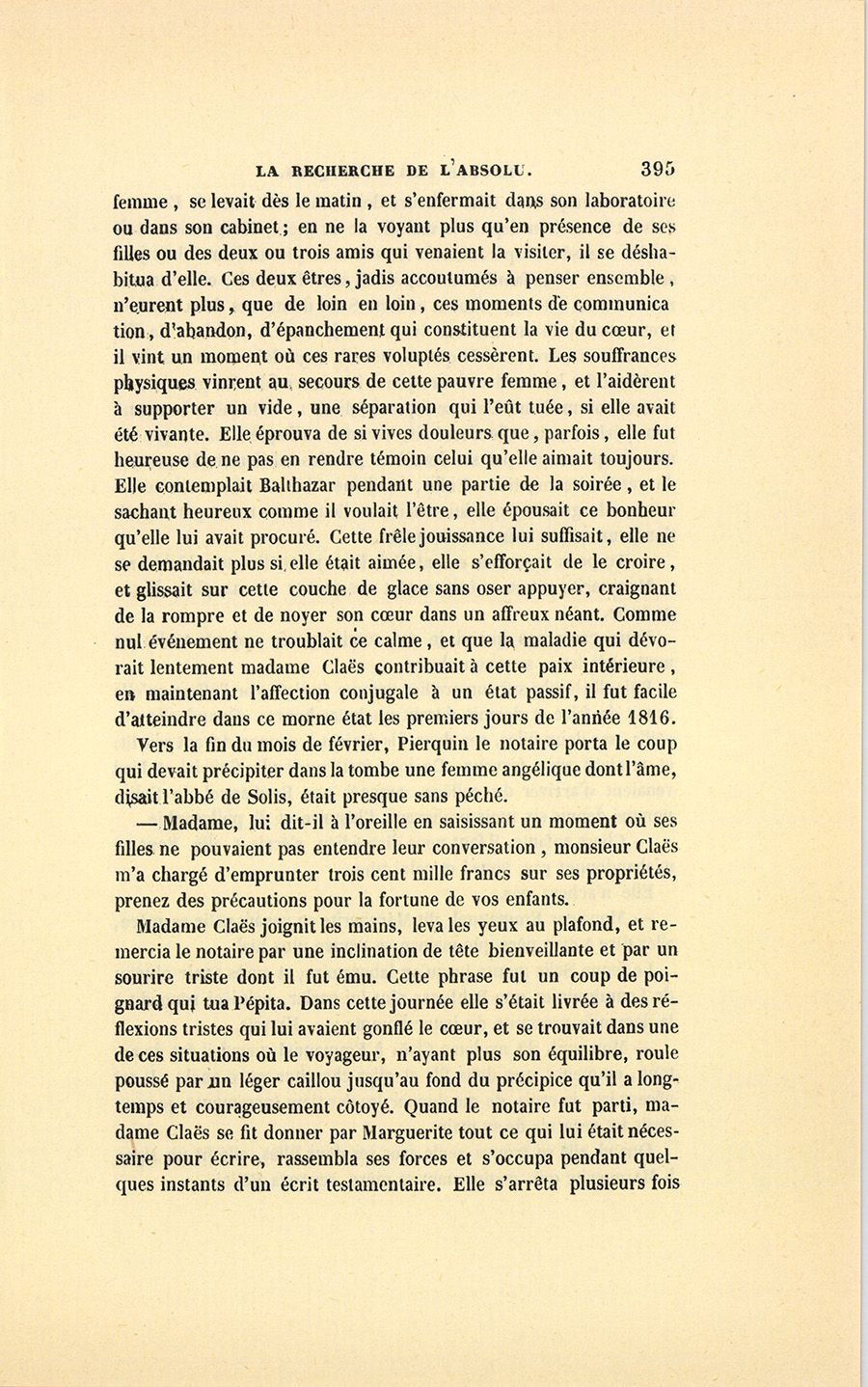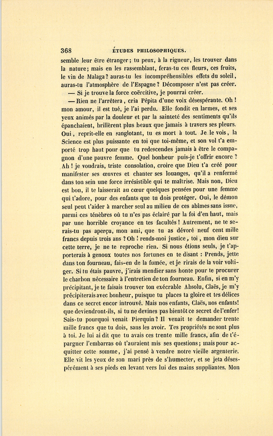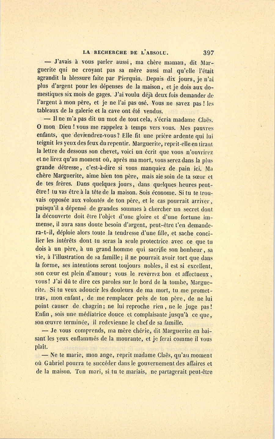 Le vieillard se livrait à des mouvements d’une force incroyable pour secouer les liens de la paralysie ; il désirait parler et remuait la langue sans pouvoir former de sons ; ses yeux flamboyants projetaient des pensées ; ses traits contractés exprimaient des douleurs inouïes ; ses doigts s’agitaient désespérément, il suait à grosses gouttes. Le matin, les enfants vinrent embrasser leur père avec cette affection que la crainte de sa mort prochaine leur faisait épancher tous les jours plus ardente et plus vive ; mais il ne leur témoigna point la satisfaction que lui causaient habituellement ces témoignages de tendresse. Emmanuel, averti par Pierquin, s’empressa de décacheter le journal pour voir si cette lecture ferait diversion aux crises intérieures qui travaillaient Balthazar. En dépliant la feuille, il vit ces mots, découverte de l’absolu, qui le frappèrent vivement, et il lut à Marguerite un article où il était parlé d’un procès {p. 476} relatif à la vente qu’un célèbre mathématicien polonais avait faite de l’Absolu. Quoique Emmanuel lût tout bas l’annonce du fait à Marguerite qui le pria de passer l’article, Balthazar avait entendu.