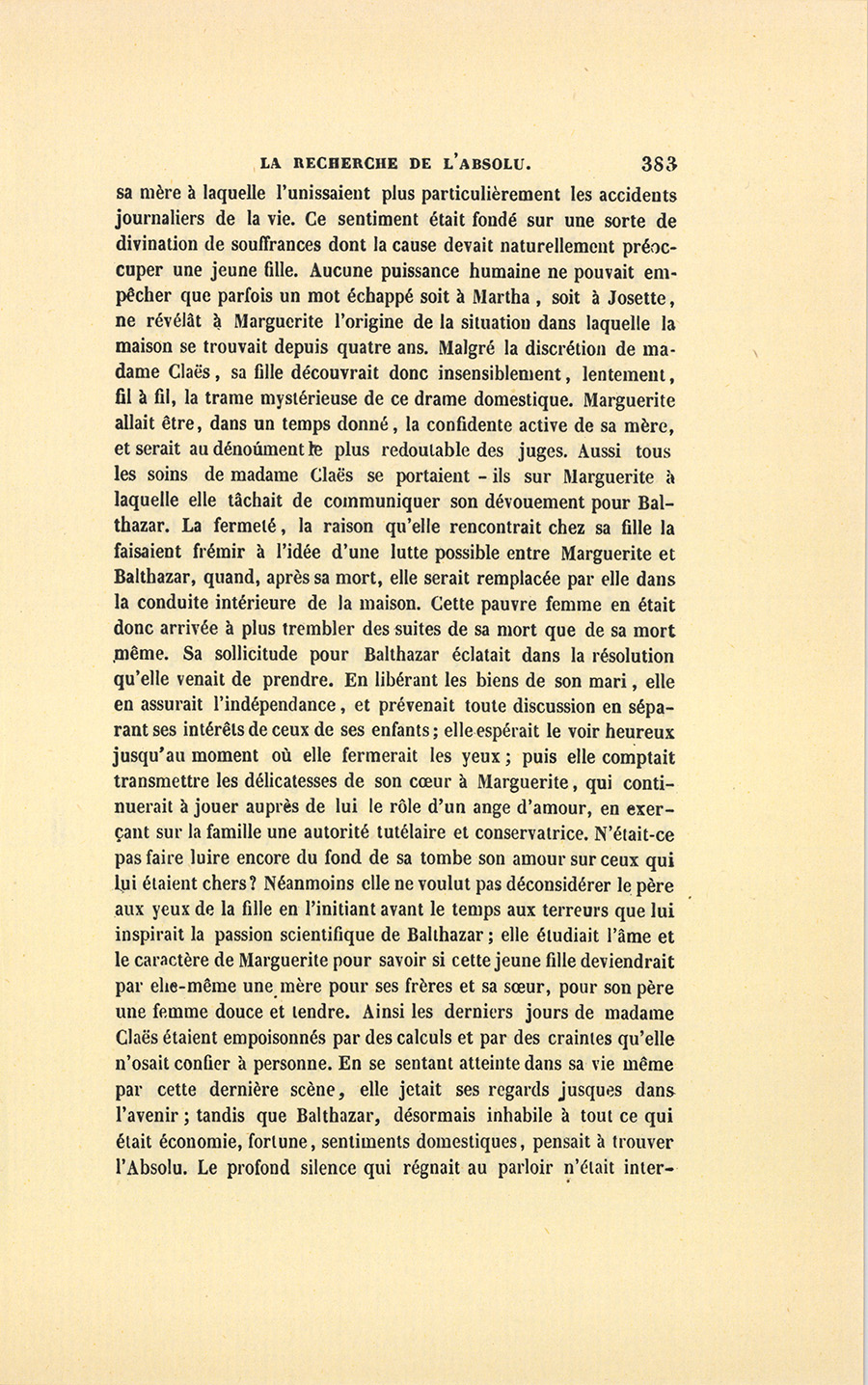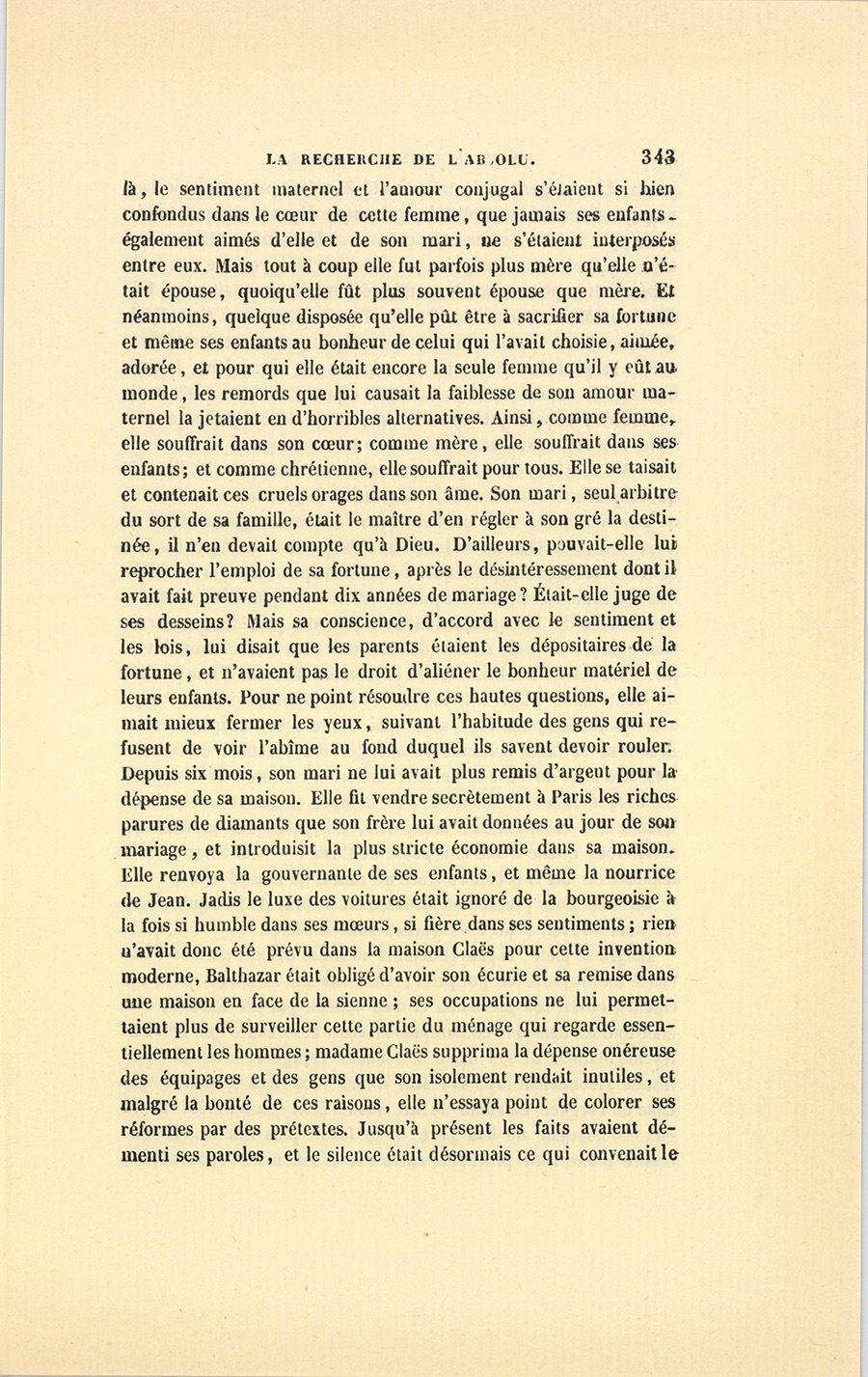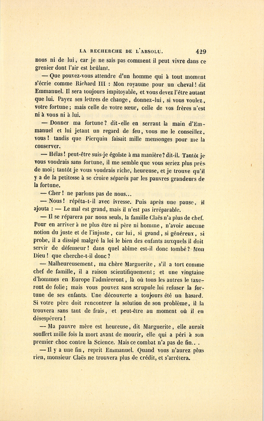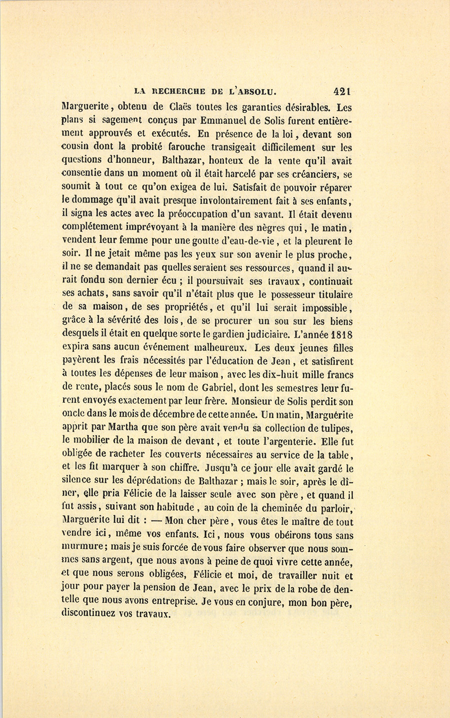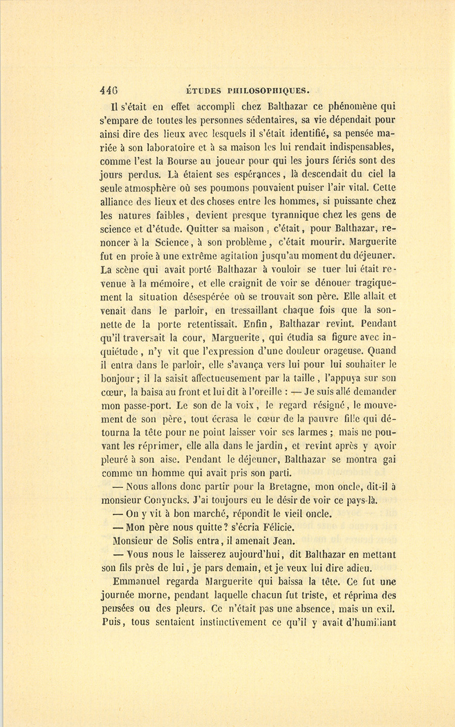 Le vieillard se livrait à des mouvements d’une force incroyable pour secouer les liens de la paralysie ; il désirait parler et remuait la langue sans pouvoir former de sons ; ses yeux flamboyants projetaient des pensées ; ses traits contractés exprimaient des douleurs inouïes ; ses doigts s’agitaient désespérément, il suait à grosses gouttes. Le matin, les enfants vinrent embrasser leur père avec cette affection que la crainte de sa mort prochaine leur faisait épancher tous les jours plus ardente et plus vive ; mais il ne leur témoigna point la satisfaction que lui causaient habituellement ces témoignages de tendresse. Emmanuel, averti par Pierquin, s’empressa de décacheter le journal pour voir si cette lecture ferait diversion aux crises intérieures qui travaillaient Balthazar. En dépliant la feuille, il vit ces mots, découverte de l’absolu, qui le frappèrent vivement, et il lut à Marguerite un article où il était parlé d’un procès {p. 476} relatif à la vente qu’un célèbre mathématicien polonais avait faite de l’Absolu. Quoique Emmanuel lût tout bas l’annonce du fait à Marguerite qui le pria de passer l’article, Balthazar avait entendu.